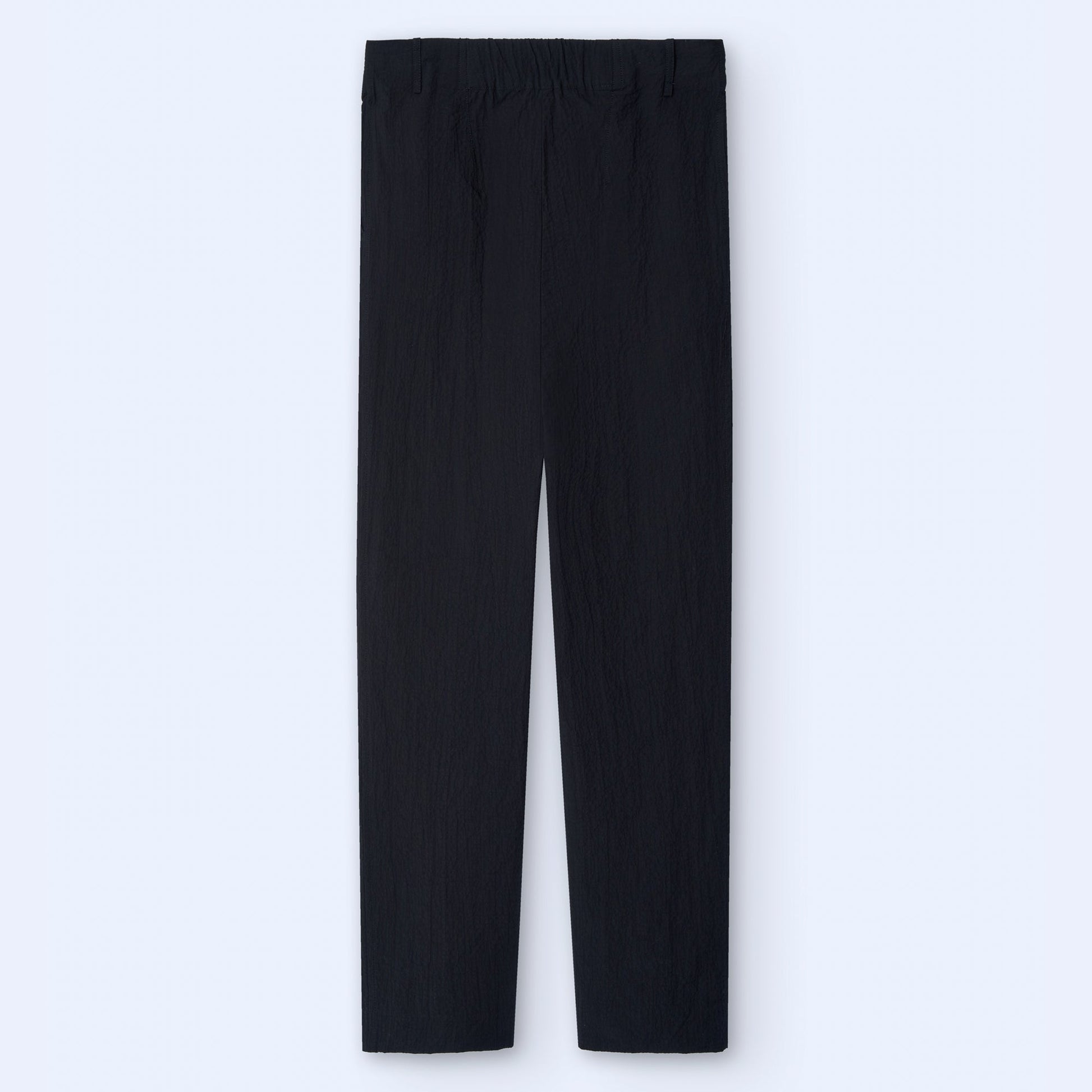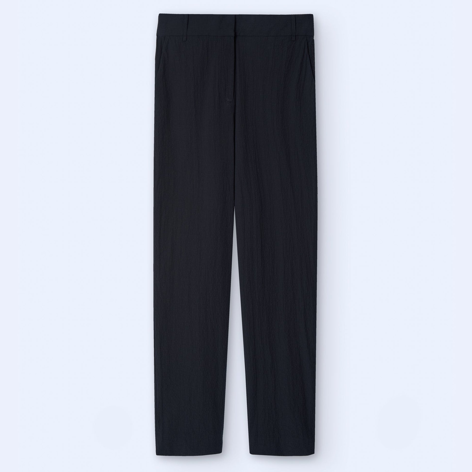 Straight and wide leg. Back belt loop fastening. Side piped pockets. Seersucker in ethically grown cotton.