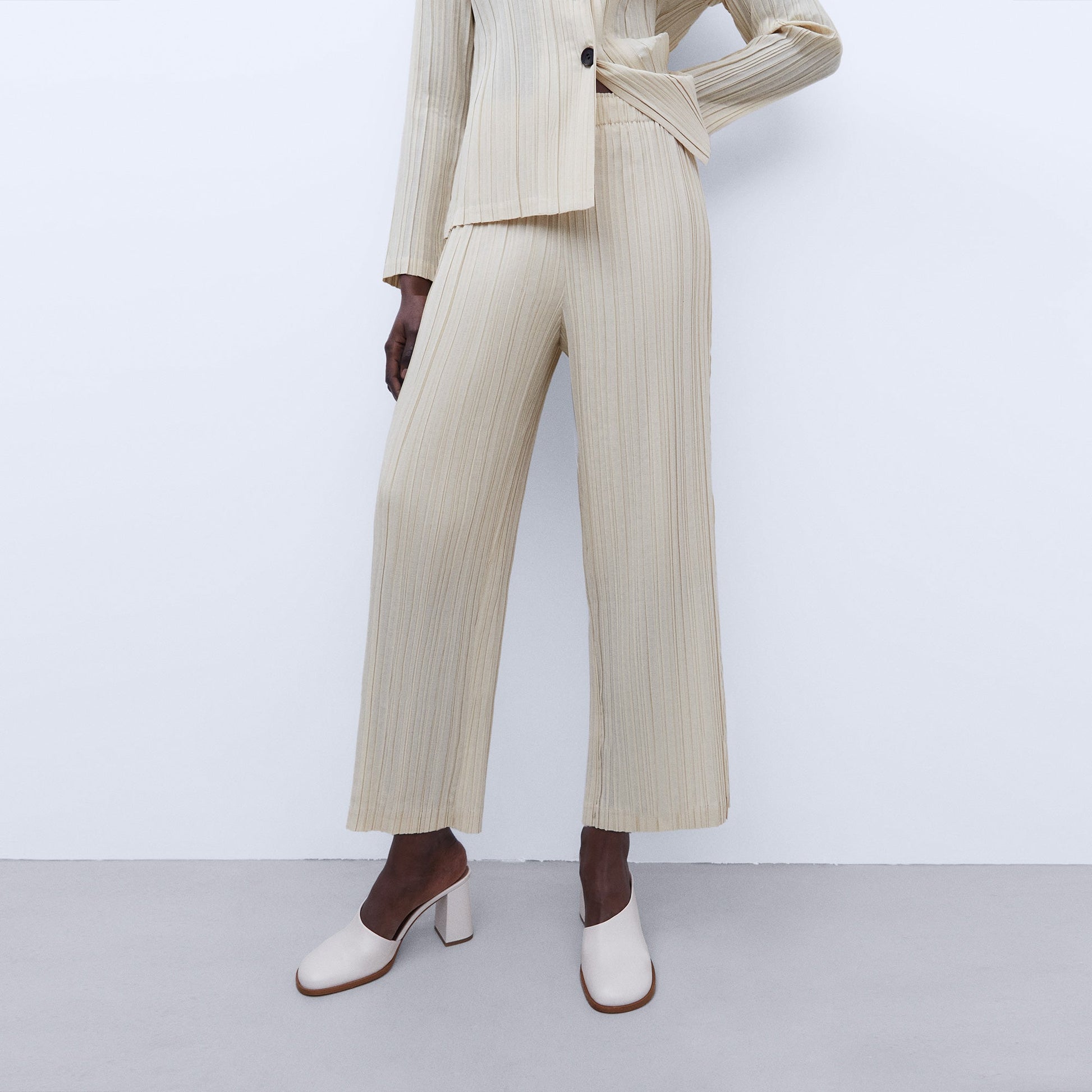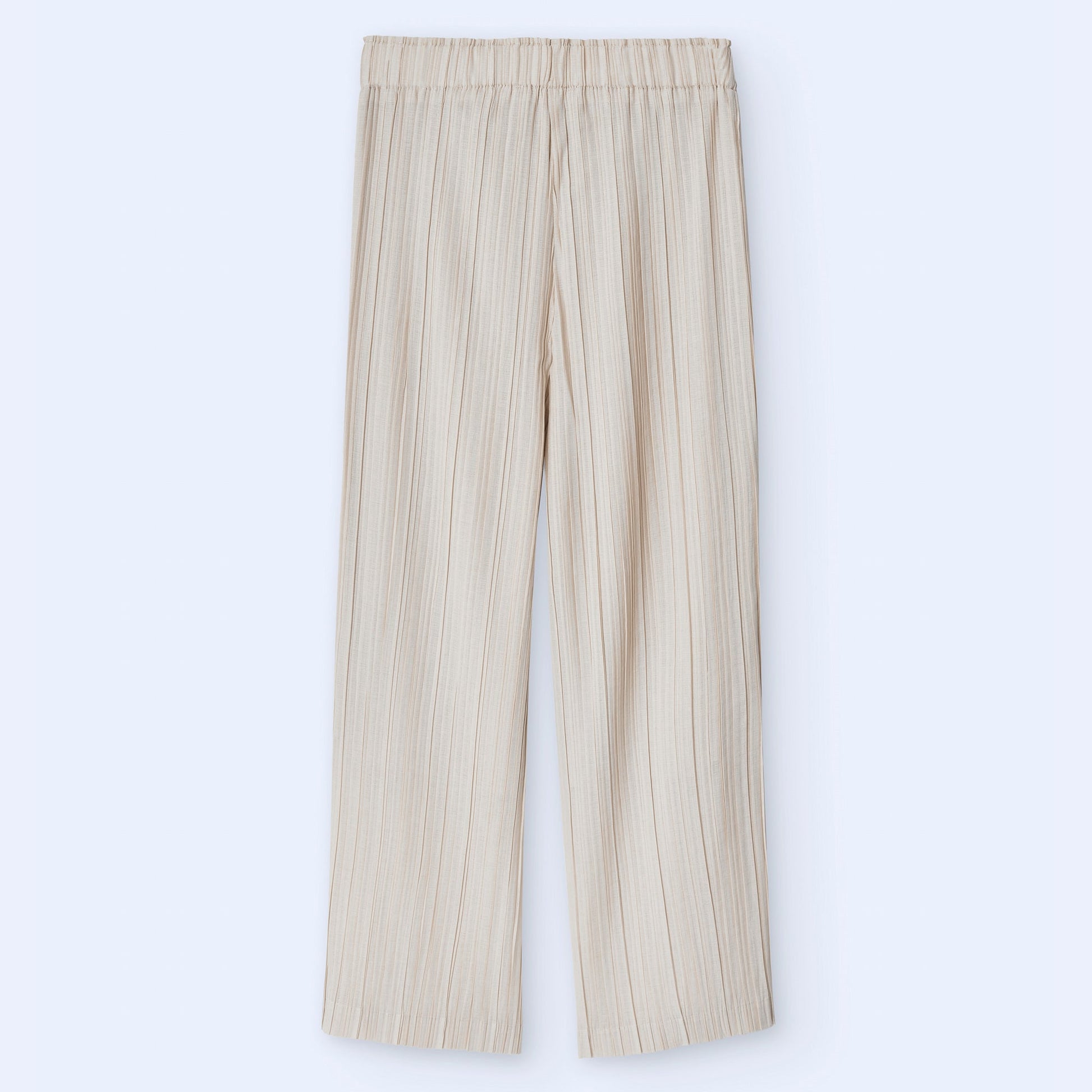 These crinkle trousers are a stylish addition to your wardrobe. They feature an elastic waistband for a comfortable fit and are ankle length with a straight hem. Perfect for both casual and formal occasions.