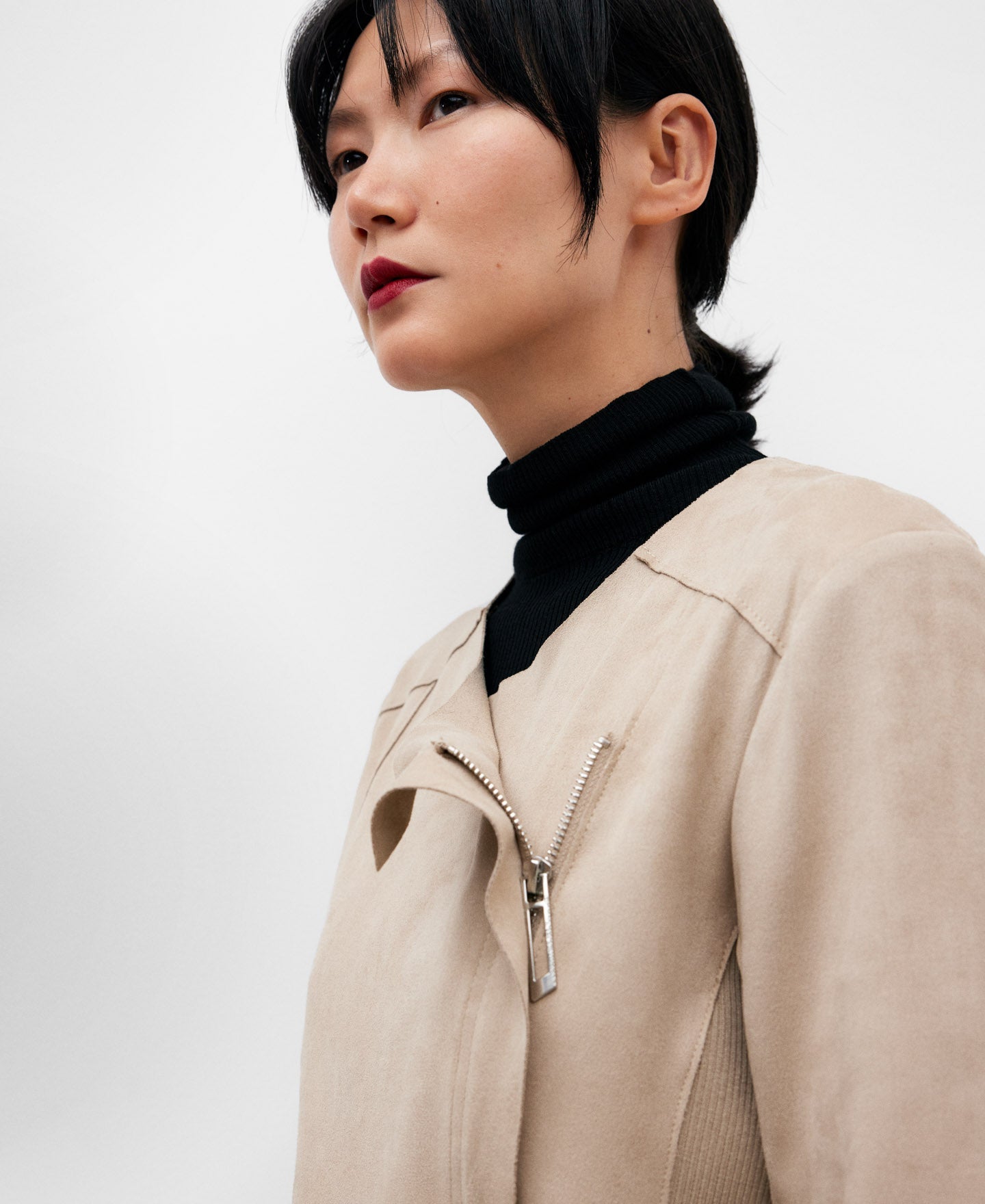 Description: Introducing the Stone Crew Neckline Biker Jacket for women by Adolfo Dominguez. This exquisite piece is designed with a cross zip closure, adding a touch of edginess to your ensemble. The zip fastening at the wrists ensures a perfect fit, while the round hem adds a feminine touch. Elevate your style with this luxurious biker jacket that effortlessly combines fashion and functionality.