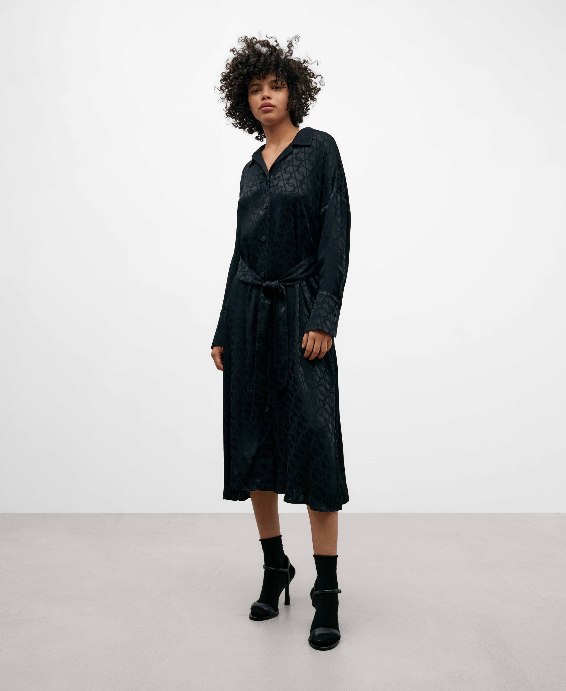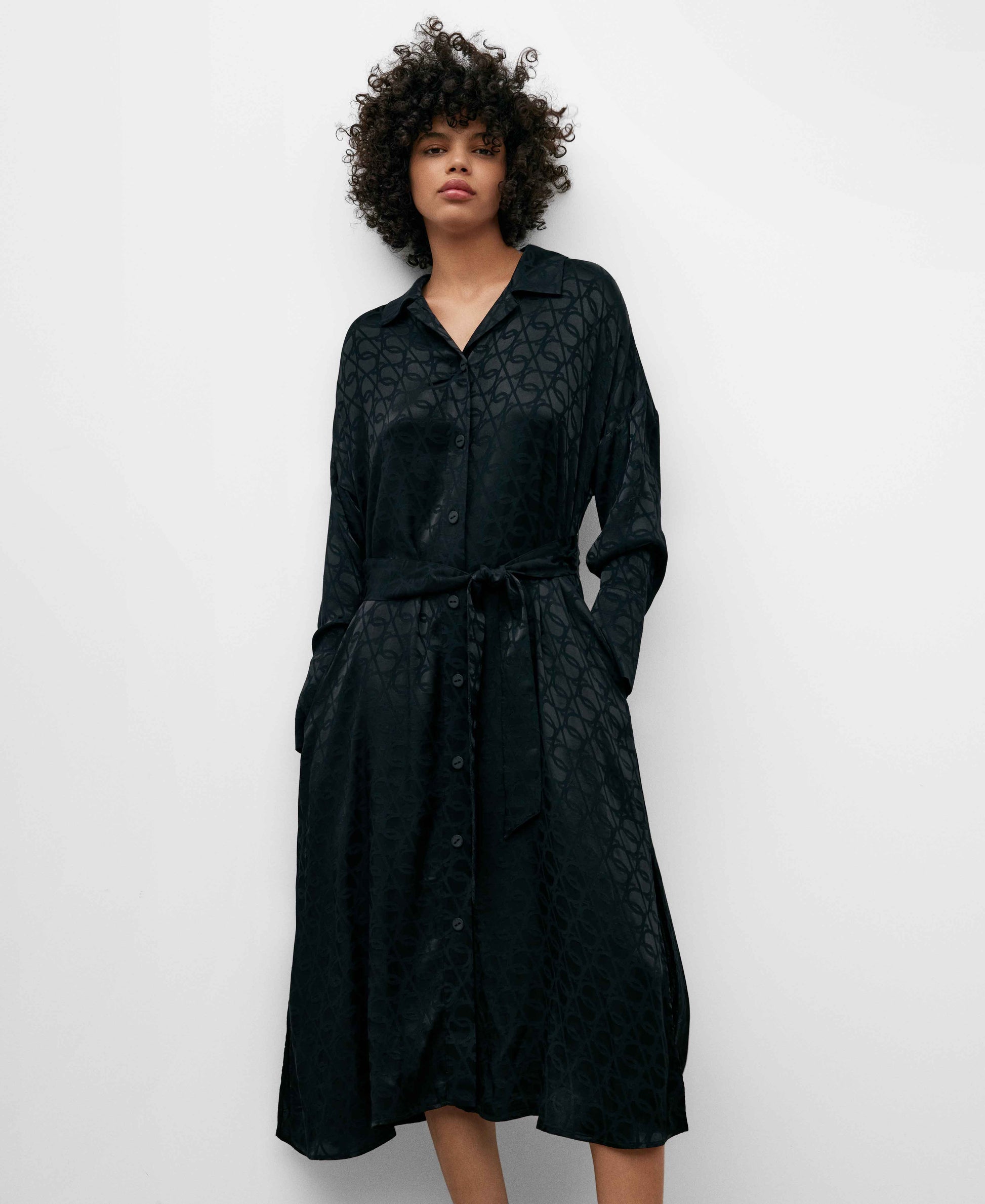 Introducing our exquisite Black Jacquard Dress by Adolfo Dominguez. This dress exudes elegance and sophistication, perfect for any occasion. Crafted with meticulous attention to detail, it features a shirt-like design with a touch of luxury. The dress showcases our iconic logo, adding a subtle yet stylish element. With long sleeves and a straight hem, it offers a timeless silhouette that flatters every figure. The midi length adds a touch of modernity, making it a versatile piece for both day and evening wear. Elevate your wardrobe with this stunning dress that effortlessly combines comfort and style.