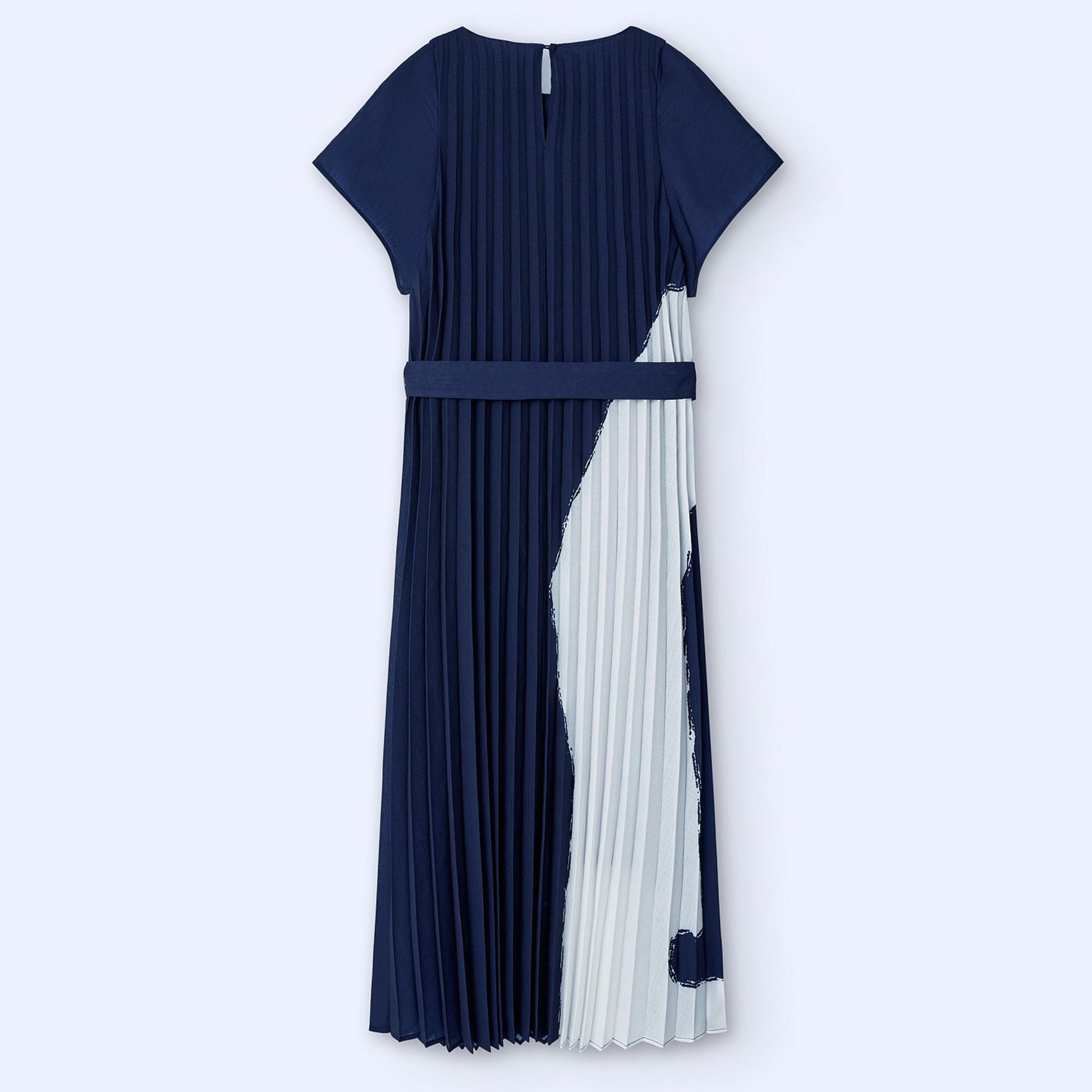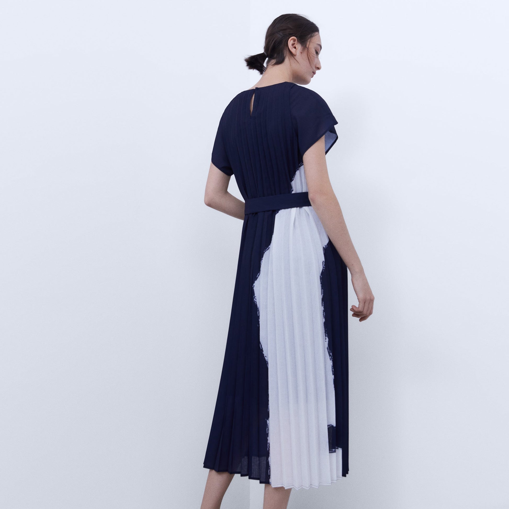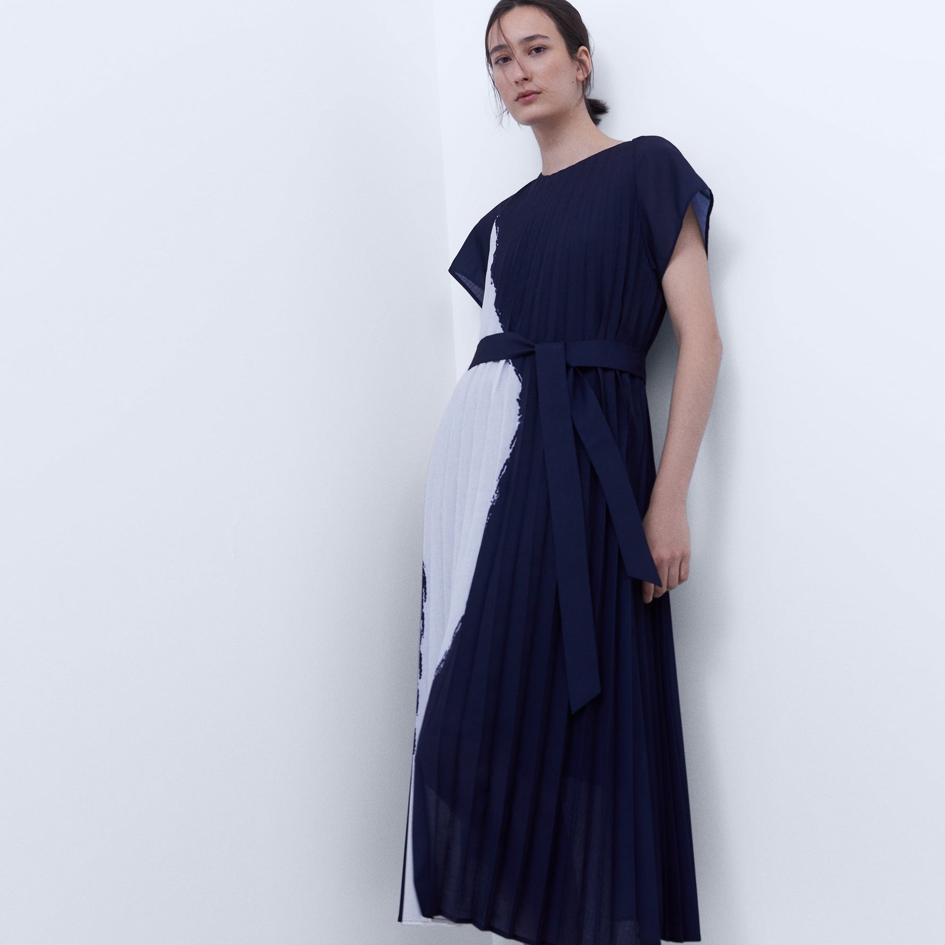 Introducing our stunning printed crinkle dress from Adolfo Dominguez. This dress features a round neckline and a button back fastening for easy wear. The short and wide sleeves add a touch of elegance, while the included belt cinches in the waist for a flattering fit. The hem is beautifully topstitched in a contrasting color, adding a unique and stylish detail to the dress.