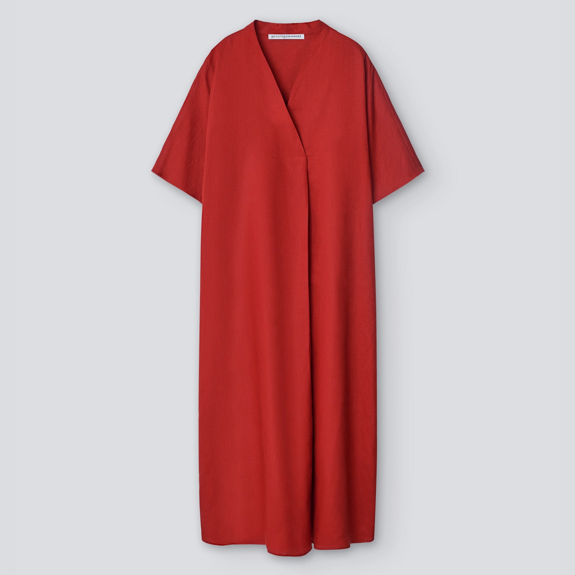 Linen Midi Terracotta Dress Woman. Short Sleeve. V-Neckline. Open Sides. Relaxed Fit.
