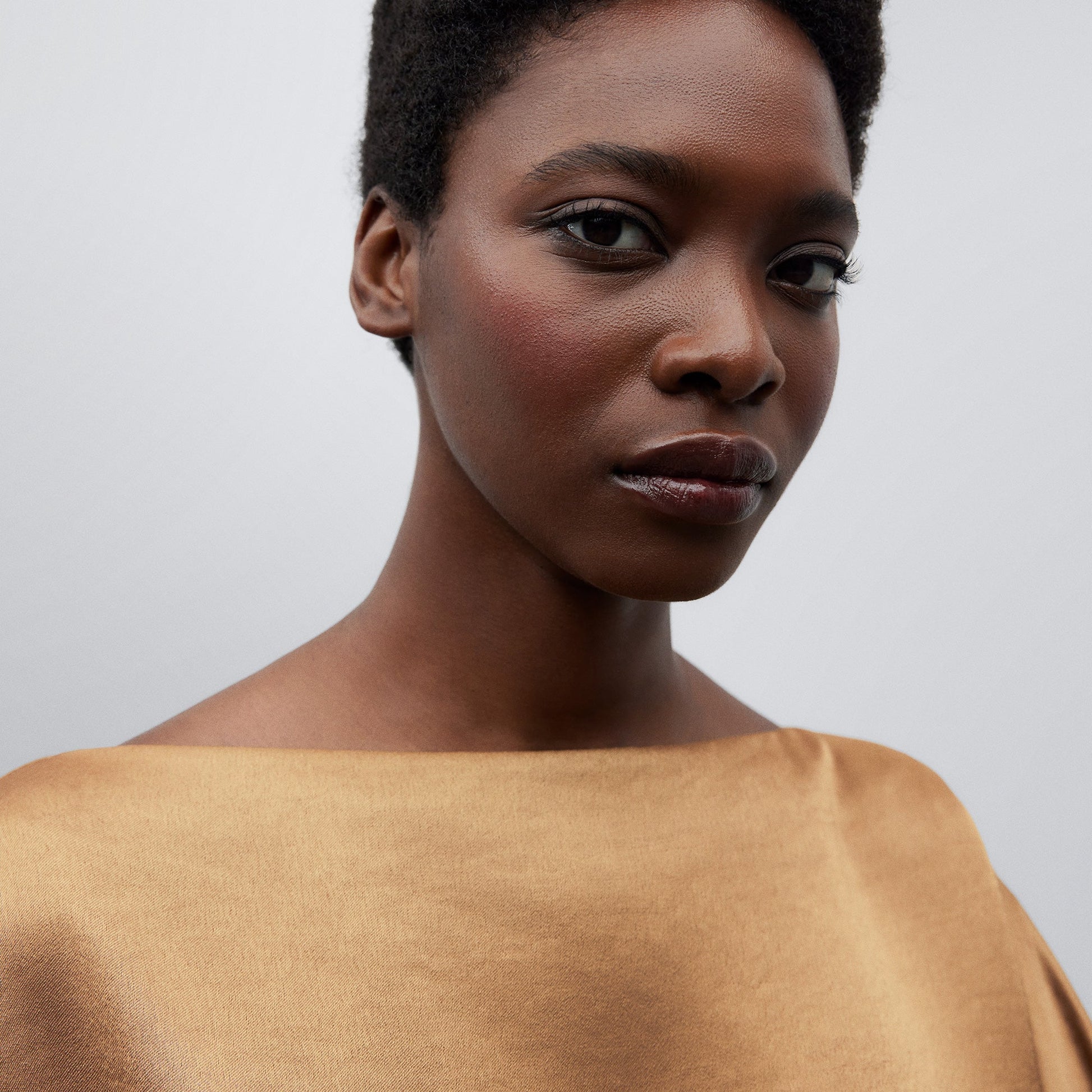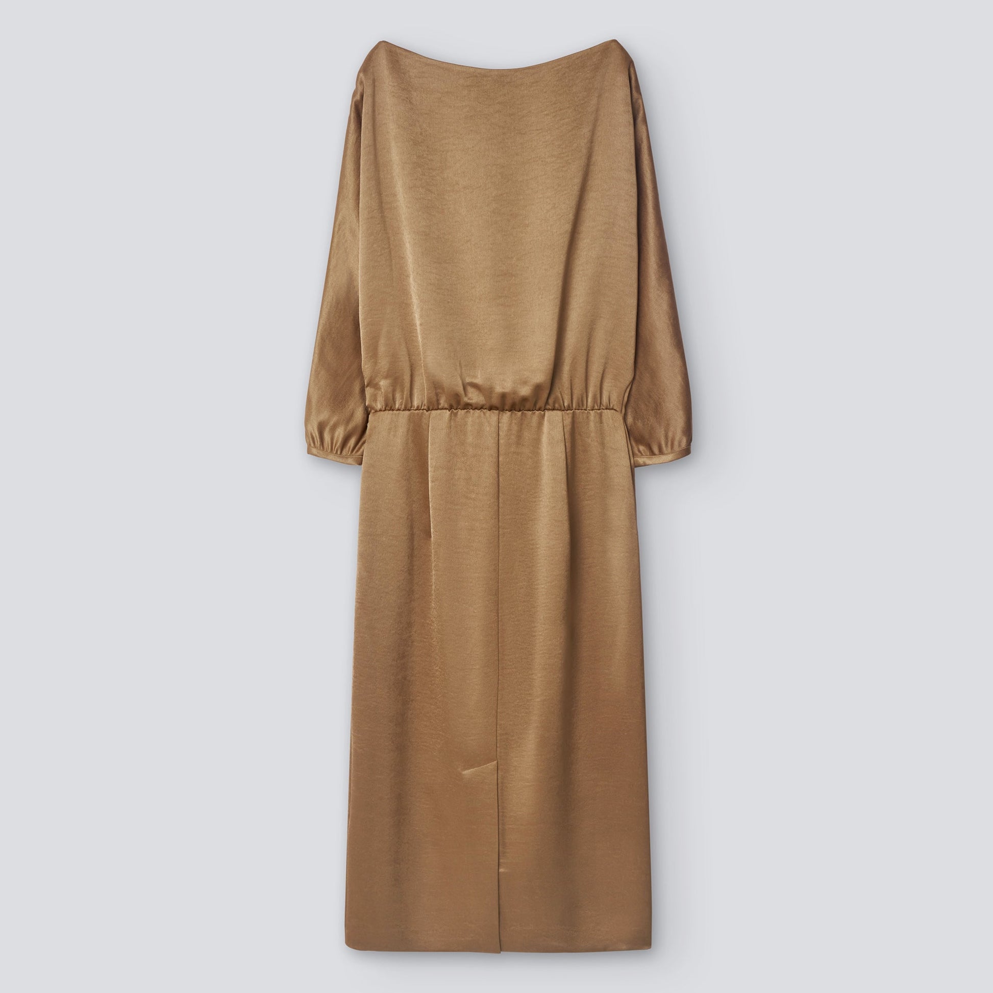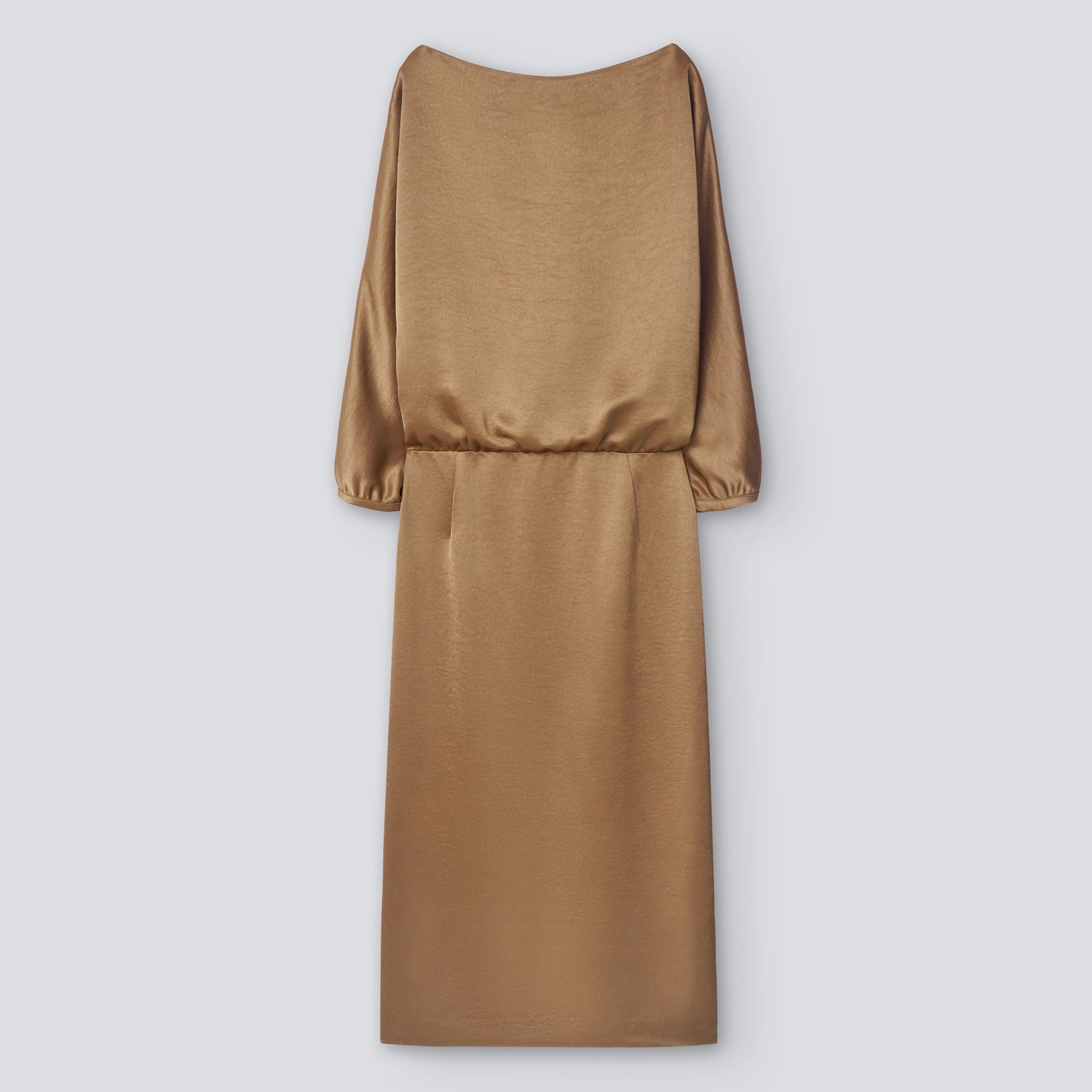 Recycled Polyester Camel Midi Dress Woman. Fitted Skirt. Puffy Body.