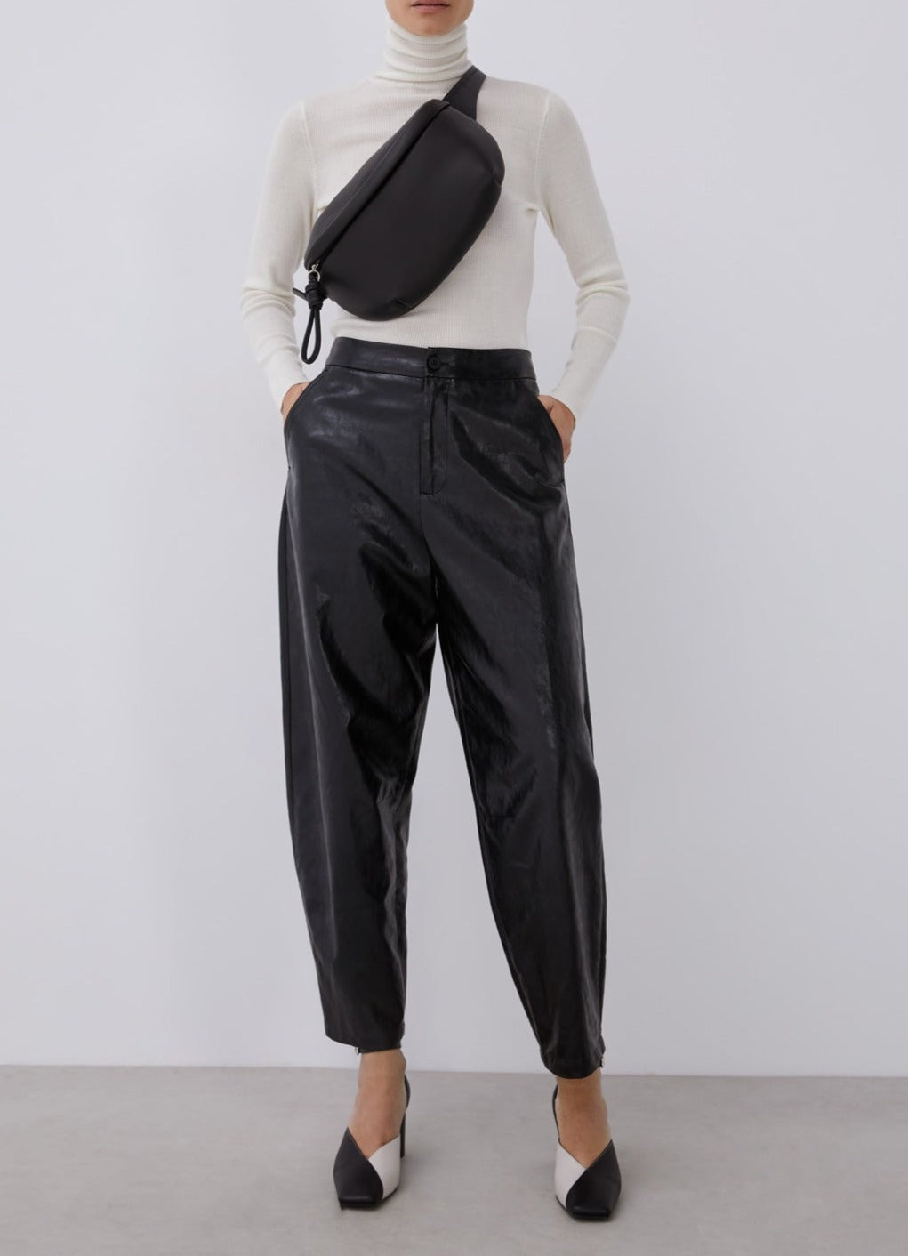 Black & white. Bovine leather & ovine leather. Squared toe & v-vamp. These shoes with solid heel are full of contrasts.