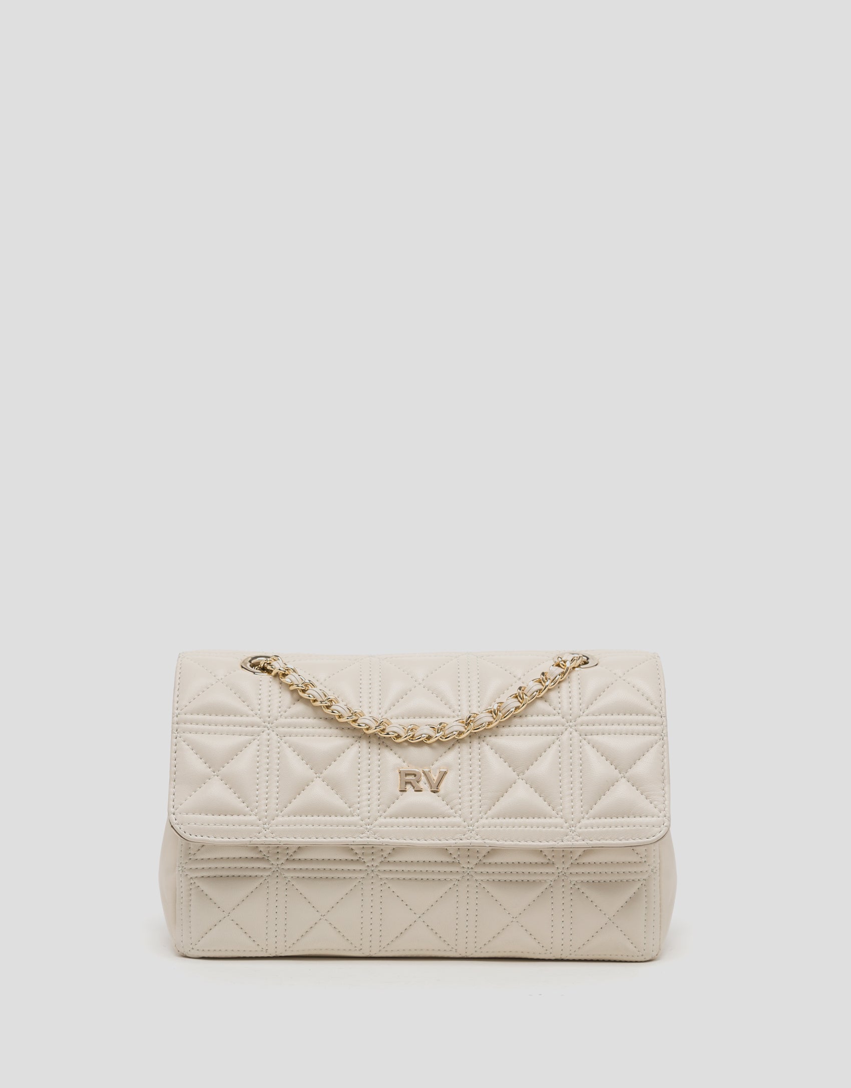 Medium bag in quilted leather with geometric design in raw color and closure with flap and magnet under flap. Metallic RV logo on front placket. Chiaro gold chain shoulder strap with matching interlaced leather and a small leather strap on the shoulder. Chain length of 130 cm. Lined interior with an open pocket in leather. Approximate measurements: 24 x 17 x 8 cm.