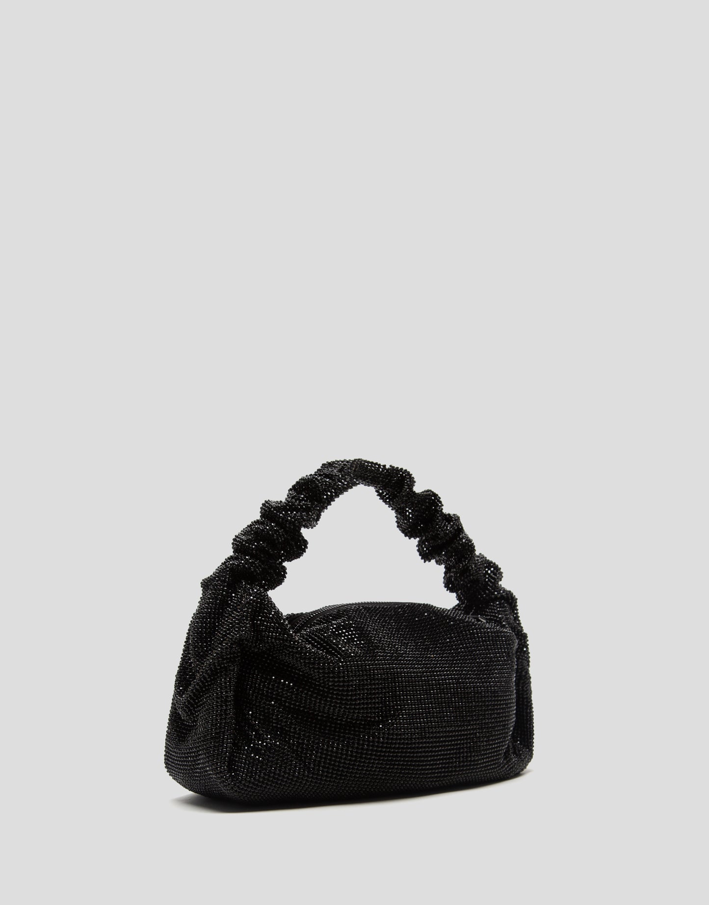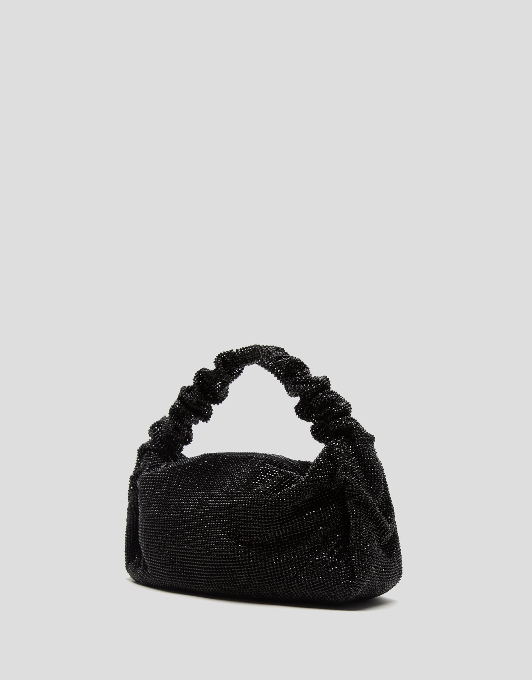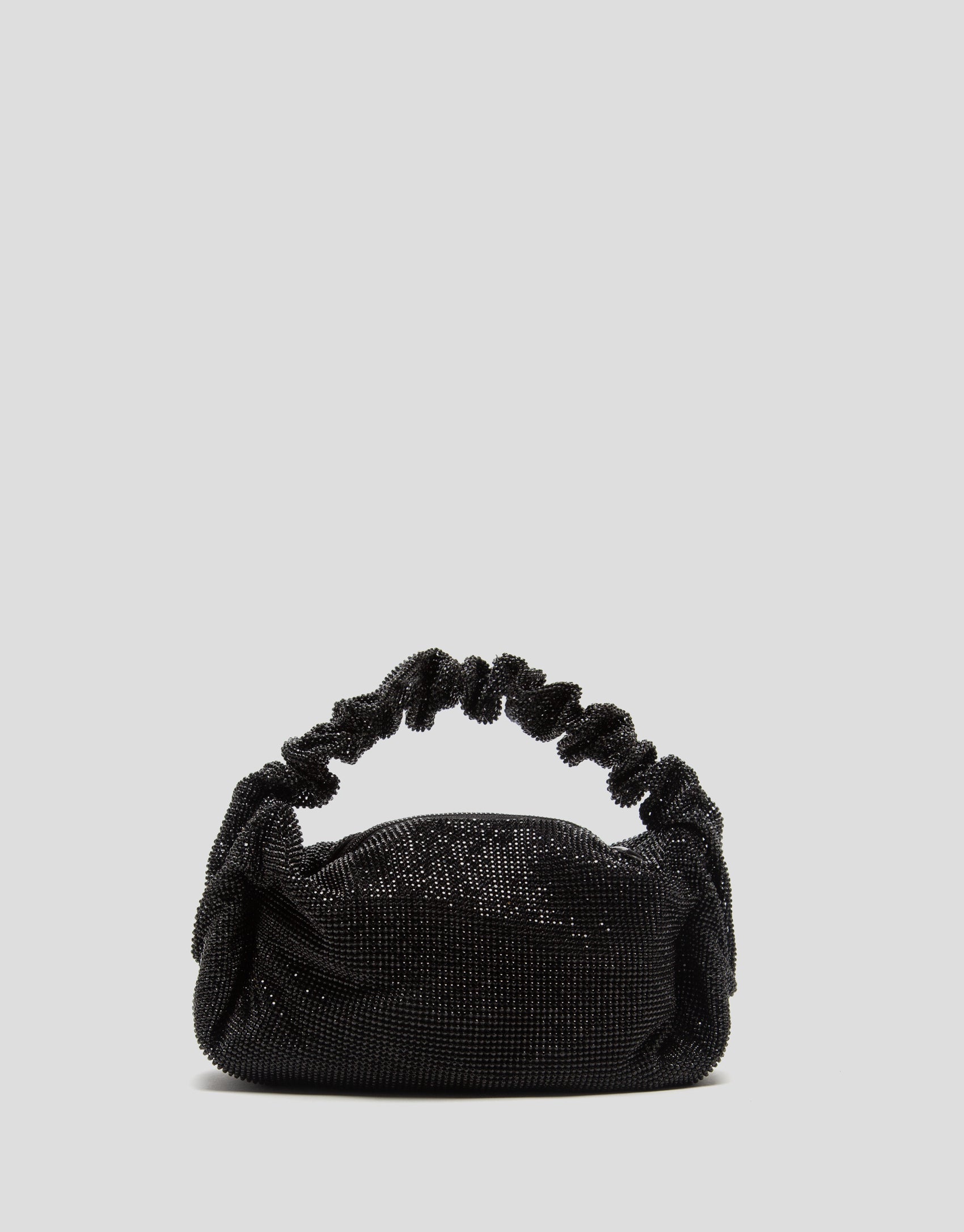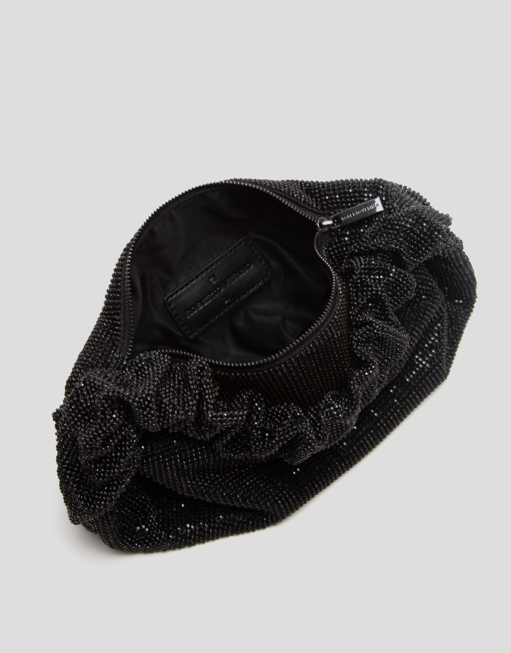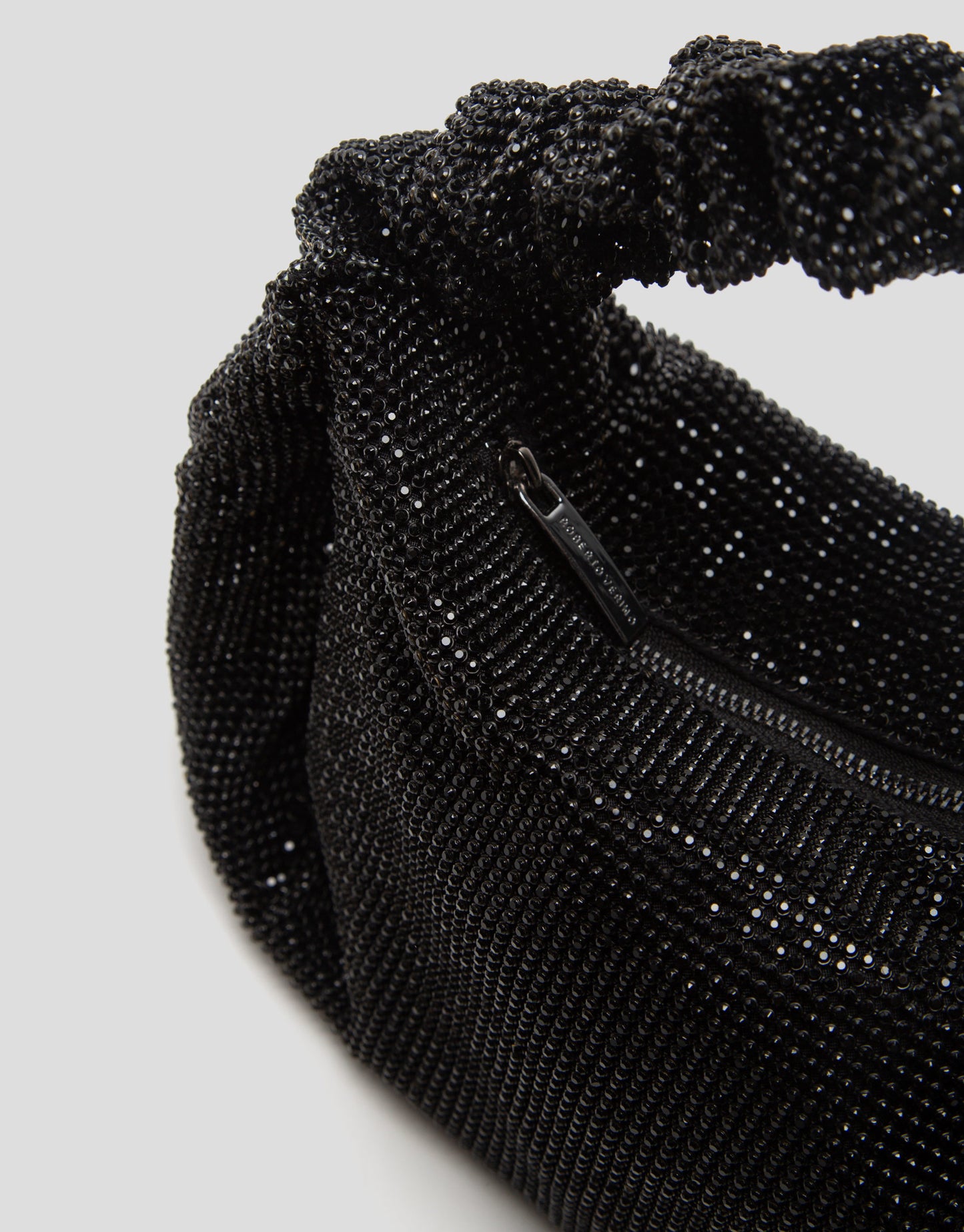 Handbag made of fabric with shiny crystal applications in black tones. Zip closure and lined interior. Metallic in black. Handle height: 13 cm. Approximate measurements: 21 x 13 x 10 cm