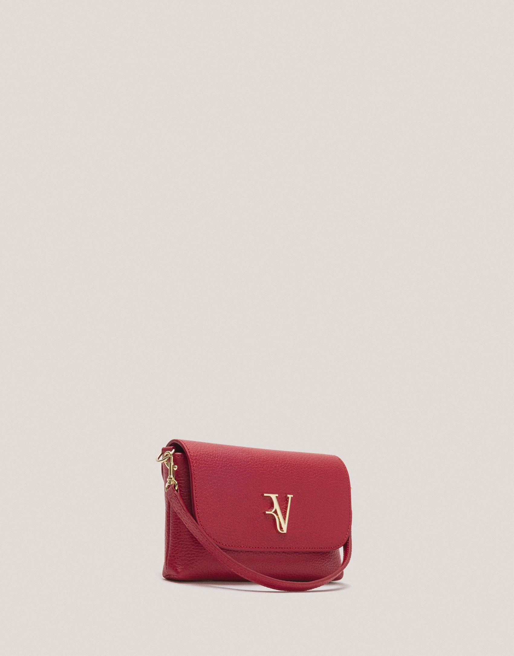 Lavendar, granulated leather, mini handbag with detachable handle and shoulder strap. Flap with metallic RV logo, clip closure and interior lining and compartments with card-holder pocket. Light gold metallic fixings. Handle 1 cm wide and 17 cm high and shoulder strap 1 cm wide and 119 cm long. Approximate size: 20 x 11 x 3 cm.