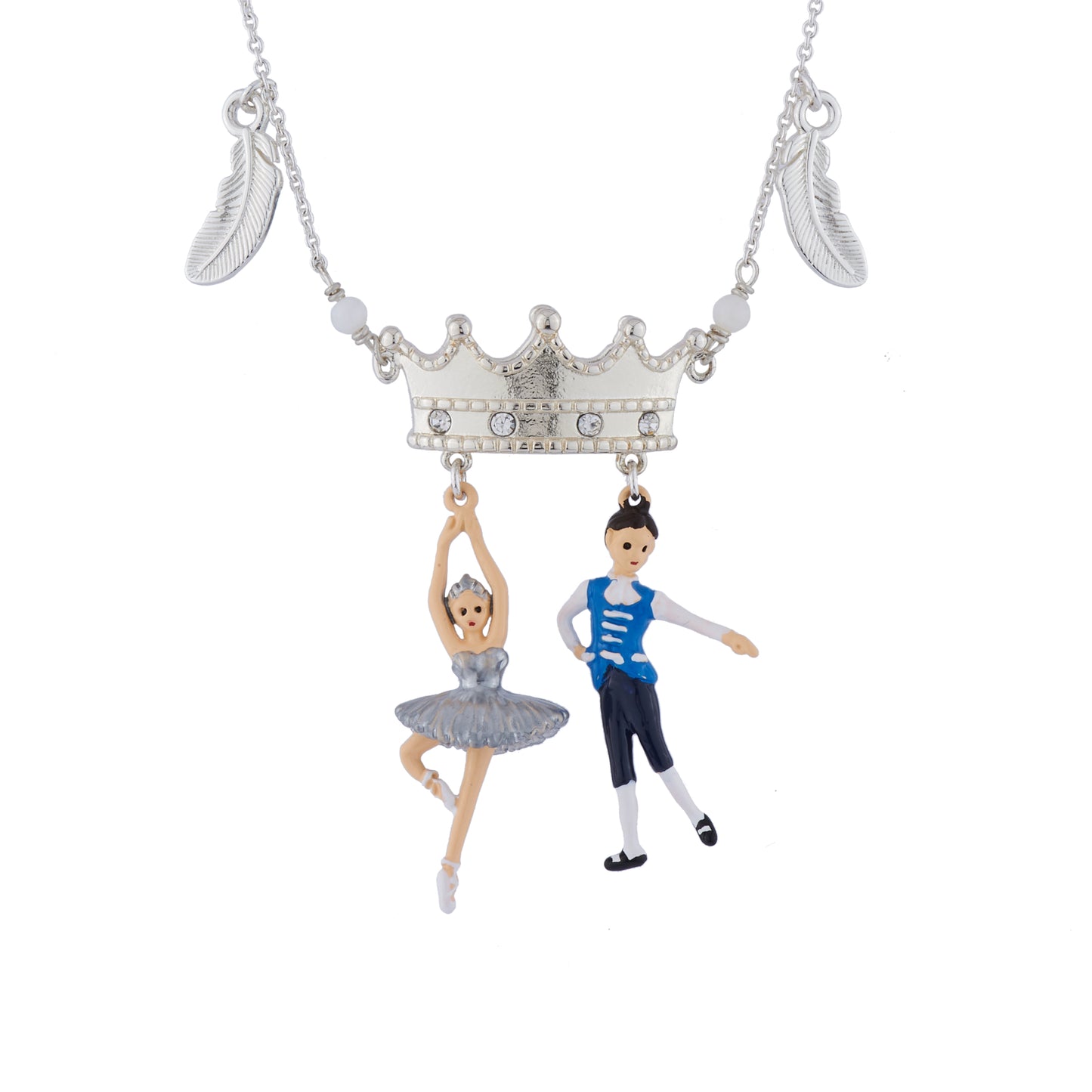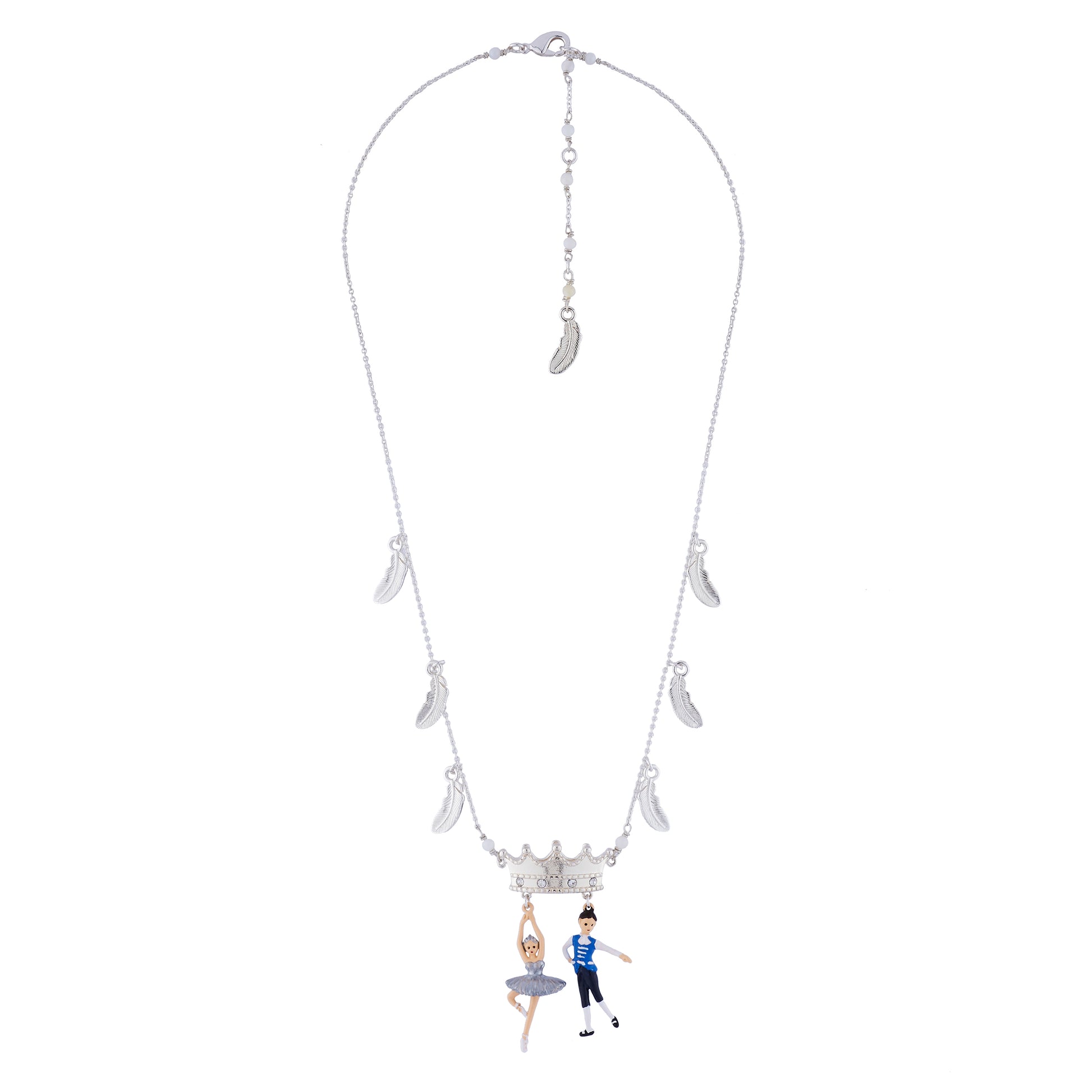 Introducing the Le Bal Blanc Necklace from Les Nereides. Inspired by Swan Lake, this collection offers a sophisticated evening look for dance lovers. Crafted with silver plated brass, crystal bead, and hand-painted enamel, this necklace is both elegant and nickel-free. The chain length is 45cm with a 5cm extension, and the Prince Pendant measures 3.5cm. Each piece of N2 by Les Néréides jewellery comes with its own N2 by Les Néréides packaging. Elevate your style with this exquisite necklace from Les Nereides.