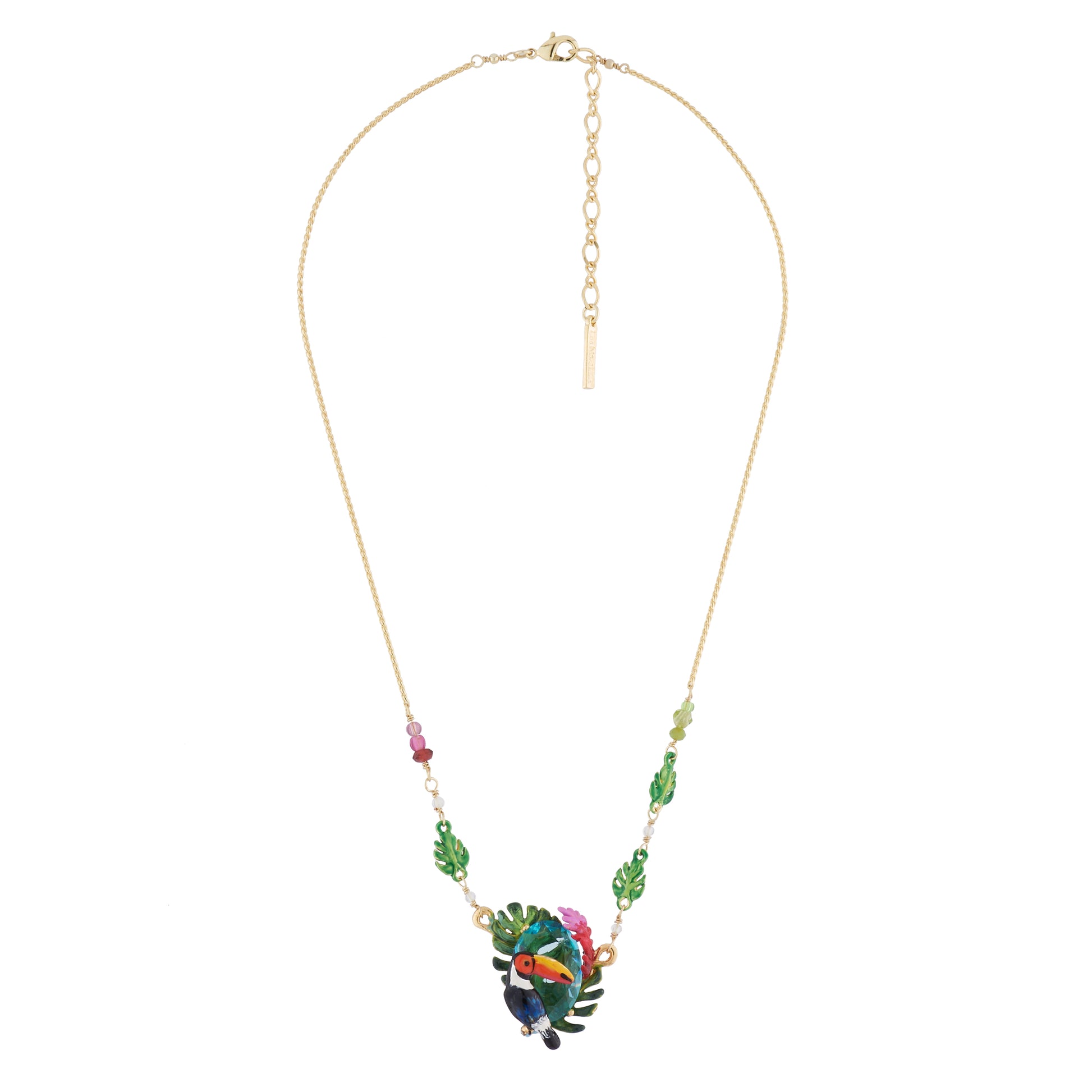 Introducing the Luxuriante Canopée Necklace from Les Nereides. Immerse yourself in the enchanting world of Les Nereides with this exquisite collection inspired by the lush rainforests. Adorned with vibrant toucans, hummingbirds, and other tropical creatures, this necklace is a true statement piece. Crafted with care, it features gold plated brass (18k), hand-faceted stones, crystal beads, rhinestones, and hand-painted enamel. Rest assured, it is nickel-free for sensitive skin. The chain length is 40cm with a 5cm extension, while the pendant measures 3cm in length and 2.5cm in width. Delivered in Les Nereides packaging, this necklace is a must-have for any jewellery lover.