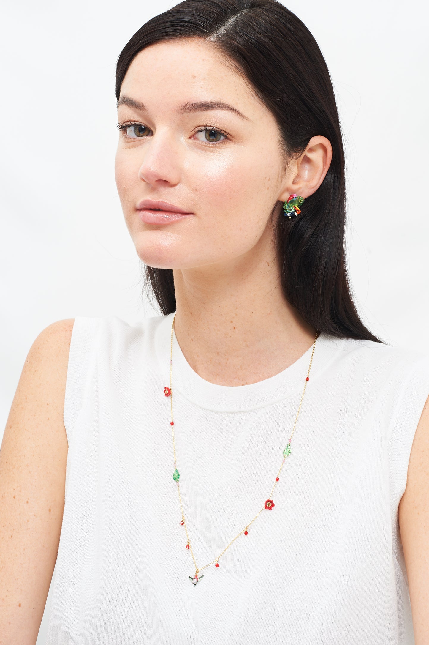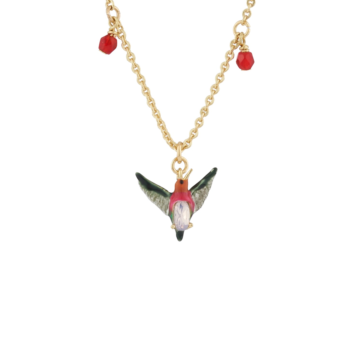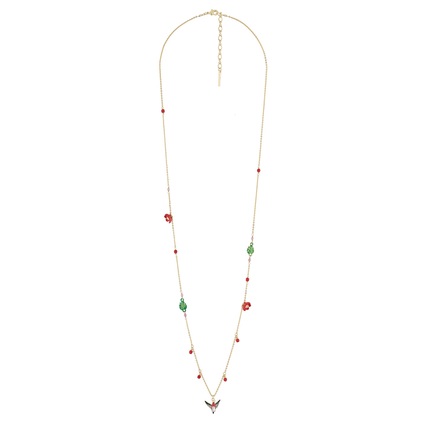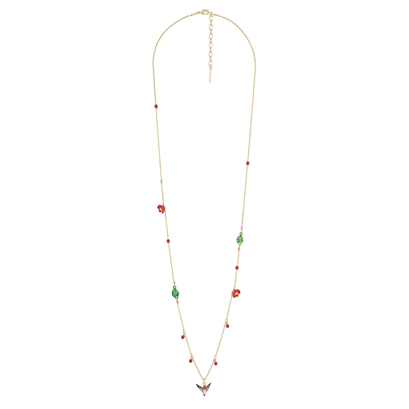 Introducing the Luxuriante Canopée Necklace by Les Nereides. Immerse yourself in the enchanting world of Les Nereides with this exquisite collection inspired by the rainforest. Adorned with vibrant toucans, hummingbirds, and other tropical animals, this necklace is a true masterpiece. Crafted with care, it features gold plated brass (18k), hand-faceted stones, crystal beads, rhinestones, and hand-painted enamel. Rest assured, it is nickel-free for your comfort. The chain length is 70cm with a 5cm extension, while the hummingbird pendant measures 1.5cm in length and 2cm in width. Delivered in Les Nereides packaging, this necklace is a must-have for any jewellery lover.