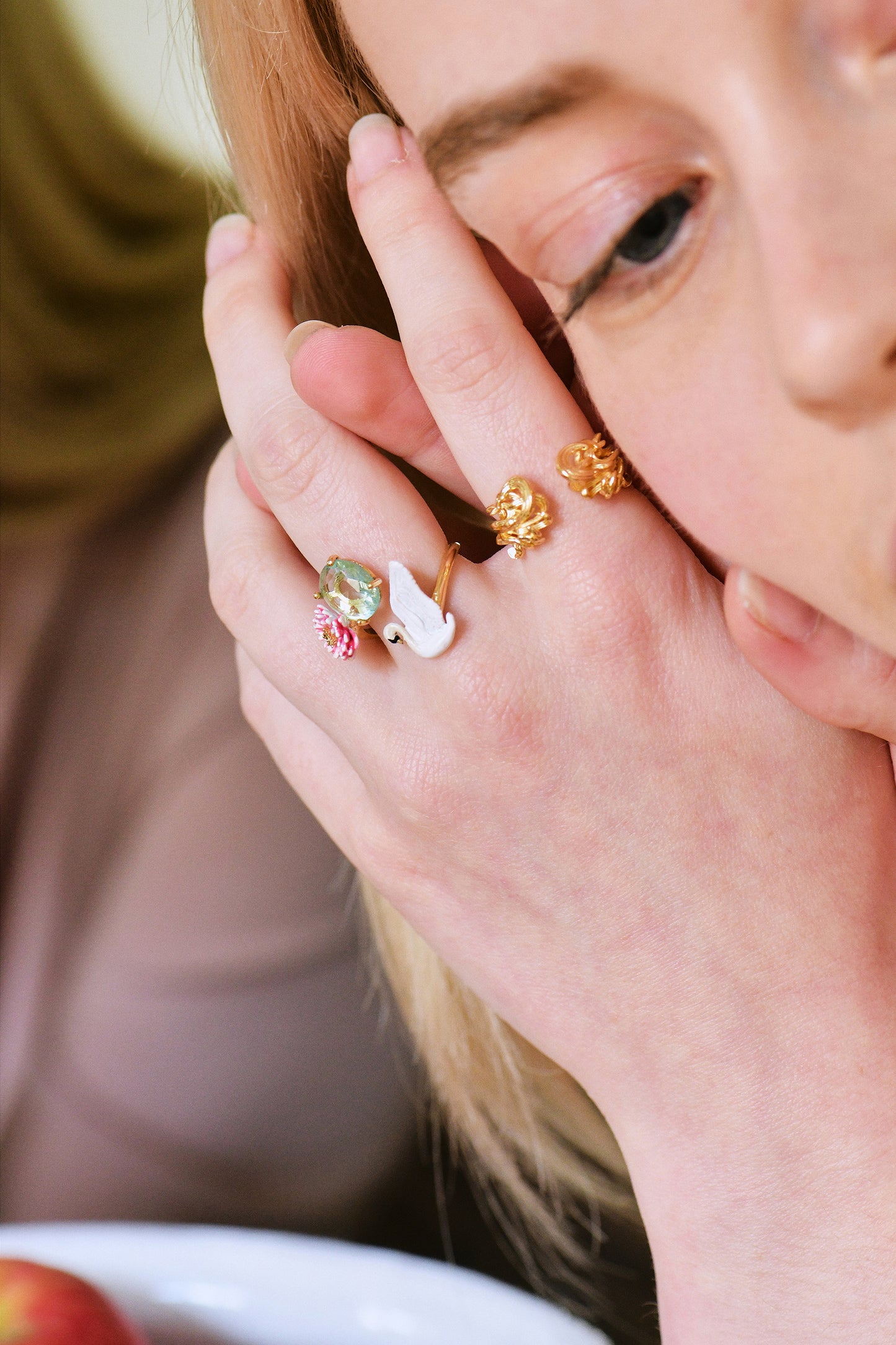 Experience the finesse of a swan and the delicacy of a flower with the White Swan and Pink Water Lily Adjustable Ring from Les Néréides. Handcrafted with enamelled detailing, this ring showcases the brand's love for flora and fauna. The soft and rustic setting of pink and gold hues, along with a faceted blue stone, adds to its charm. Made with gold plated brass, this adjustable ring for women is a part of the A Simple Swan collection. With a length of 2.4 cm, width of 1.5 cm, and weight of 3.95g, it is a perfect addition to your jewellery collection. Discover more marvellous designer custom jewellery from Les Néréides and elevate your style.
