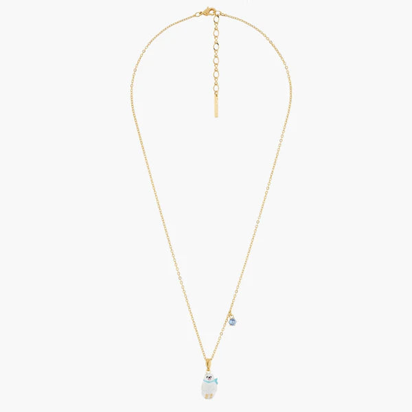 Introducing the White Pomeranian Pendant Necklace from Les Néréides Loves Animals Collection - the perfect first step before adopting the living version of this adorable breed. Crafted from luxurious gold-plated brass, this necklace for women features a hand-enamelled pendant that captures the essence of the beloved Pomeranian. The chain is adorned with a stunning blue faceted crystal, adding a touch of elegance to this playful piece. With a length of 45cm, a width of 1cm, and a 5cm extension, this necklace is versatile and can be worn with any outfit. Weighing in at 8.45g, it is lightweight and comfortable to wear all day long. Add a touch of whimsy to your jewelry collection with the White Pomeranian Pendant Necklace from Les Néréides.