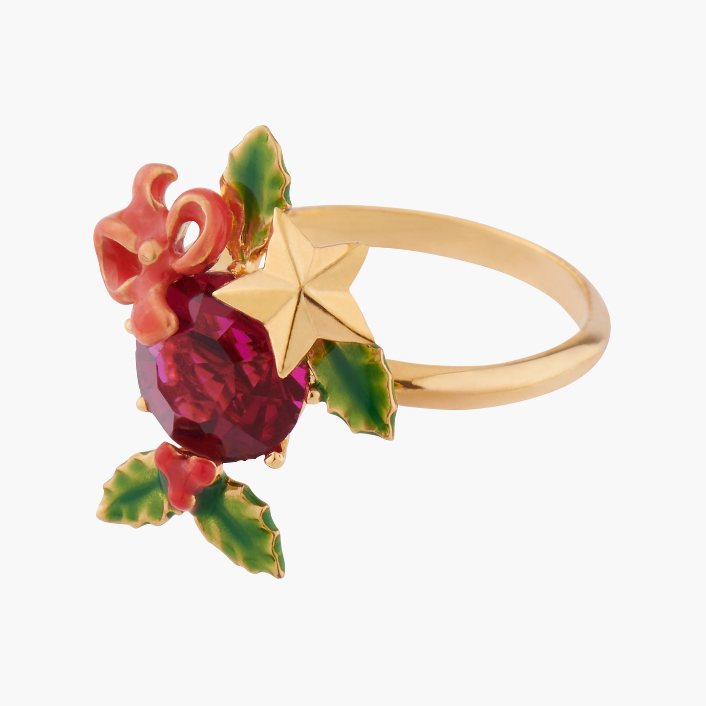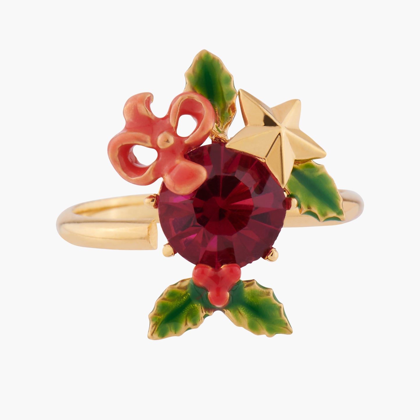 Red Stone And Christmas Holly Adjustable Rings | AKNO602