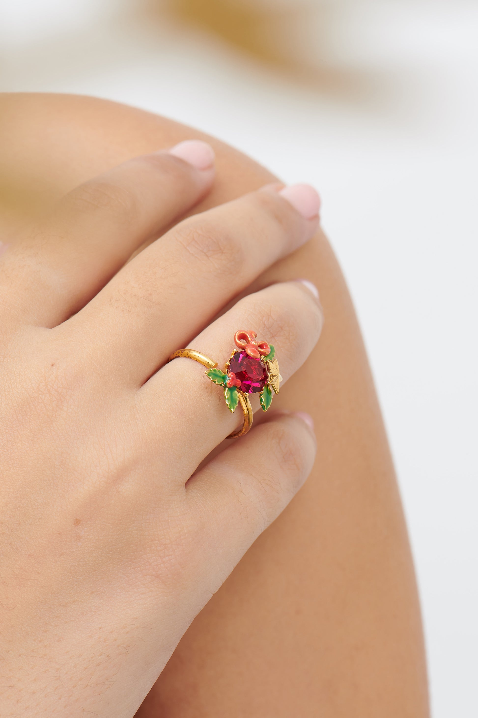 This adjustable ring for woman is made up of gold-plated brass and is enameled by hand. A faceted red coloured crystal stone is adorned on this costume jewellery piece.