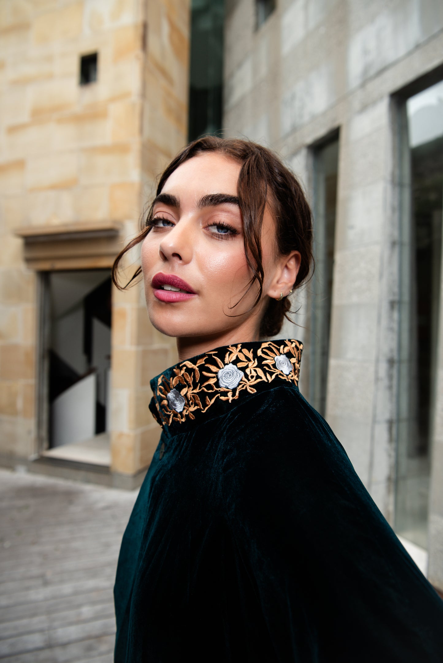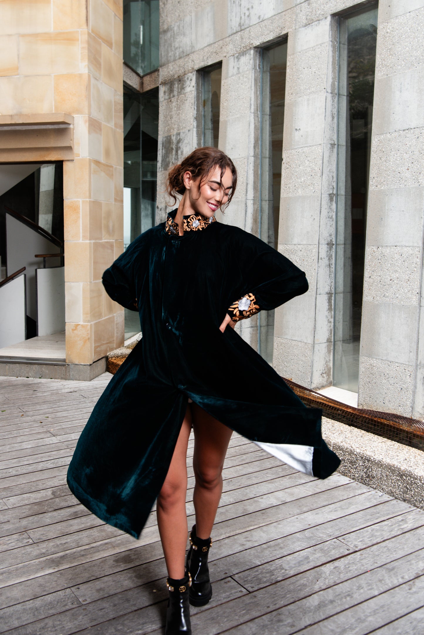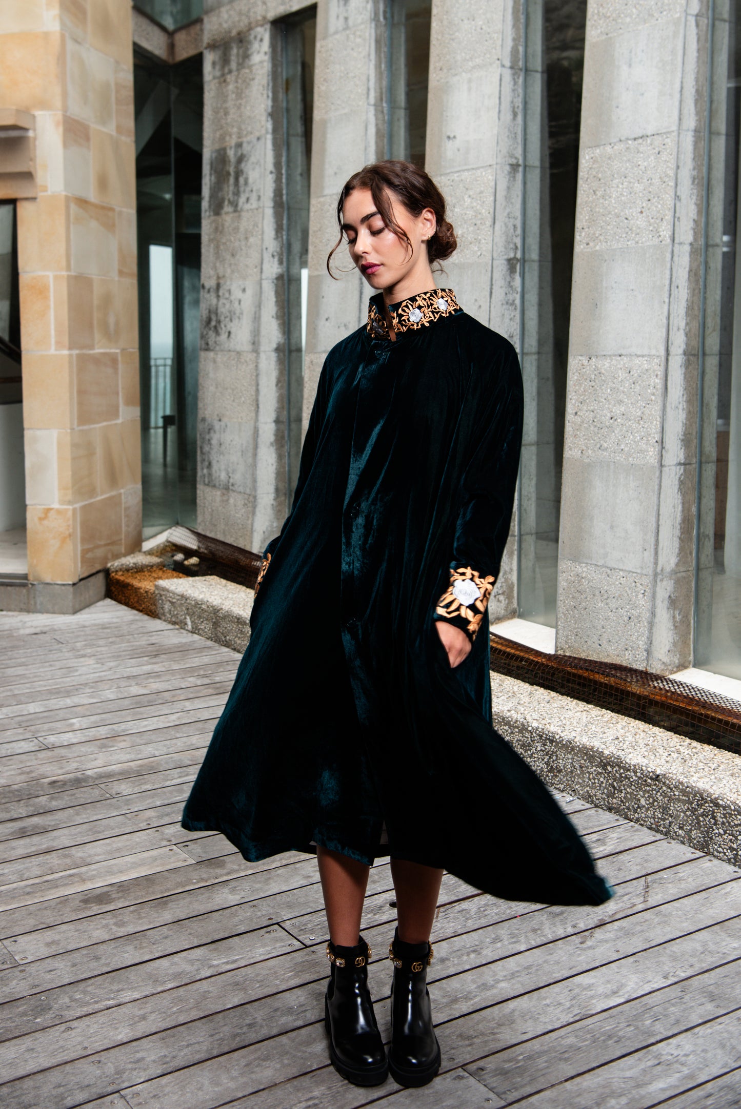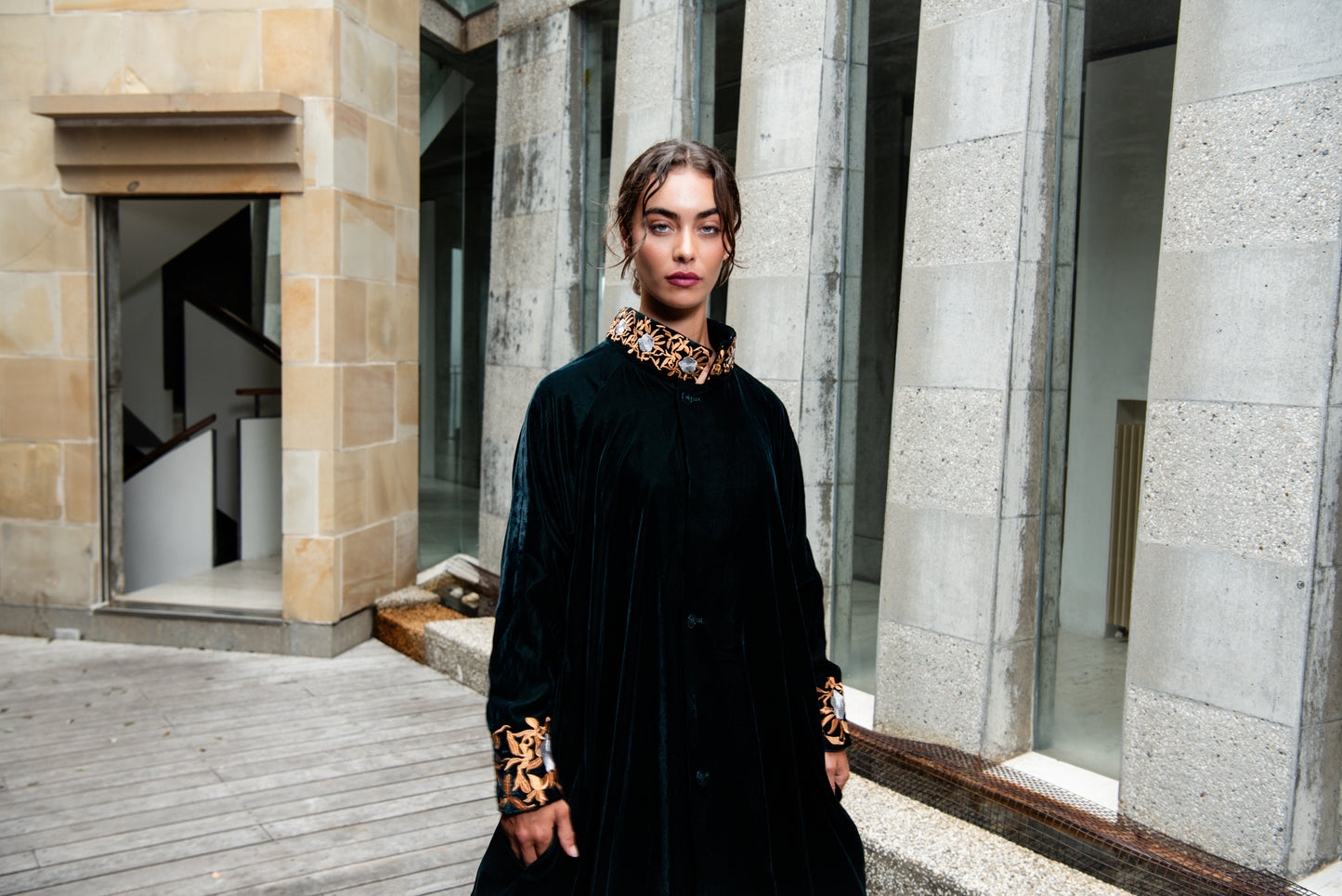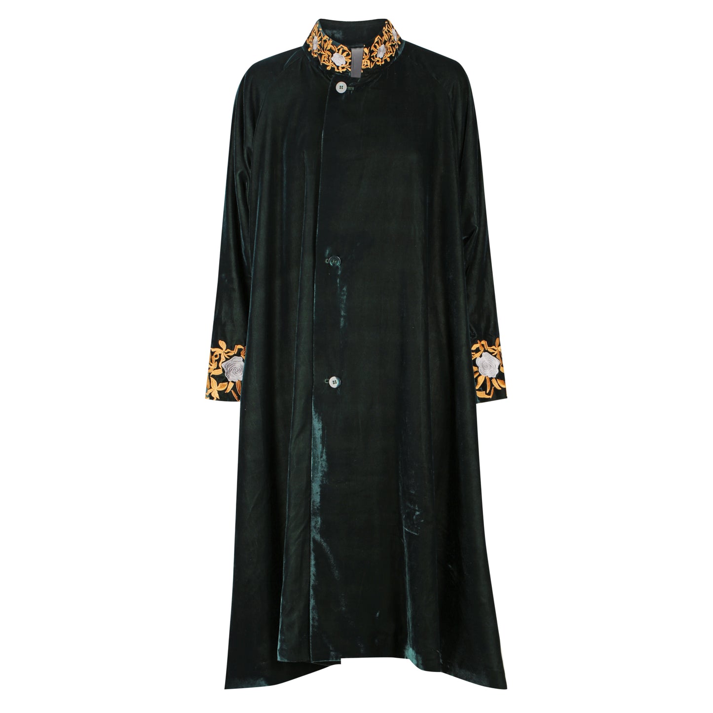 Daring and mysterious, our Velluto Coat is one of comfort and detail. With it's striking lining, and beautifully embroidered neckline and cuffs it hangs from the body with ease. Adorned with button closures, this coat will become your favourite to impress with.