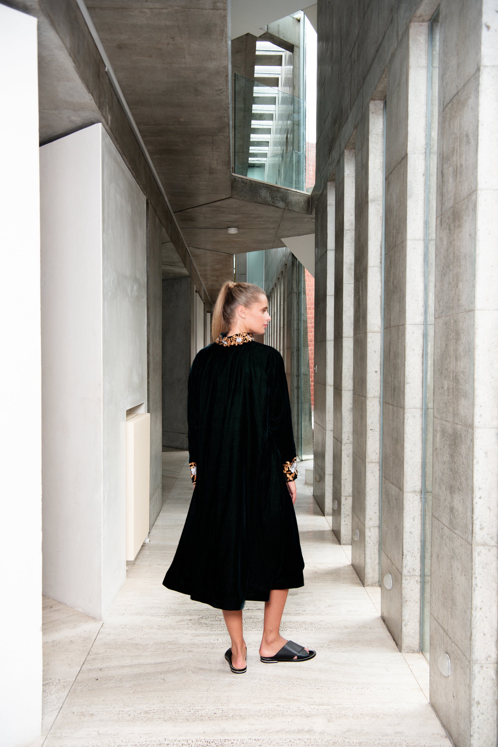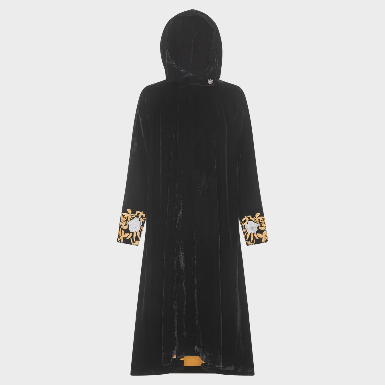 Daring and mysterious, our Velvet Coat is one of comfort and detail. With it's striking lining, and beautifully embroidered cuffs it hangs from the body with ease. Adorned with a hood and press studs, this coat will become your favourite to impress with.