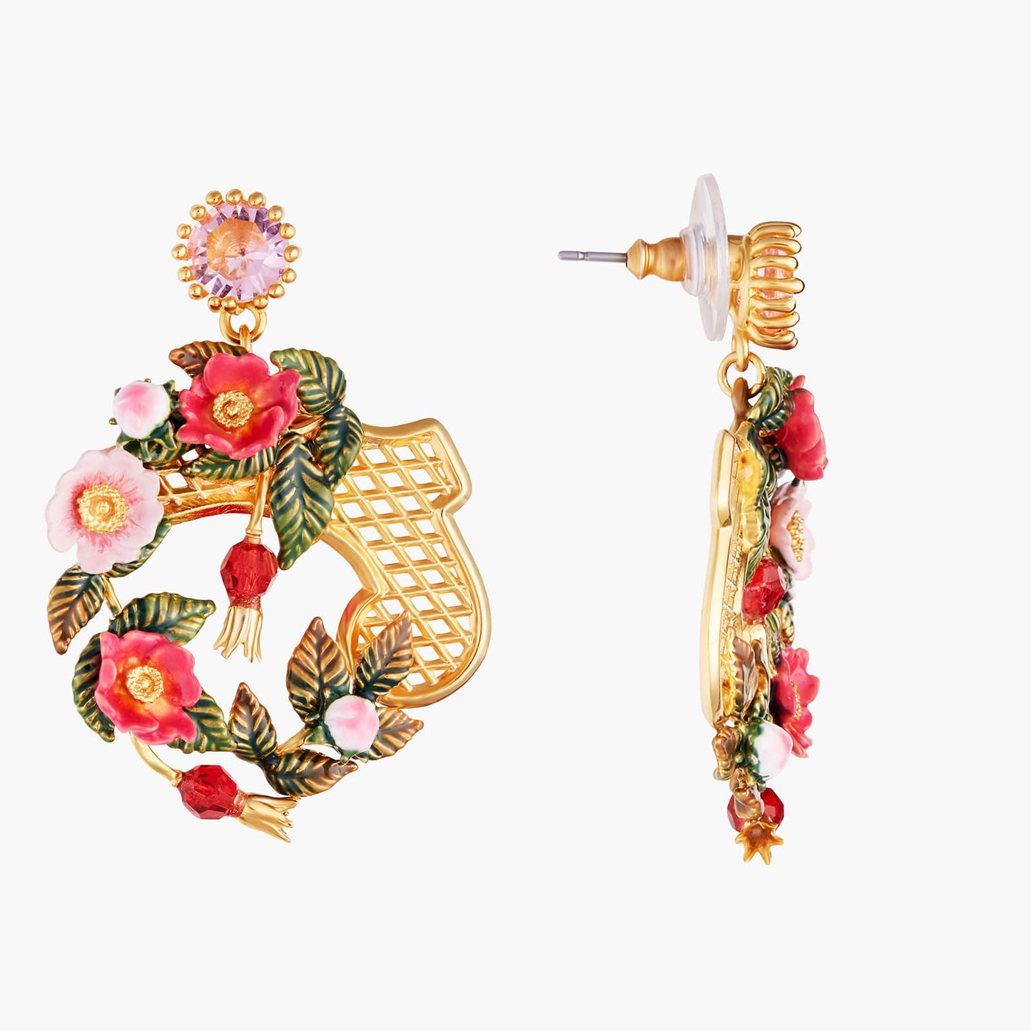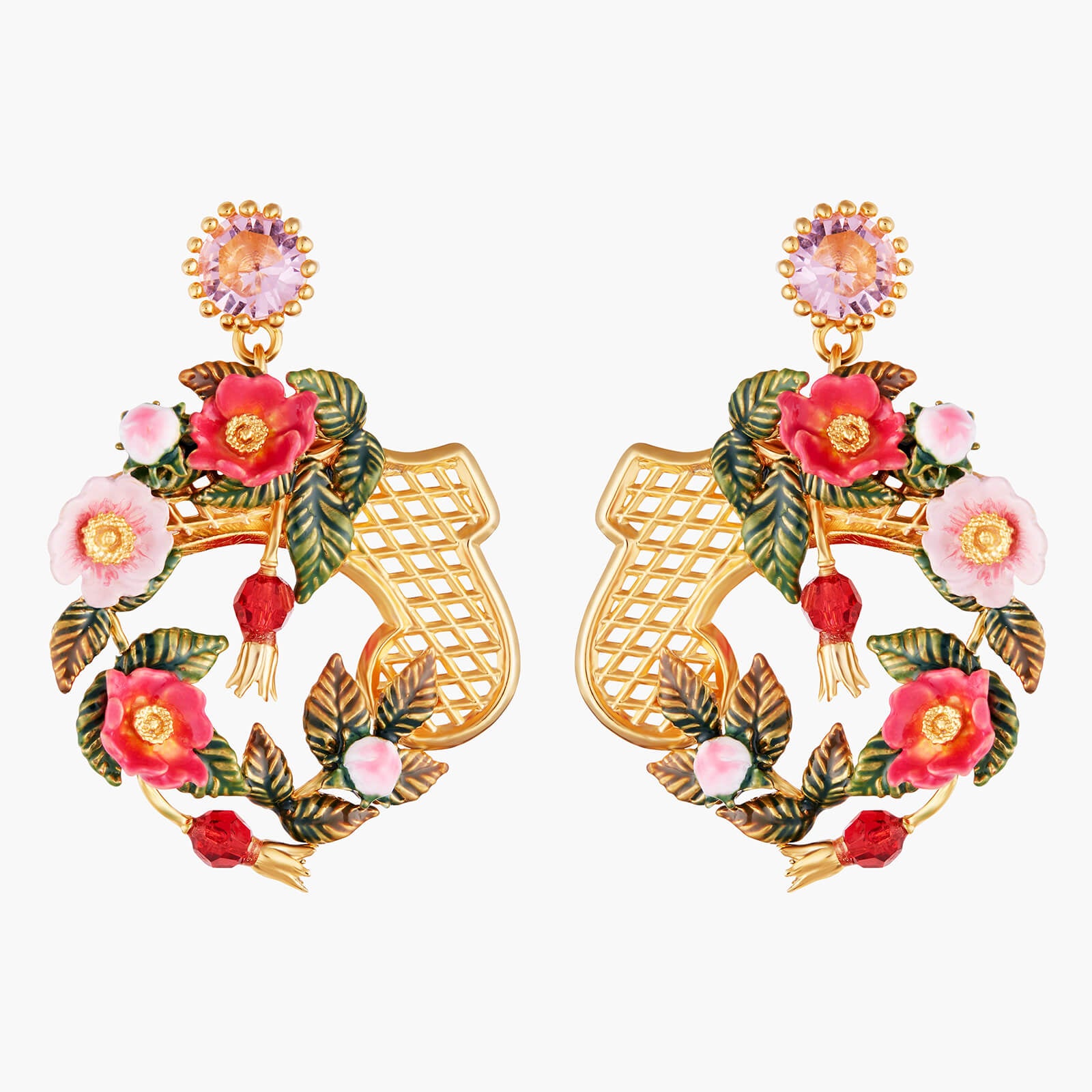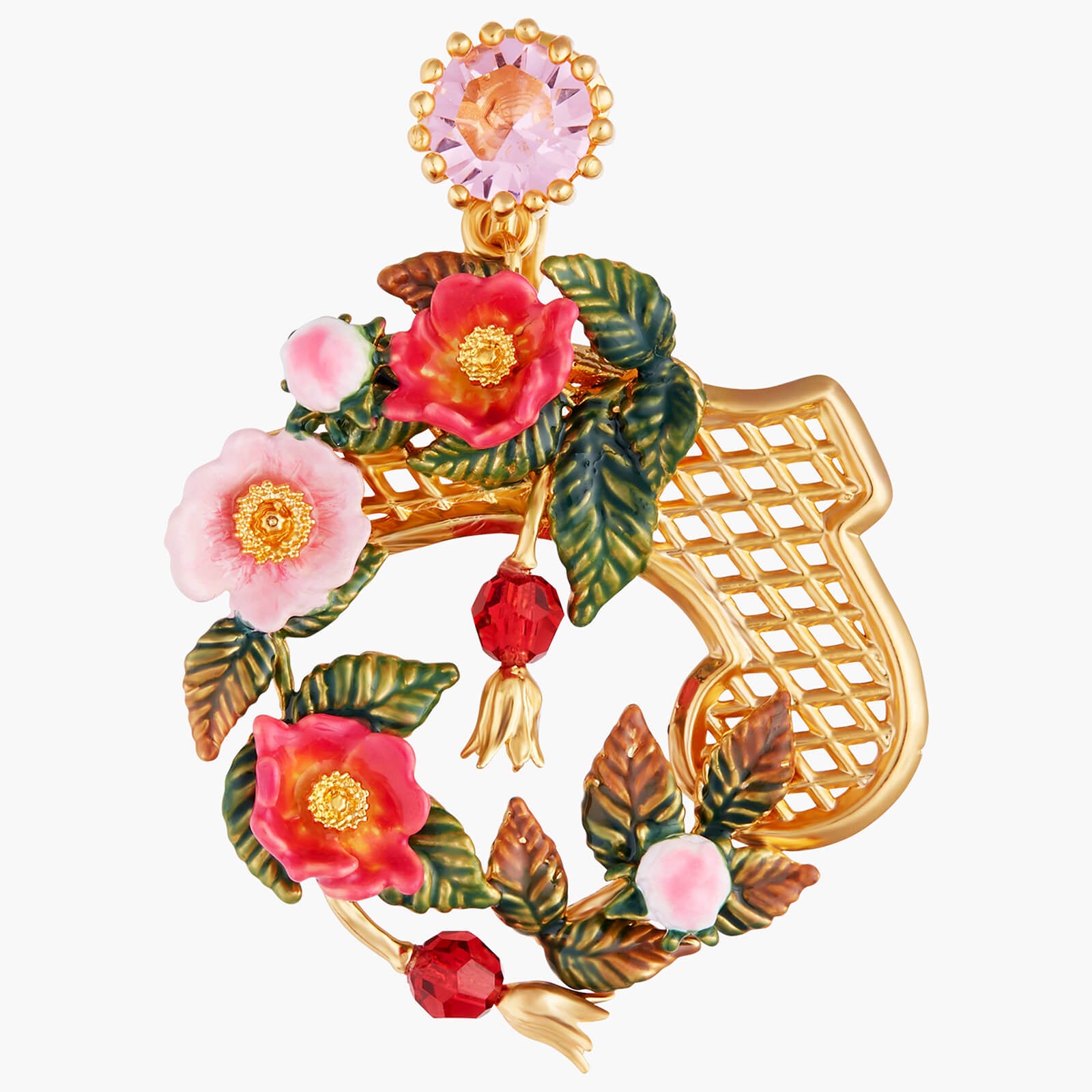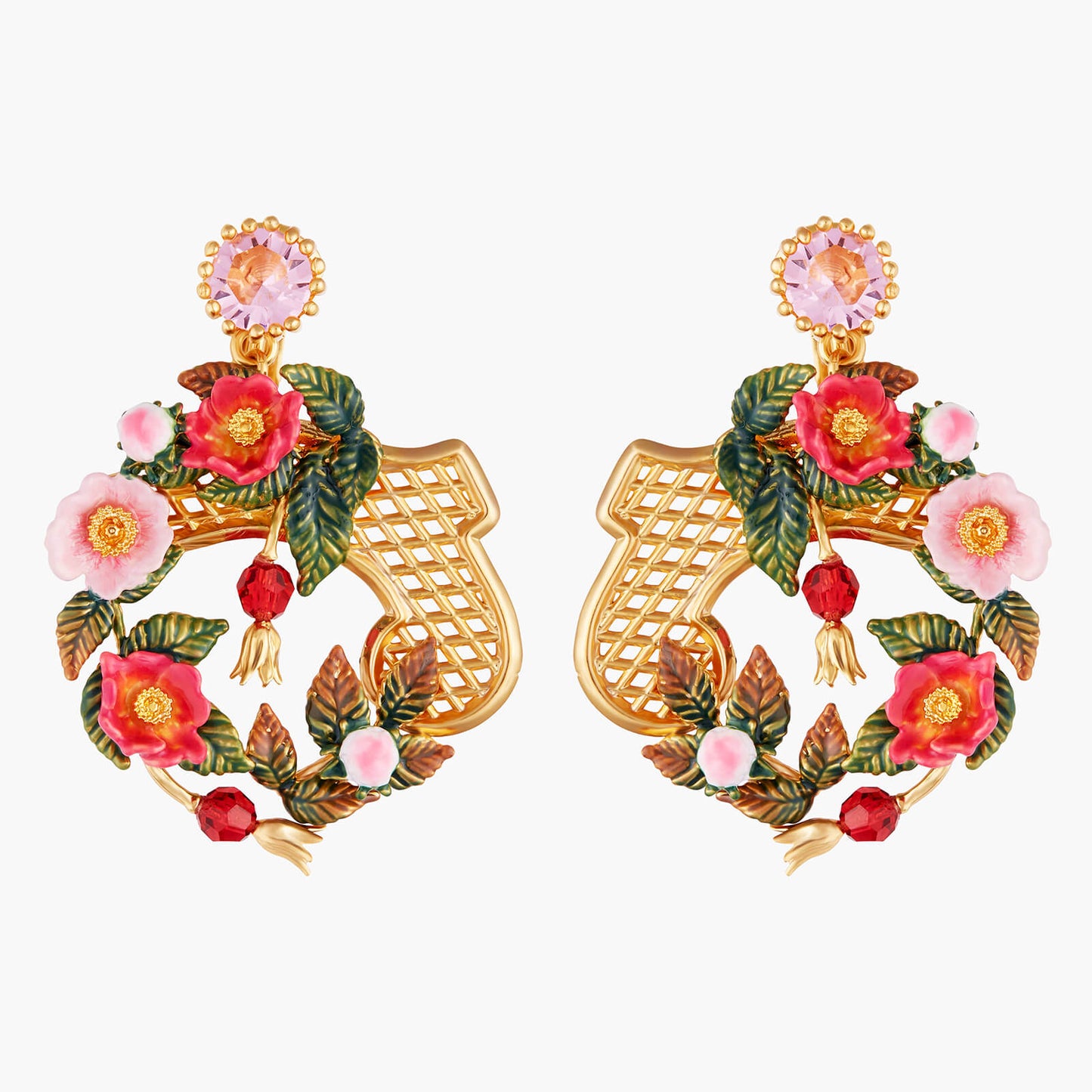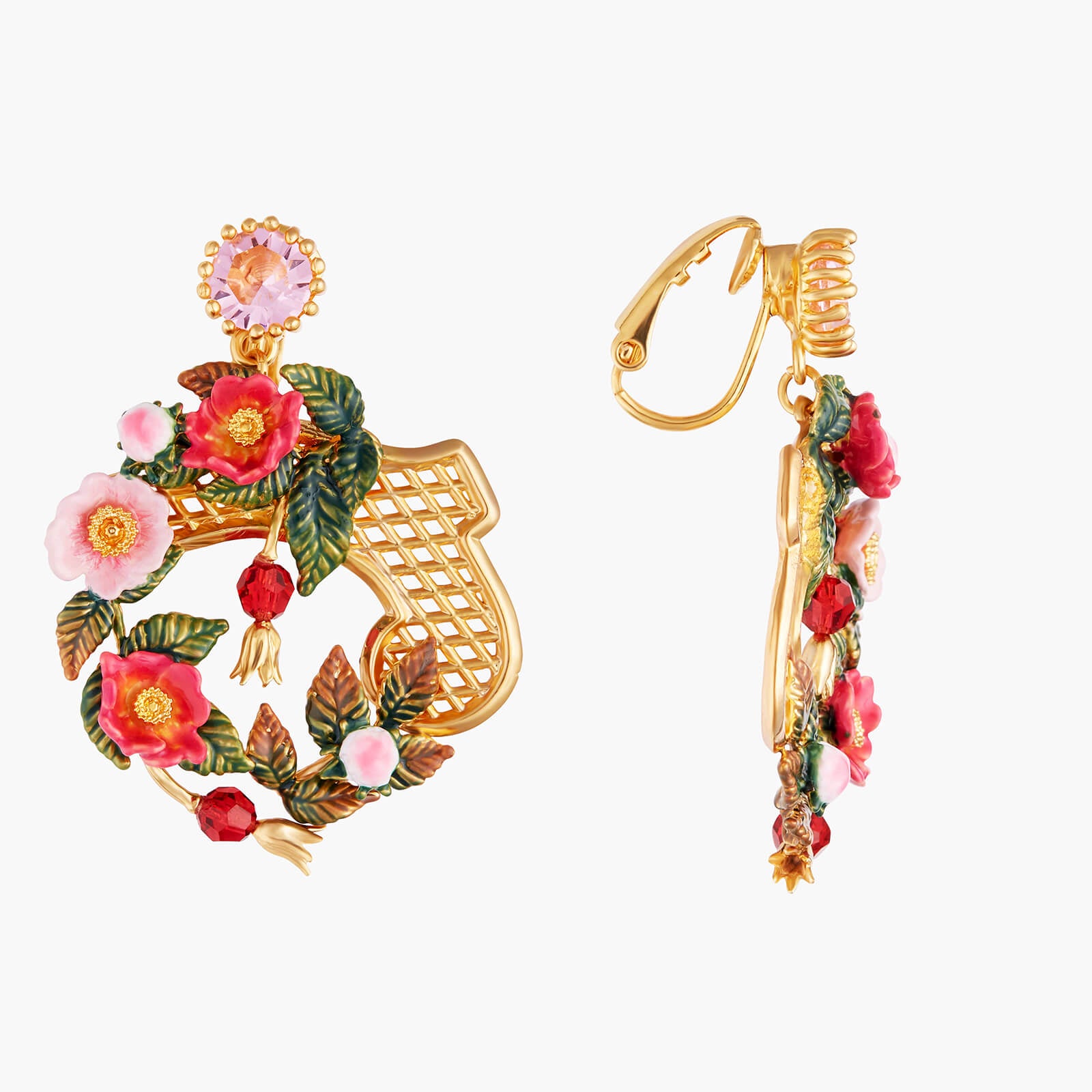 Introducing the Rose Bush On Trellis Earrings from Les Nereides. These exquisite clips are inspired by wild roses, offering a unique and refined design. Part of the A Rose by any other name would smell as sweet collection, these earrings are a true symbol of elegance and sophistication. Crafted with gold plated brass and hand-enamelled brass, adorned with faceted crystal and crystal beads, these earrings are a must-have for any fashion-forward individual. With a length of 4.5cm, width of 3.2cm, and a weight of 15.2g, these earrings are the perfect accessory to elevate any outfit. Experience the luxury of Les Nereides with these stunning Rose Bush On Trellis Earrings.