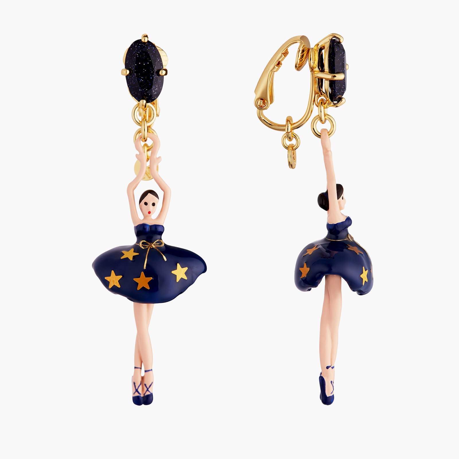 Indulge in the celestial beauty of the Constellation Ballerina Earrings from Les Néréides. This year's Ballerinas Collection showcases a stunning deep night blue gown adorned with golden stars, inspiring you to reach for the stylish sky. Handcrafted with gold plated brass, these clip-on earrings feature exquisite enamelled ballerinas and stars, faceted crystal, and cut crystal. With a length of 6 cm, width of 1.9 cm, and weight of 5.72g, this pair of stud earrings is a must-have addition to your unique costume jewelry collection. Don't miss out on the opportunity to own a piece of Les Néréides' unparalleled luxury.