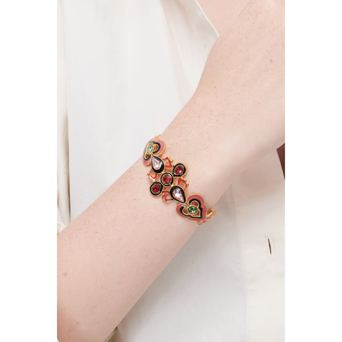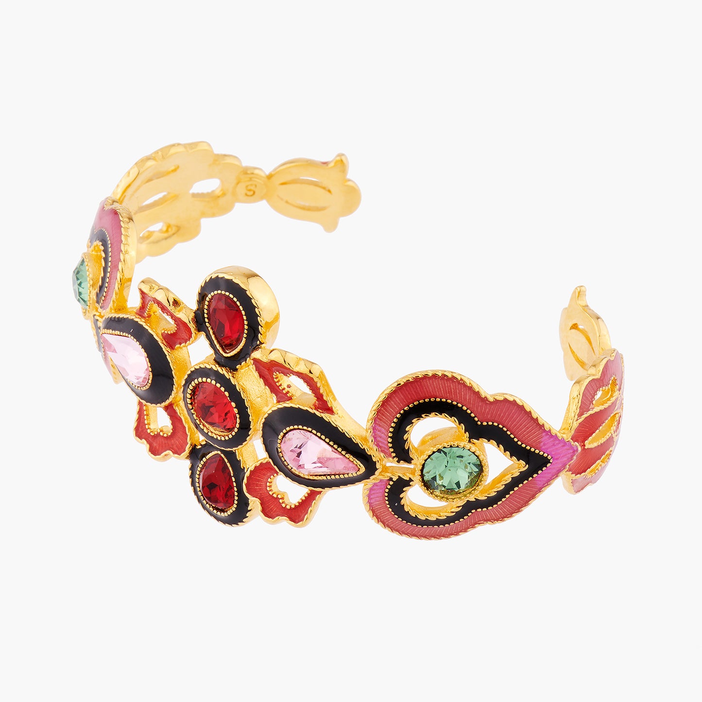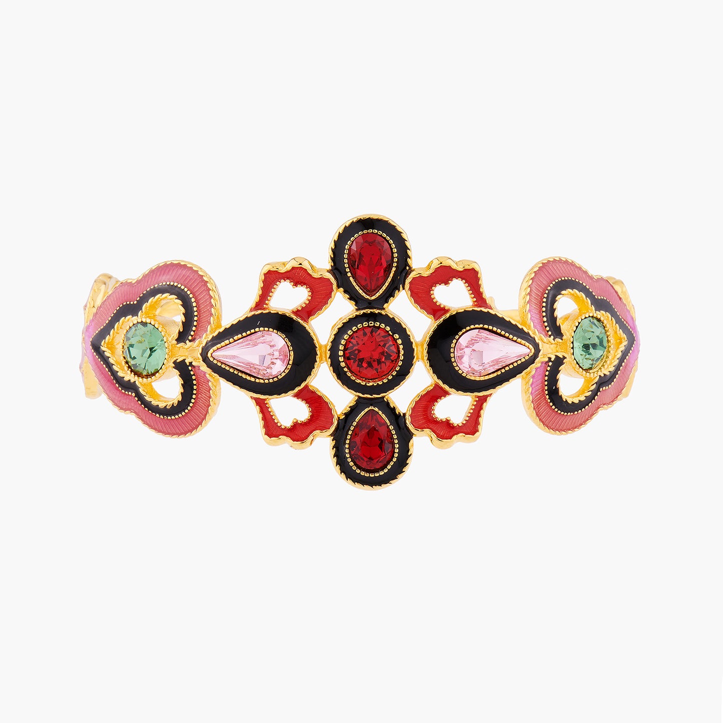 Introducing the Indian Summer Bangle Bracelet, a stunning piece of designer jewelry from the esteemed Les Néréides. Crafted with fine gold-plated brass, this bangle features transparent enamels applied by hand on guilloché backgrounds and matte black highlights, creating a depth and intensity that is truly breathtaking. The multi-color faceted crystals set in a milgrain border, coils, and filigree add a touch of elegance to this high-end costume jewelry. With a length of 3.8 cm, a width of 5.5 cm, and a weight of 18.8g, this magnetic and refined bangle is the perfect addition to any jewelry collection. Don't miss out on the Indian Summer collection's must-have accessory.