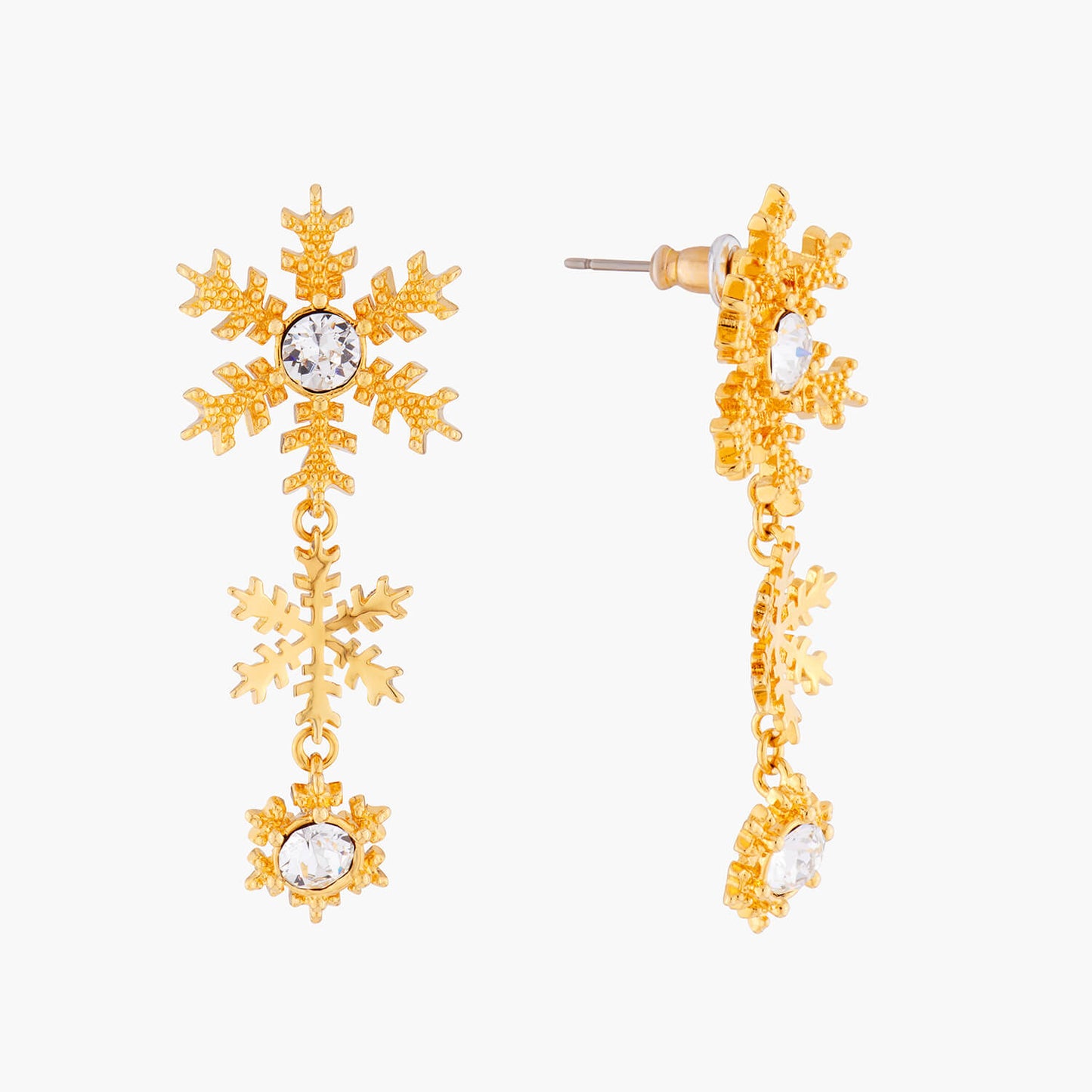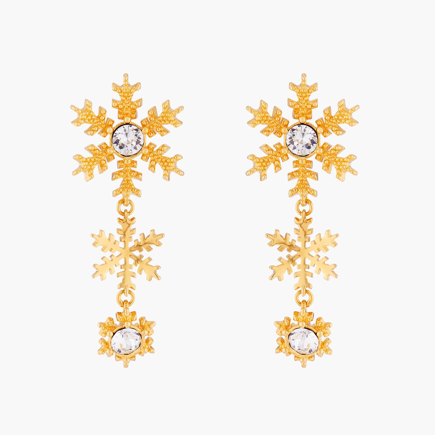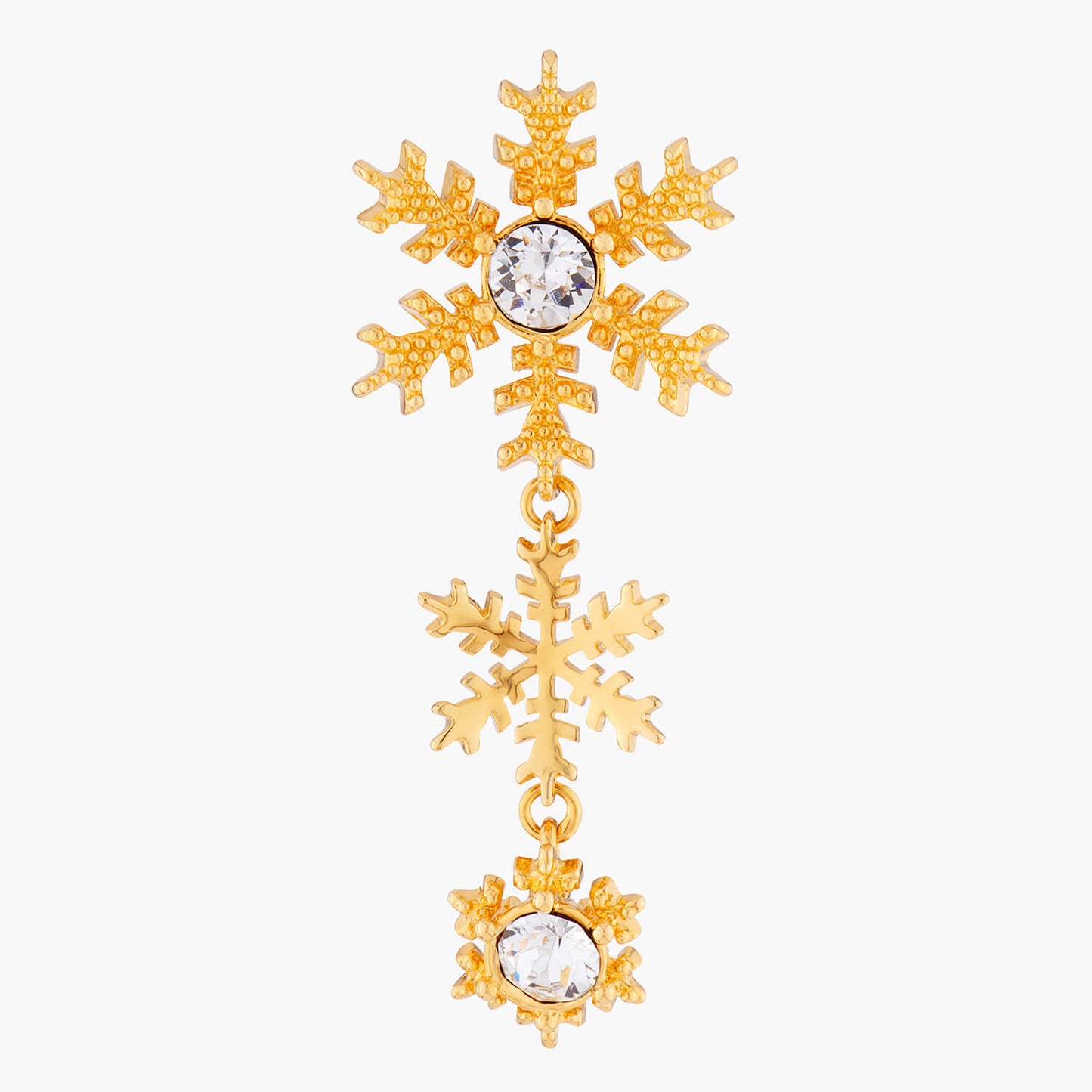 Celebrate the winter season with the Golden Snowflakes Earrings from Les Néréides. These sparkling earrings are the perfect addition to any holiday outfit, adorned with precious jewelry from our Sparkling New Year's Eve collection. Available in both gold and silver versions, these dangling snowflakes are made with gold-plated brass and faceted crystals. With a length of 5cm, a width of 2.86cm, and a weight of 7.87g, these earrings are both elegant and comfortable to wear. Add a touch of luxury to your winter wardrobe with Les Néréides.