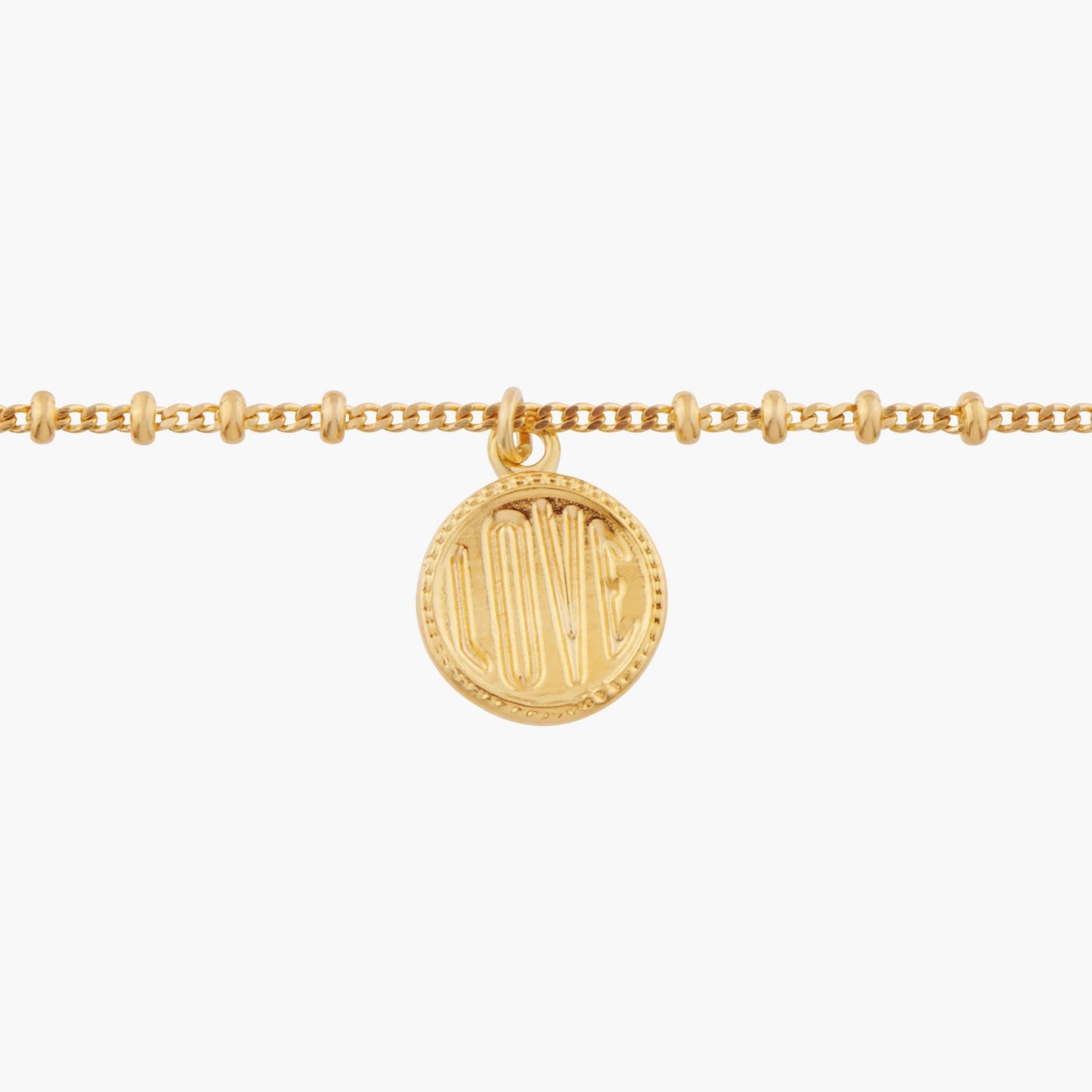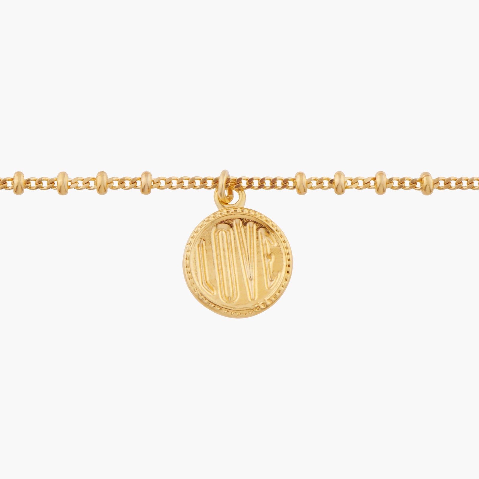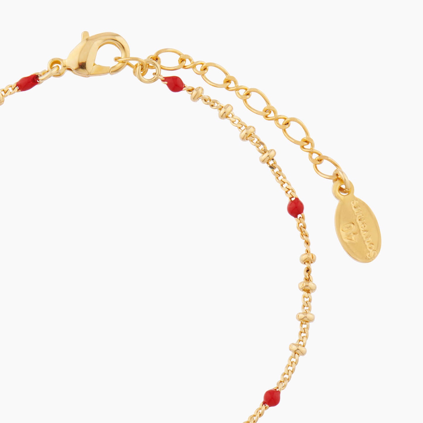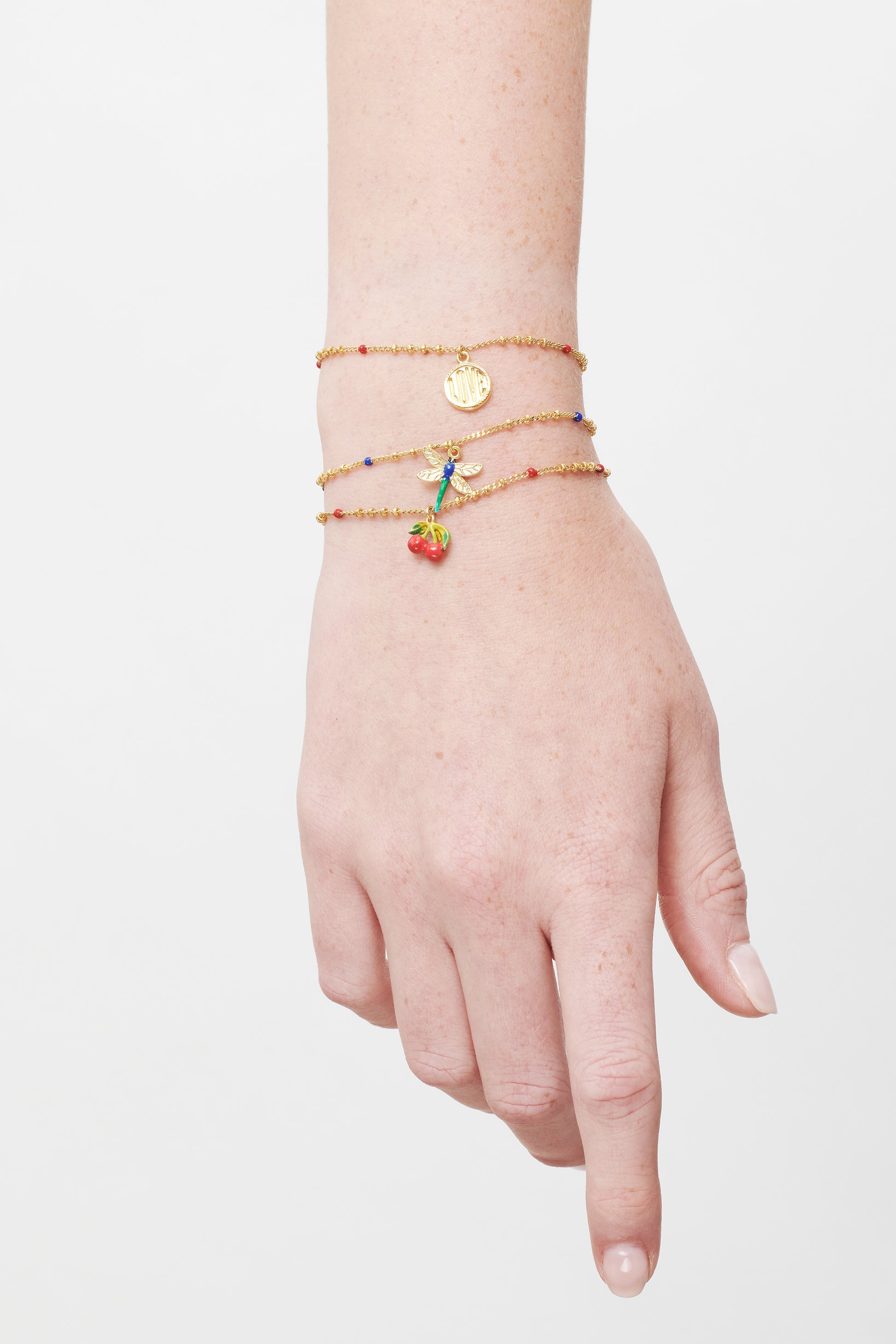 Thin Bracelet: chain made up of gold-plated brass, hand-enamelled brass beads, pendant made up of gold-plated and hand-enamelled brass.