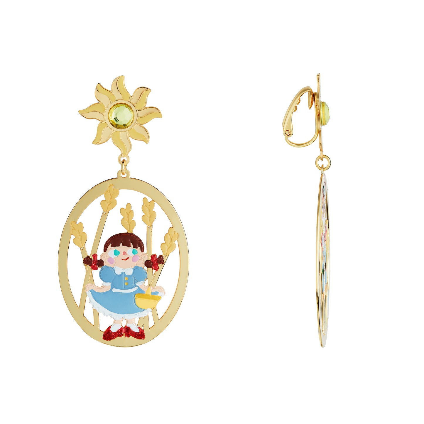Discover the whimsical and unique Toto & Dorothy Dorothy And Theé Scarecrow Asymmetrical Earrings from Les Nereides. These clip-on earrings feature hand-enamelled characters and faceted crystal, surrounded by ears of wheat. Made with gold-plated brass, these earrings are suitable for non-pierced ears and will add a touch of charm to your style. With a length of 14.5cm and a width of 1.3cm, these earrings weigh only 2g, making them comfortable to wear all day. Elevate your look with these exquisite Les Nereides earrings.