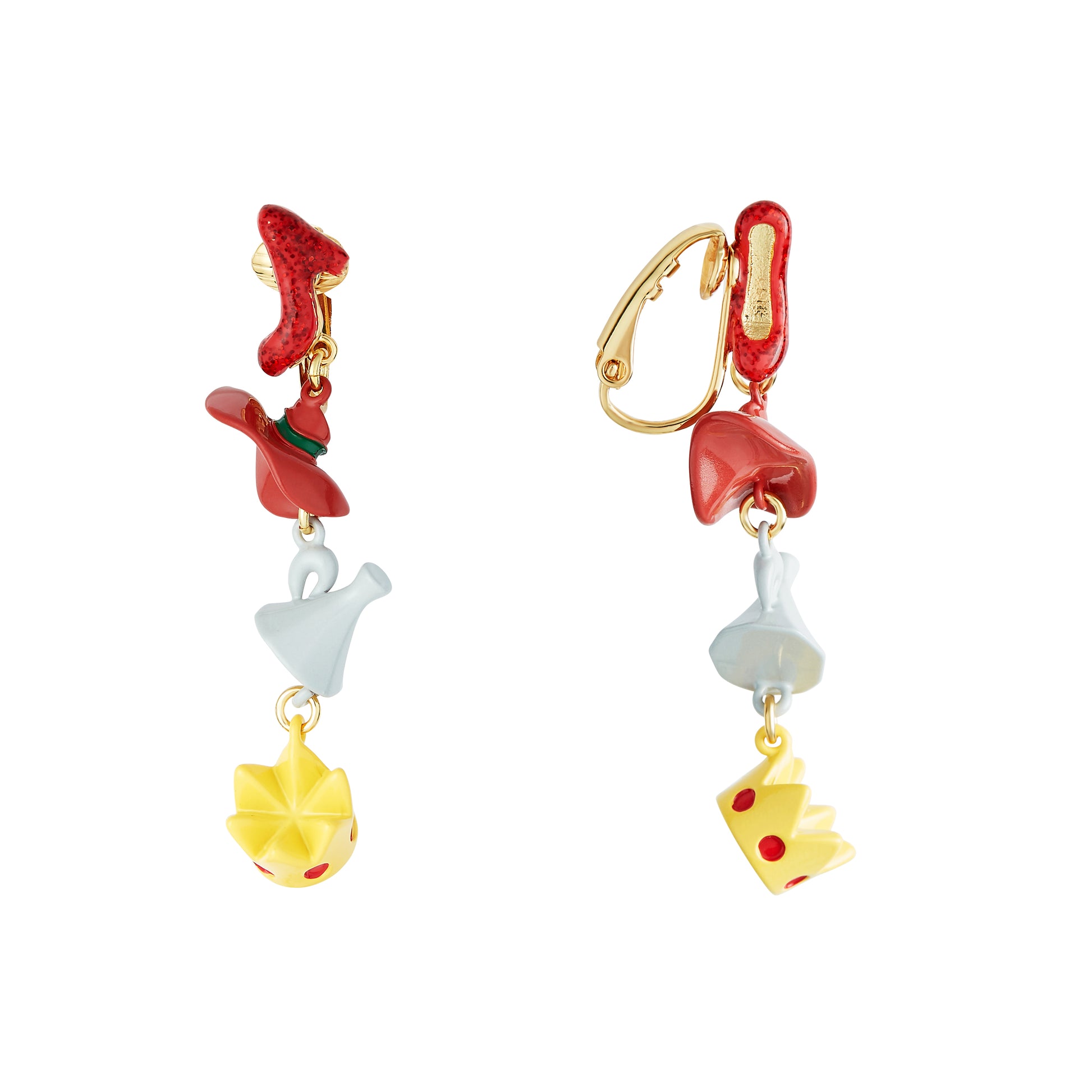 Add a touch of whimsy to your style with Theé Toto & Dorothy Shoe, Hat, Funnel And Crown Earrings from N2 by Les Nereides. These clip-on earrings feature hand-enamelled characters including a shoe, hat, funnel, and crown, inspired by the beloved tale of the Wizard of Oz. Crafted from gold-plated brass, these earrings are lightweight and suitable for non-pierced ears. With a length of 14.5cm and a width of 1.3cm, they are the perfect size to make a statement without overwhelming your look. Discover the magic of costume jewellery with Les Nereides and add these charming earrings to your collection.