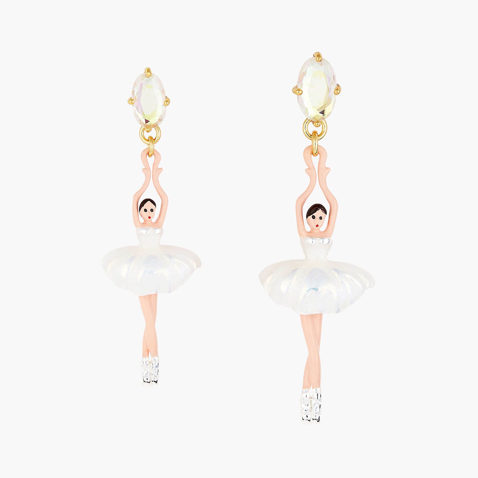 Enhance your evening wear with this pair of clip-on earrings from the new Pas de Deux collection. Sparkling silver with iridescent reflections, this new. cosmic colour gives the Pas de Deux collection an unparalleled festive look. This set can be combined with the hoop earrings from the A Thousand Stars collection for a poetic and dreamy feel. Clip-on Earrings : Fine gold-plated brass, hand-enamelled ballerinas, faceted crystal Lenght:6cm Width:1,8cm Depth:1,75cm Weight: 12,6g Clip-on earrings are suitable for non-pierced ears.