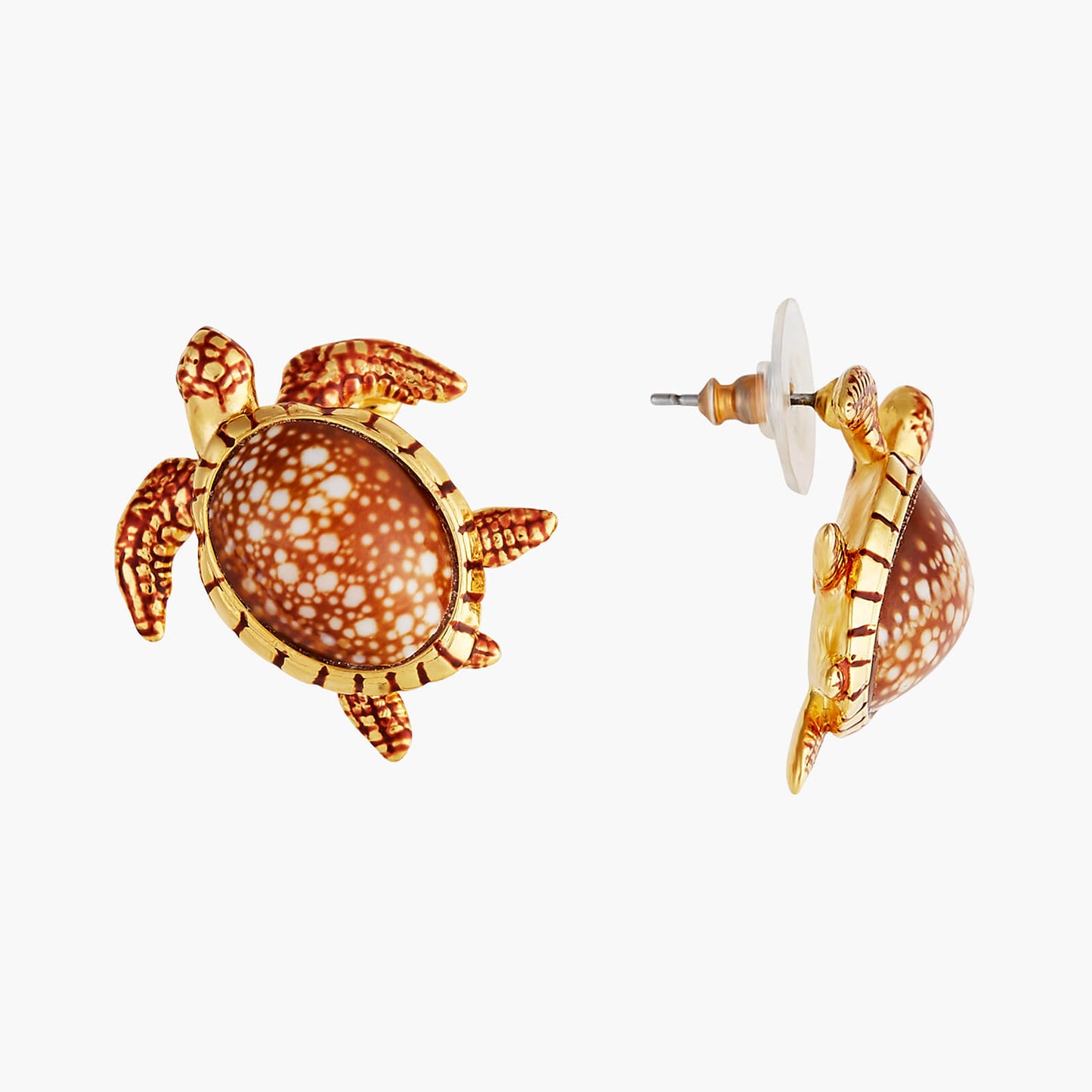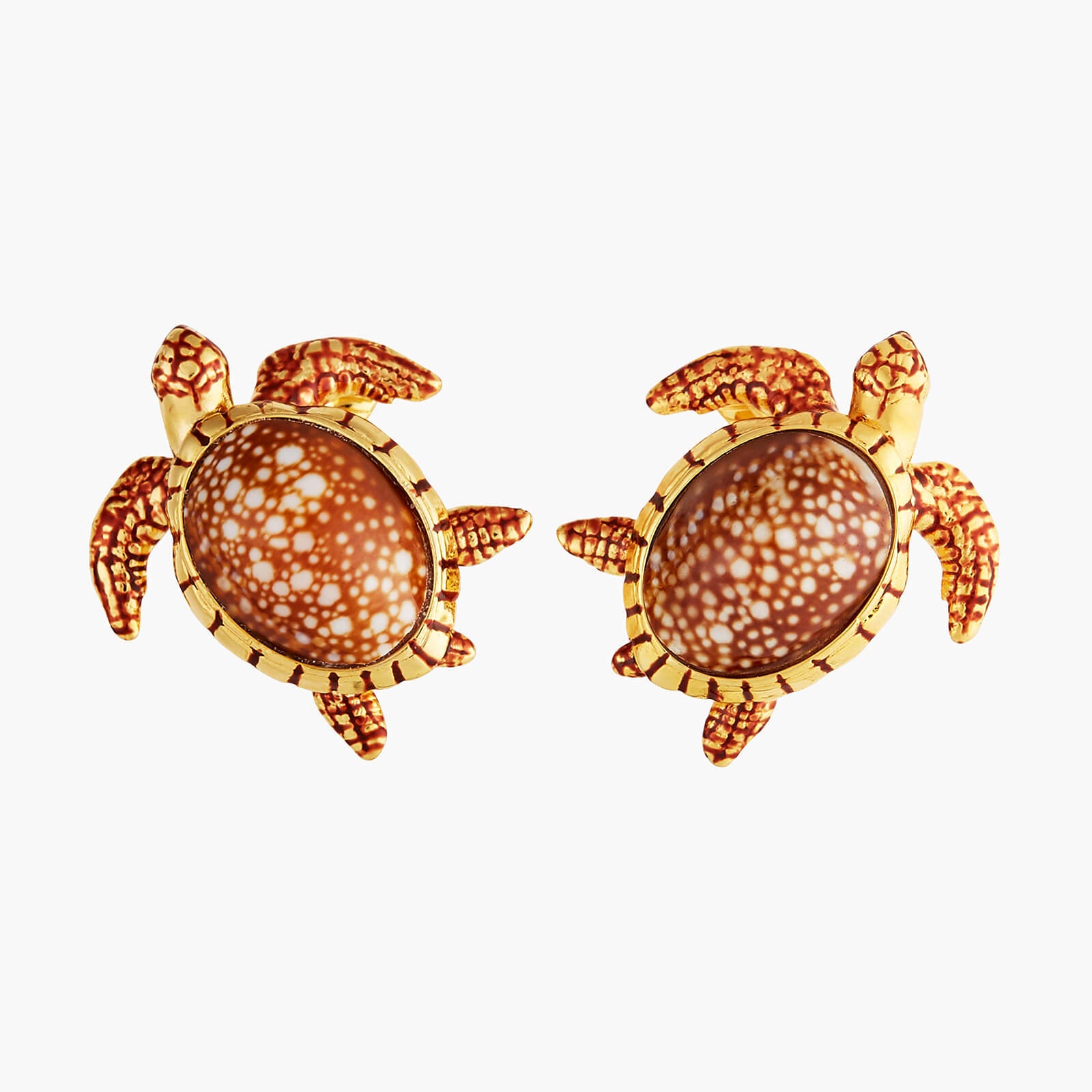 Experience the refreshing collection of Out at Sea by Les Nereides, which transports you to the fascinating world of the South Seas. These turtle clip-on earrings with speckled shells feature a most exotic golden sea creature, making you stand out in any crowd. Pair it with the speckled turtle cocktail ring for a complete travel-inspired set. The earrings are made of fine gold plated brass and hand-enamelled shell, making them a perfect fit for non-pierced ears. With a length of 2.9cm, width of 2.5cm, depth of 1.8cm, and weight of 14.22g, these earrings are a must-have for any fashion-forward individual. Get ready to turn heads with Les Nereides' Turtles and Speckled Shells Earrings.