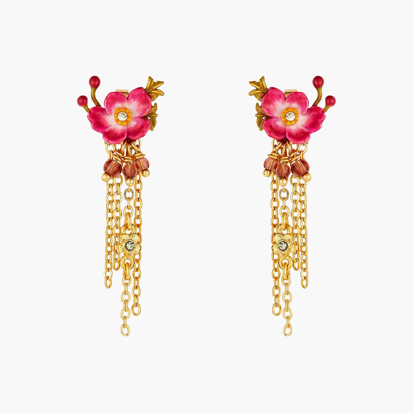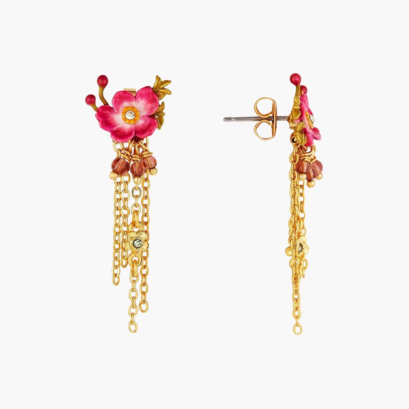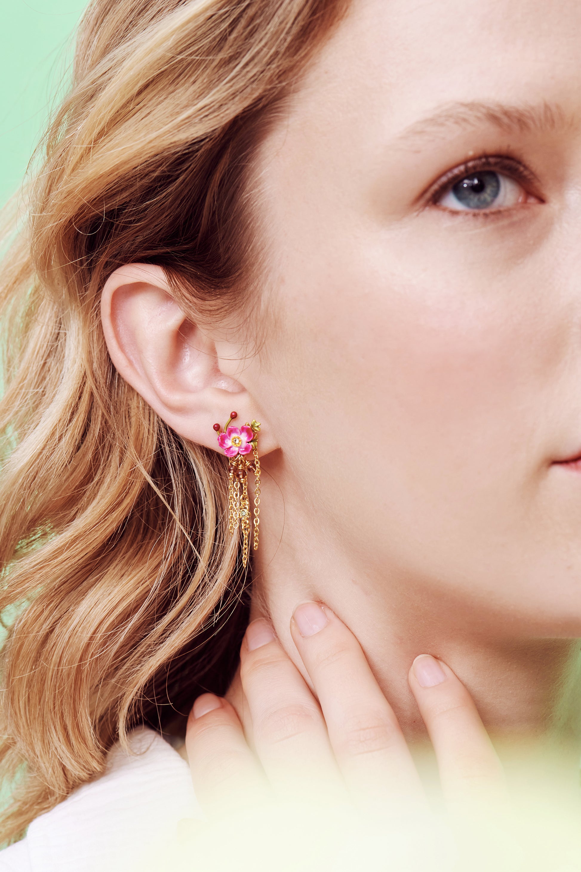La Maison Les Néréides offers a collection of fruit trees jewellery with these post earrings and enamelled pink orchard flowers with a bright cut crystal heart. This delicate women's ear jewellery from the Little Garden collection comes with thin gold chains on which small grapes made of purple glass beads are hanging.