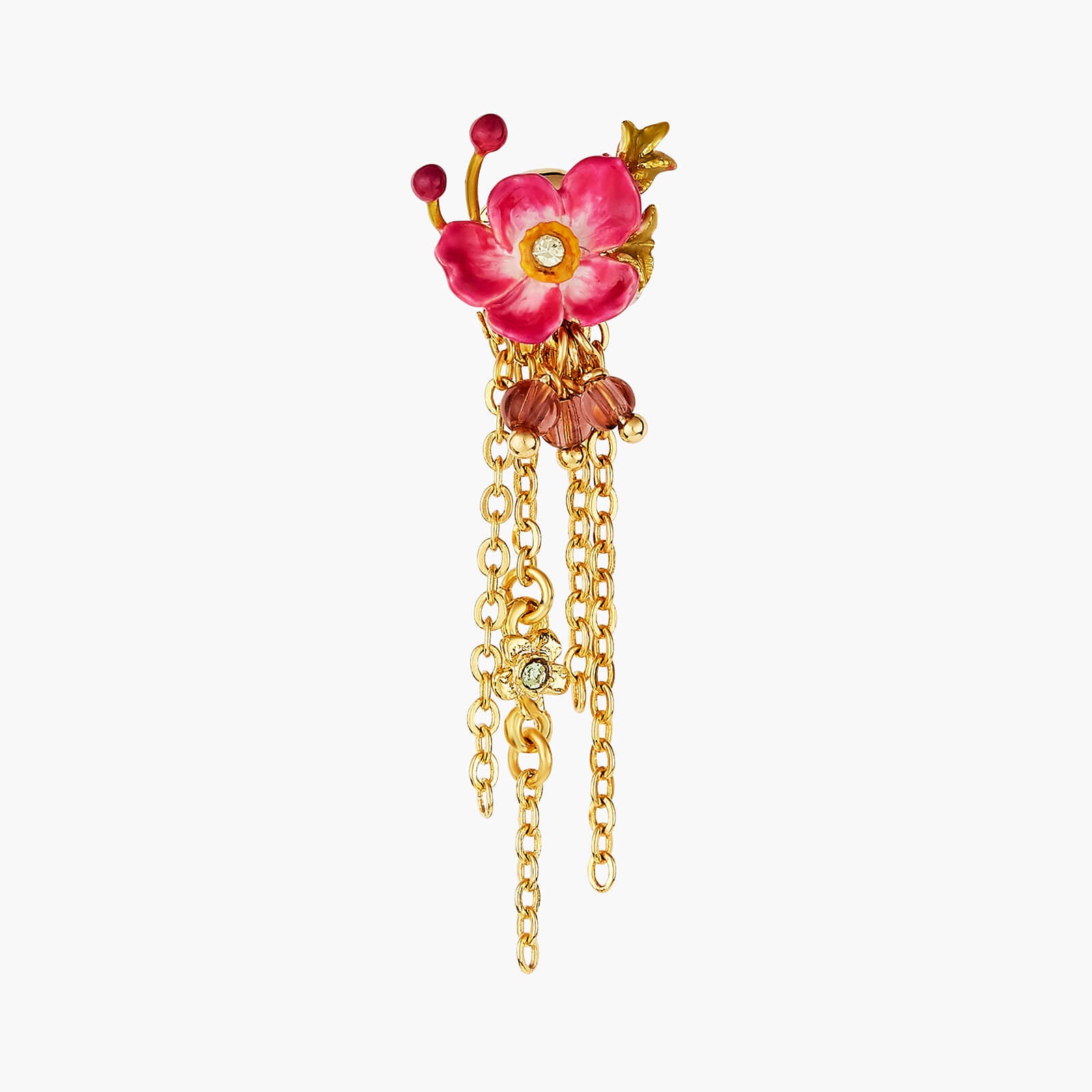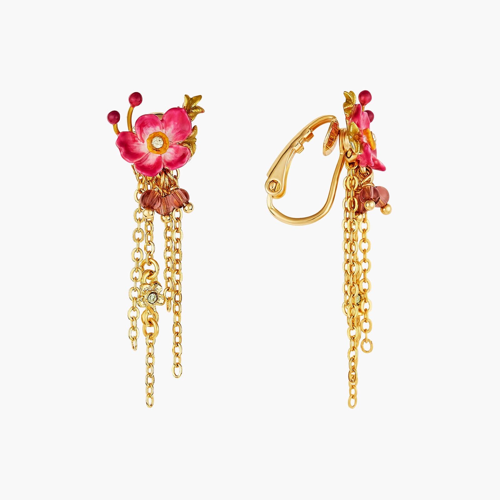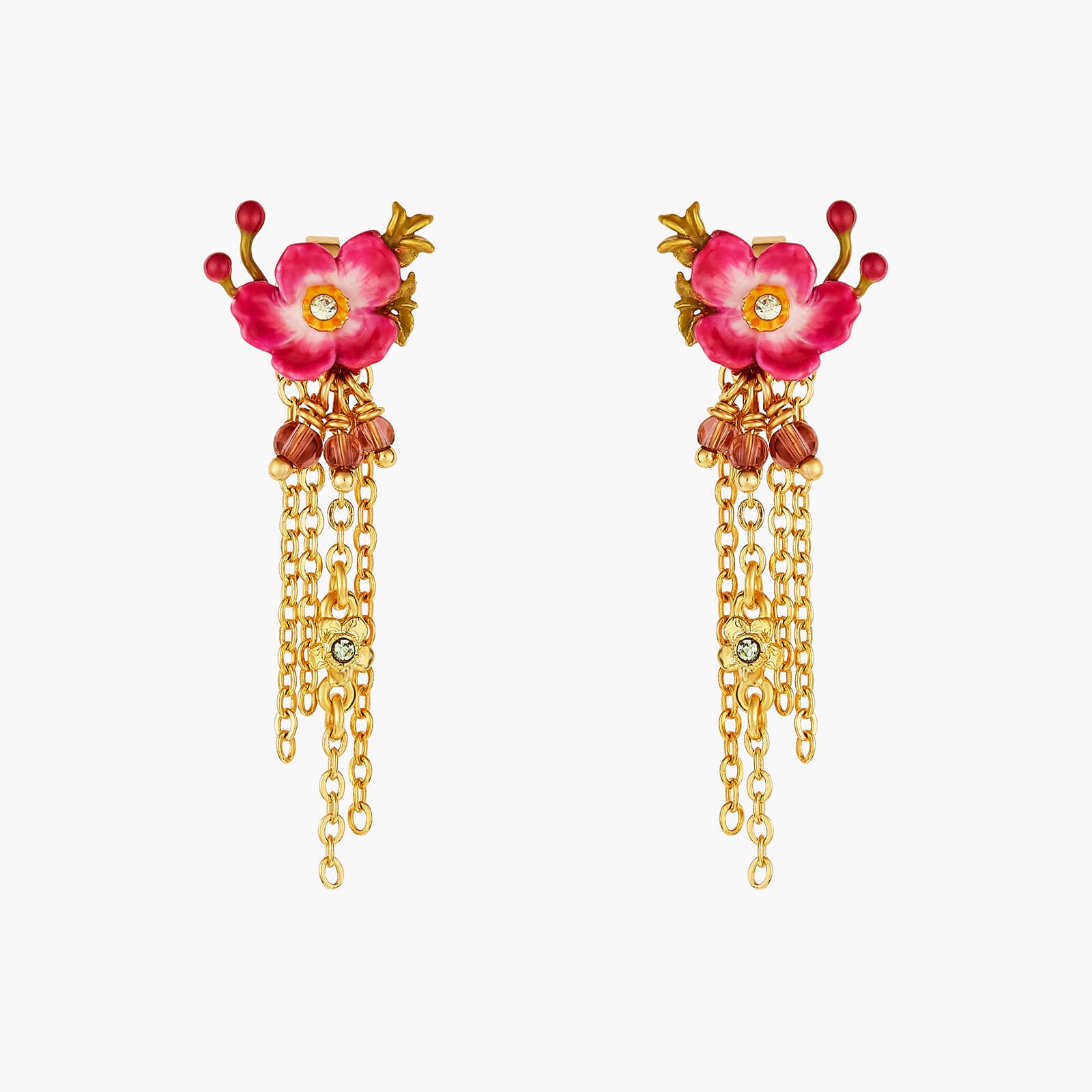 La Maison Les Néréides offers a collection of fruit trees jewellery with these post earrings and enamelled pink orchard flowers with a bright cut crystal heart. This delicate women's ear jewellery from the Little Garden collection comes with thin gold chains on which small grapes made of purple glass beads are hanging.