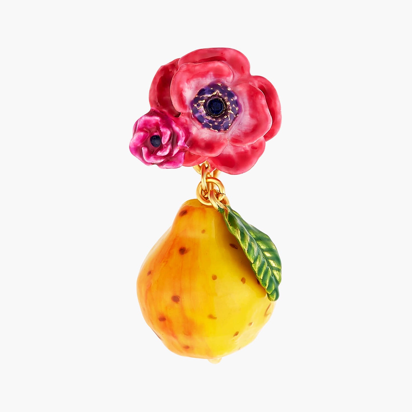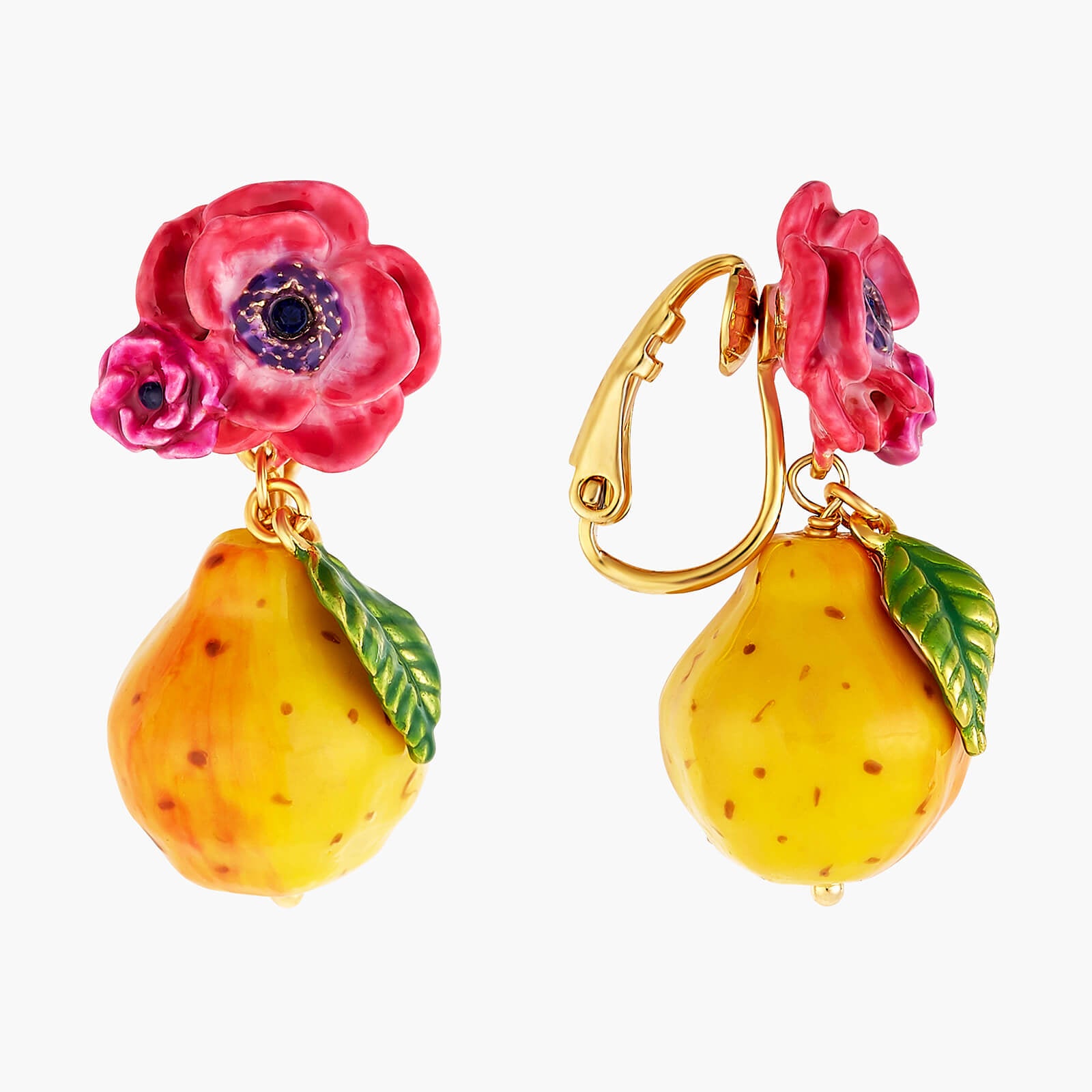 Handcrafted, each pear in this pair of clip on earrings is carefully painted and varnished in a yellow and red colour. Two crunchy fruits for earrings, paired with realistic pink poppy flowers to offer a feminine piece of jewellery from the Little Garden collection, signed by Les Néréides.