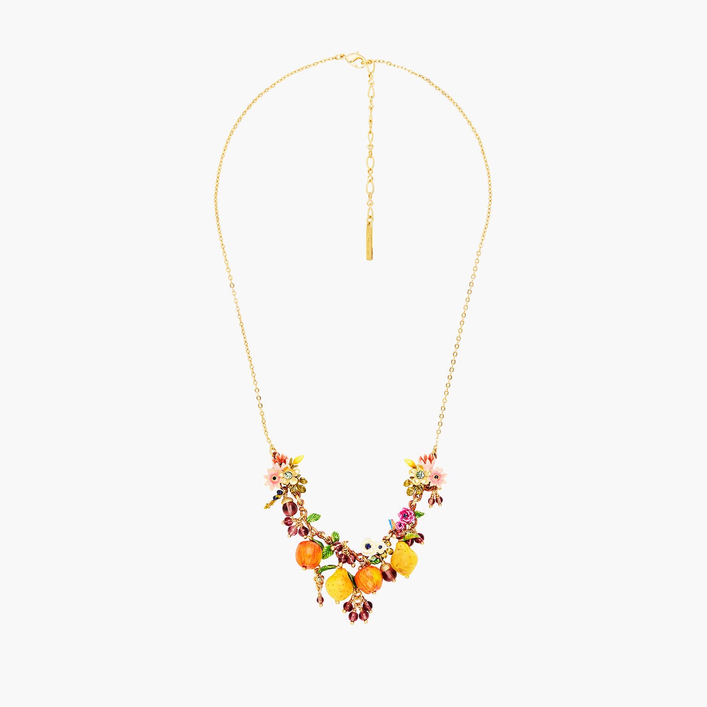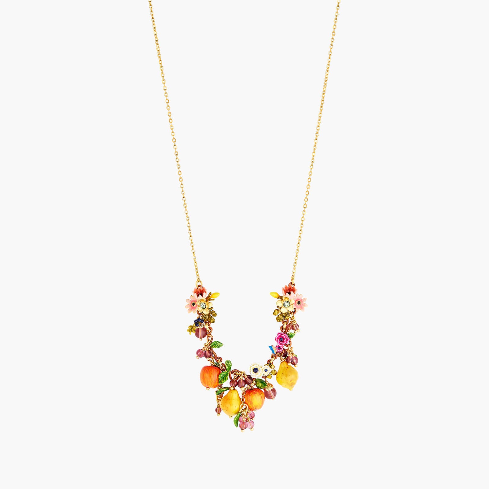 Necklace: Fine gold-plated jewellery, hand-enamelled country flowers, painted metal and resin fruits, faceted glass, cut crystals and glass beads