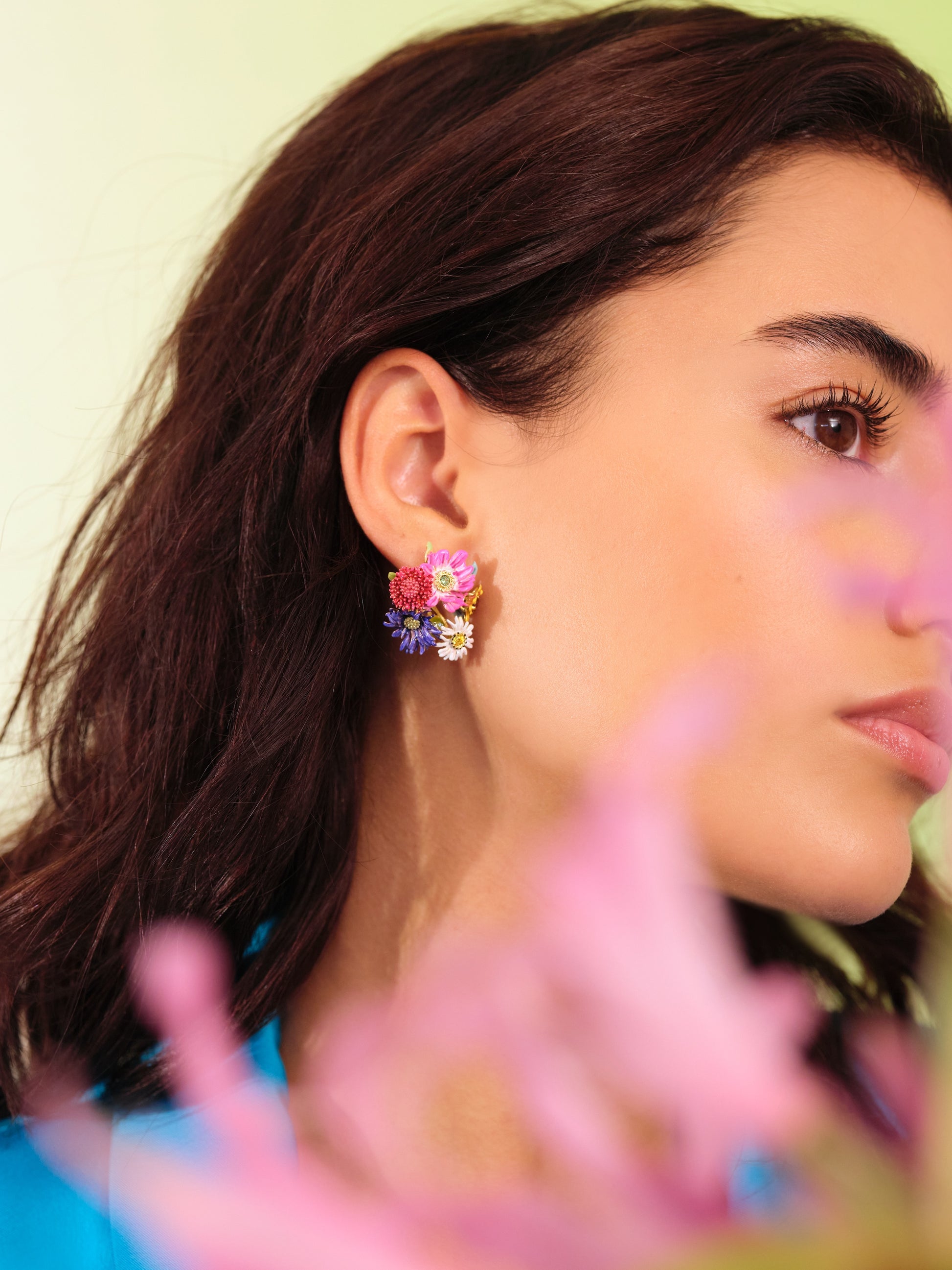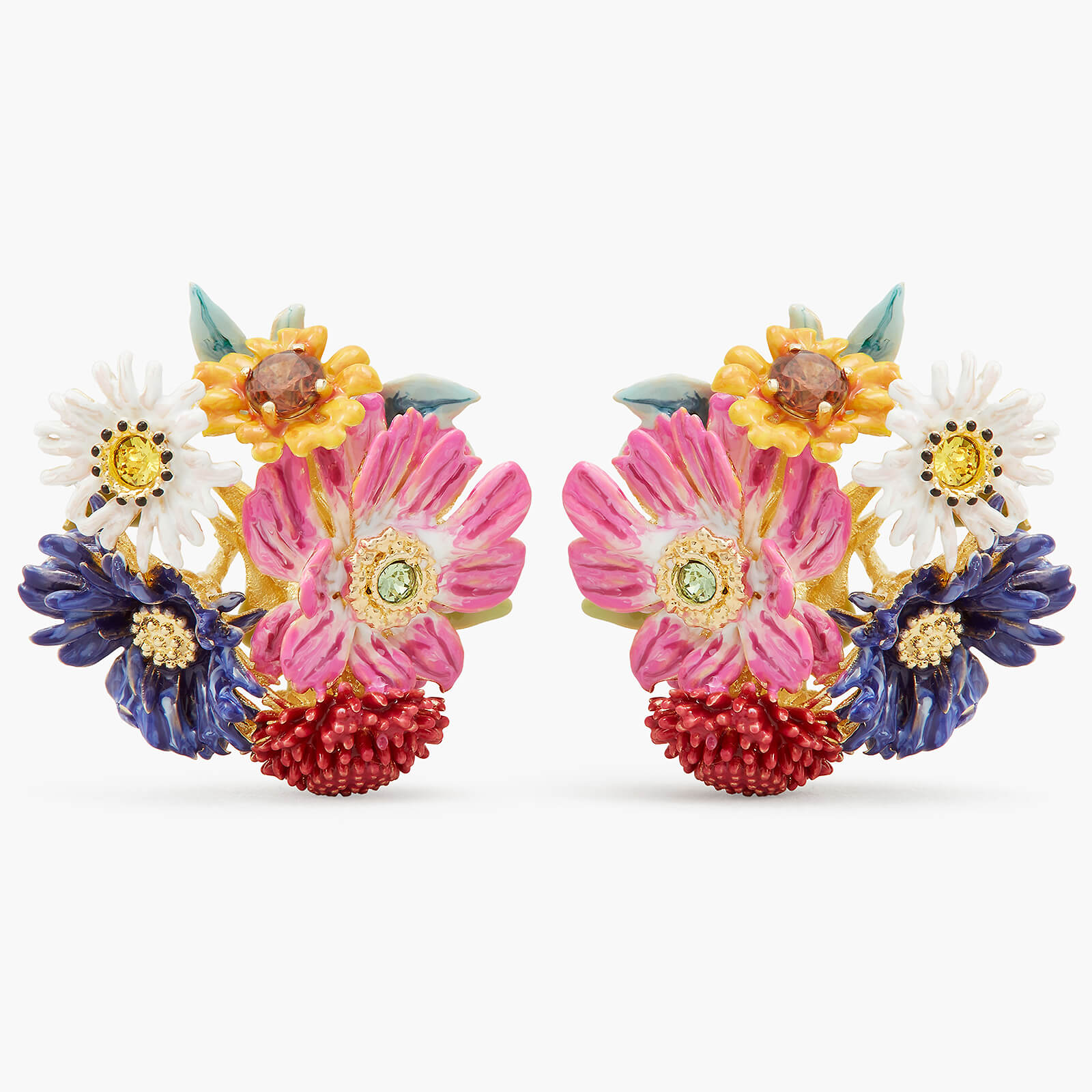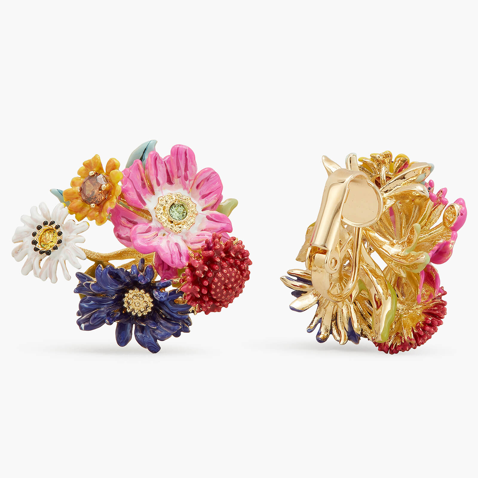 Indulge in the irresistible charm of the Wild Flower Bouquet Earrings by Les Néréides. This exquisite piece of jewellery for women features a stunning array of meadow flowers, including white daisies, yellow buttercups, and red dahlias. The 18k gold plated and hand enamelled brass, cut crystal composition adds a touch of luxury to your outfit. With a length of 2.7cm, width of 2.3cm, and depth of 2.1cm, these earrings are the perfect size to make a statement. Weighing only 15g, they are comfortable to wear all day long. These clip-on earrings are suitable for non-pierced ears. Pair them with the multicoloured prairie flowers statement necklace by La Maison Les Néréides to add a pop of colour to your ensemble.