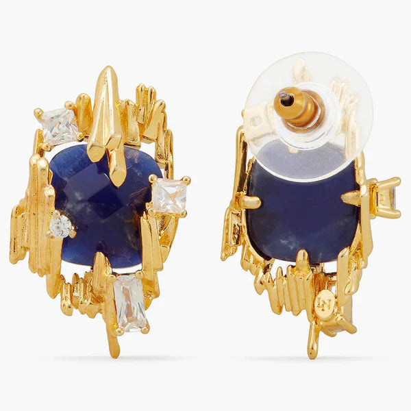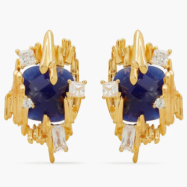 Introducing the Sodalite And Gold Rock Earrings by Les Nereides. Inspired by the sea's erosion, these clip-on earrings feature steep lines and a stunning deep blue sodalite stone. Adorned with cubic zirconia, this refined jewel takes you on a journey to the Mediterranean waters of Sicily, adding a touch of elegance to your outfits. Crafted with gilded brass, sodalite stone, and cubic zirconia, these earrings measure 2.65cm in length, 1.6cm in width, and 6.2cm in depth, weighing 6g. Elevate your style with Les Nereides.