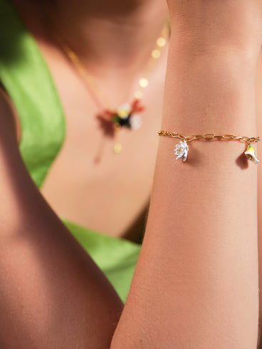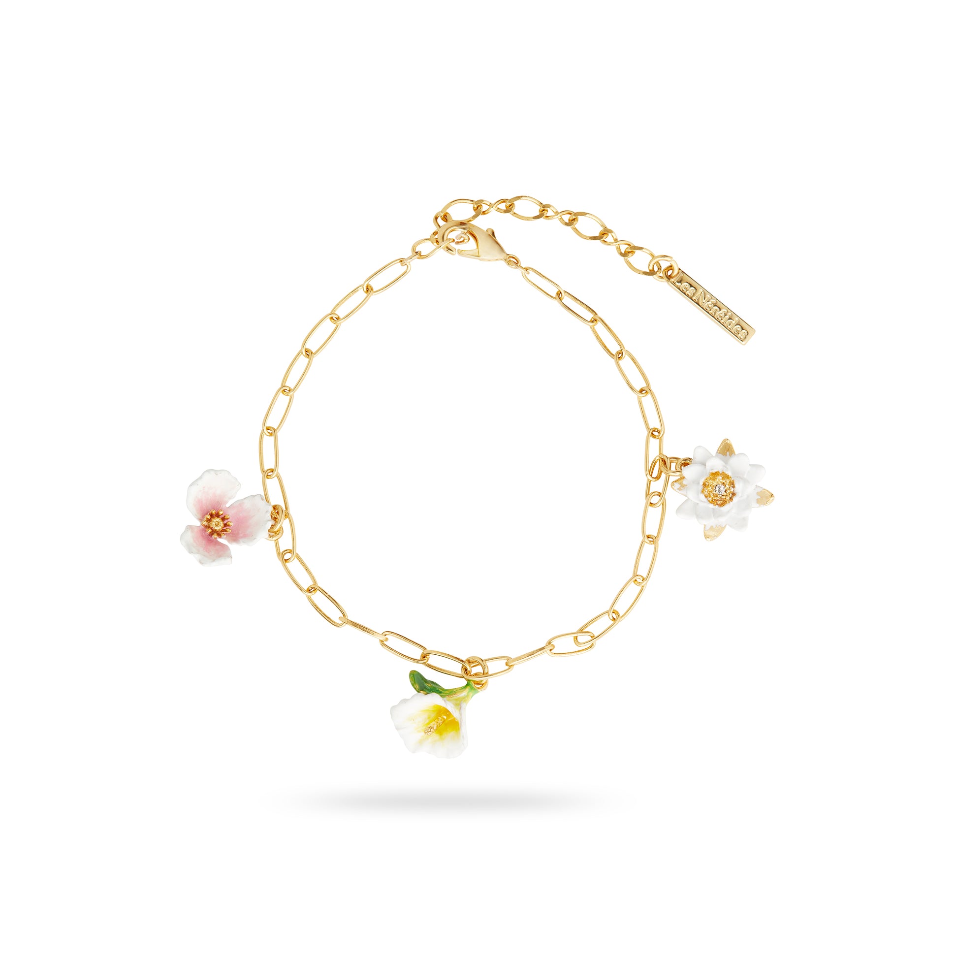 Indulge in the beauty of the Water Garden collection with this exquisite Gold-Plated Links and Flower Pendant Bracelet. Featuring three charming hand-painted flower charms - a water lily, a Calla, and a pink flower - this bracelet exudes a poetic touch that will leave you spellbound. Inspired by Claude Monet's paintings, Water Lilies, this bracelet is a true masterpiece. Crafted from gilded and hand-enameled brass, and adorned with a lapis lazuli bead, this bracelet is a true symbol of luxury. With a length of 15.5cm and an extension of 3.5cm, this bracelet is perfect for any wrist size. Weighing only 4.72g, this bracelet is lightweight and comfortable to wear. Add a touch of elegance to your outfit with this stunning bracelet from Les Nereides.