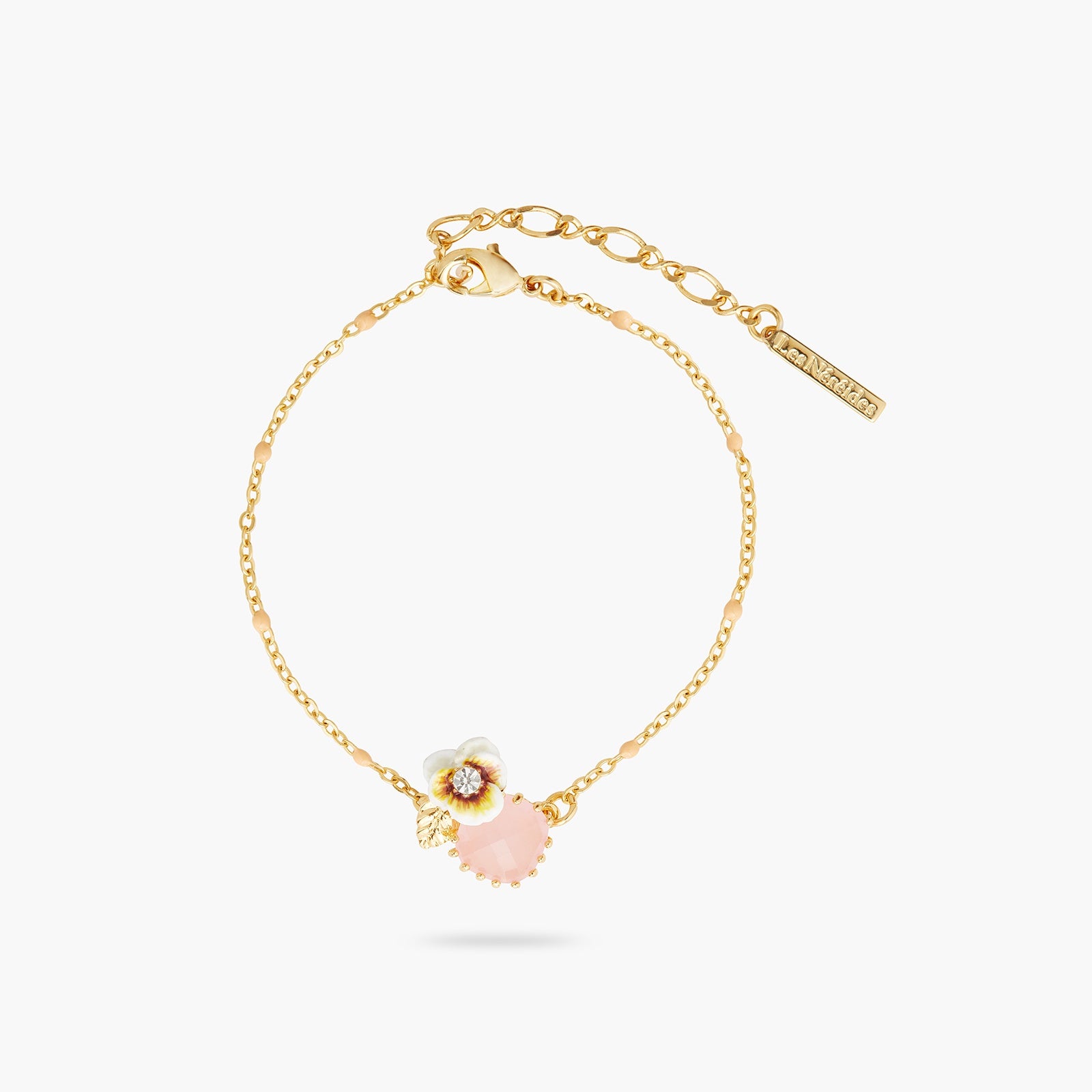 Discover this fine hand-enamelled pansy bracelet, from the collection Les Néréides Loves Animals. This jewel consists of white pansies resting on a pink stone. If you look closely at the jewel, you can see a bird. The bird is often associated with dreams and freedom. This elegant and minimalist piece of jewellery will go perfectly with the other costume jewellery of the season.