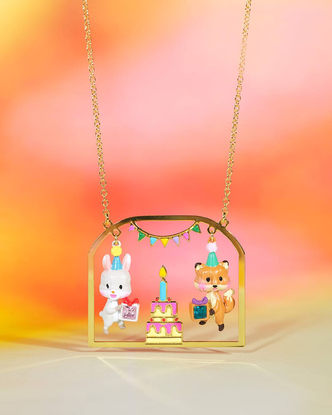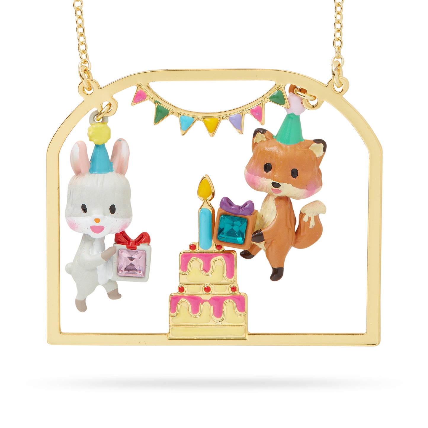 Introducing the Rabbit and Fox Pendant Necklace by Les Nereides. Join the birthday party at N2 and meet these adorable animals. This pendant necklace is a joyful piece of jewellery that will remind you of this memorable celebration. Made with gilded and hand-enamelled brass, and adorned with faceted crystal, it exudes elegance. With a length of 50cm and an extension of 5cm, it offers a perfect fit. The pendant's dimensions are 4.1cm in width and 1cm in depth, while weighing 20.5g. Embrace the charm of Les Nereides with this exquisite necklace.