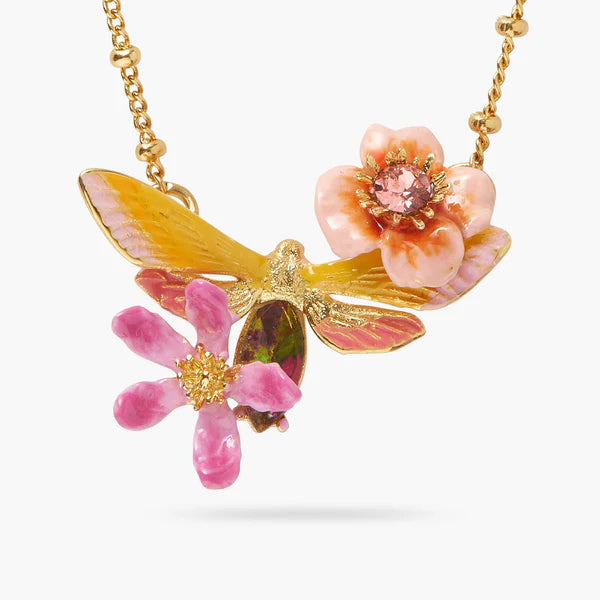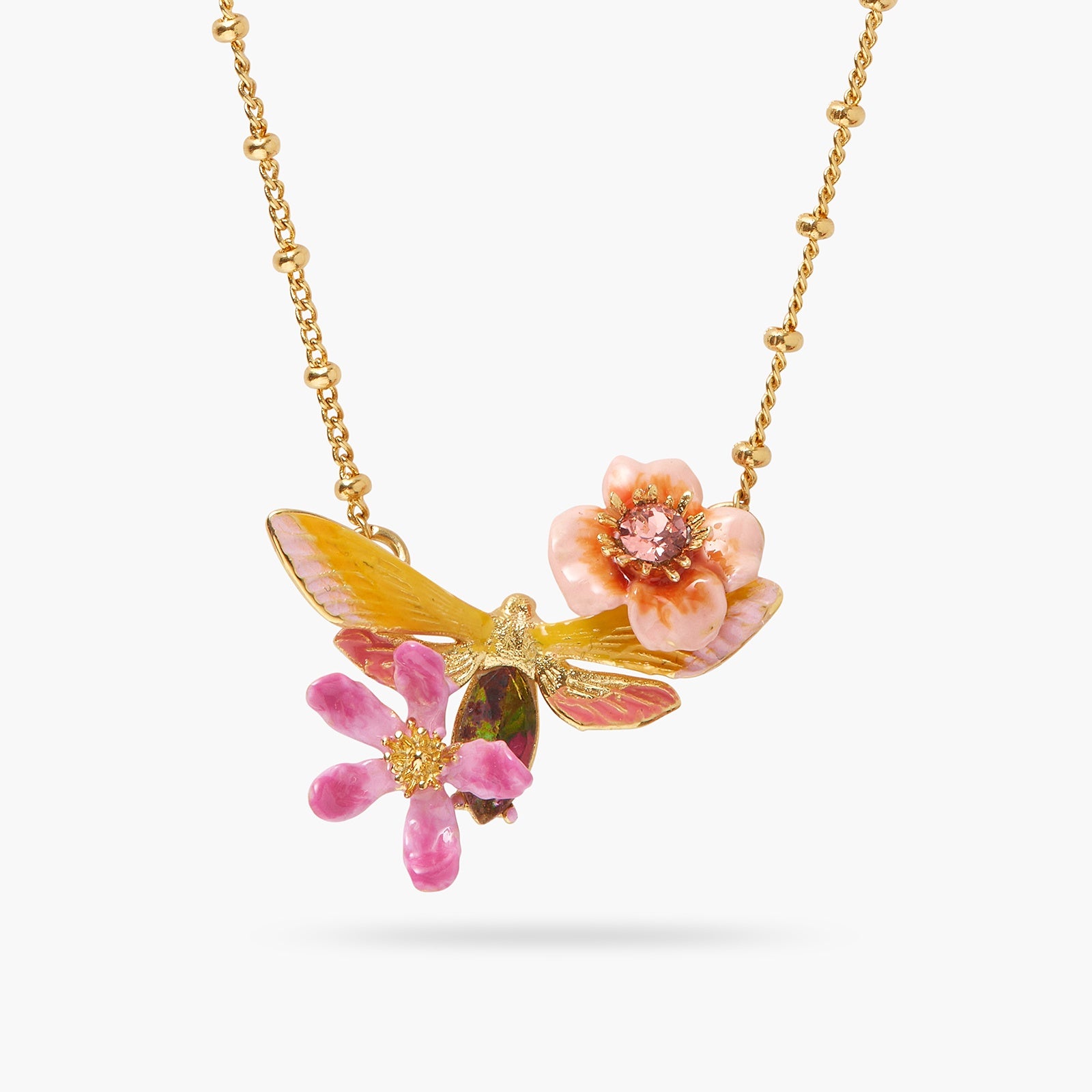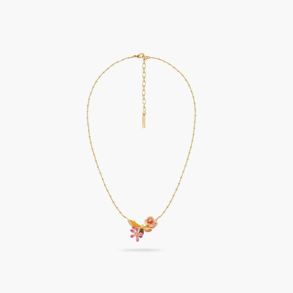 Elevate your style with the Vine Butterfly and Flower Pendant Necklace from Les Nereides' Vineyard in Tuscany collection. This exquisite piece features a yellow vine butterfly adorned with an iridescent crystal stone, complemented by a peach blossom and pink flower with cut crystals. Crafted from gilded and hand-enamelled brass, this necklace exudes luxury and sophistication. With a length of 40cm and an extension of 5cm, it sits perfectly on your neckline. The necklace is 1.9cm wide and 0.7cm deep, weighing 5.65g. Make a statement with this delicate and charming composition, perfect for any occasion. Shop now and add a touch of elegance to your jewelry collection.