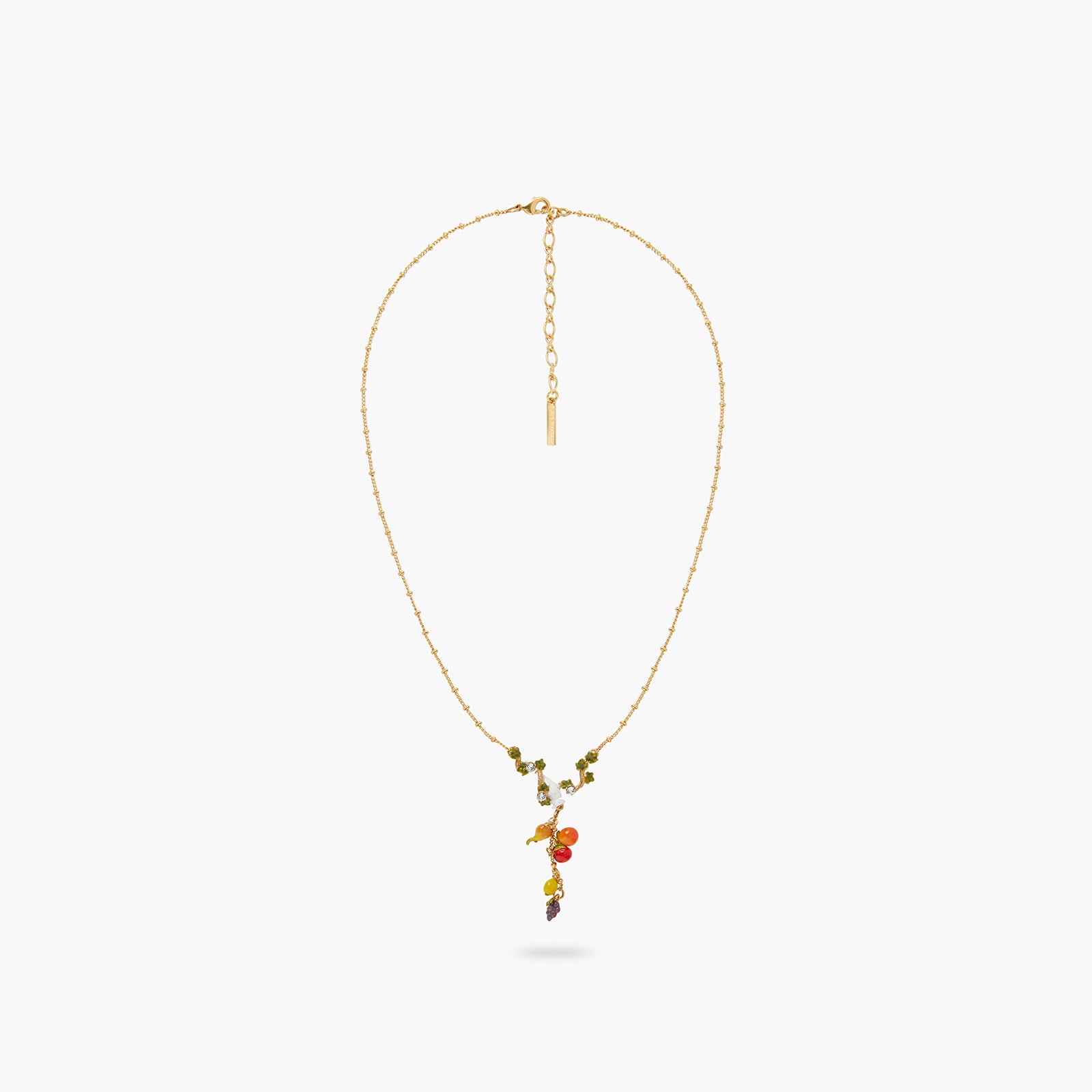 Indulge in the beauty of the Vineyard in Tuscany collection with the Amphora, Vine Leaves and Fruit Pendant Necklace. This exquisite piece showcases a white amphora from ancient times, suspended from a hand-enamelled green vine adorned with luscious fruits such as pears, peaches and grapes. The trendy necklace is perfect for dressing up your summer or autumn outfits, adding a touch of elegance and uniqueness to your look. Crafted from gilded and hand-enamelled brass and cut crystal, this necklace is a true masterpiece. With a length of 40cm and an extension of 5cm, it is the perfect size to complement any neckline. Weighing only 9.65g, it is lightweight and comfortable to wear all day long.