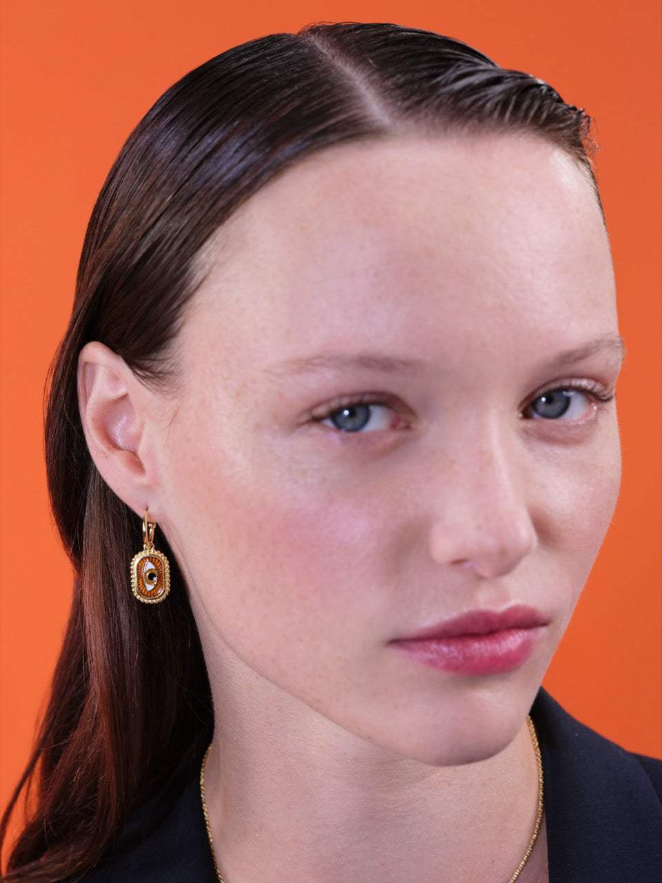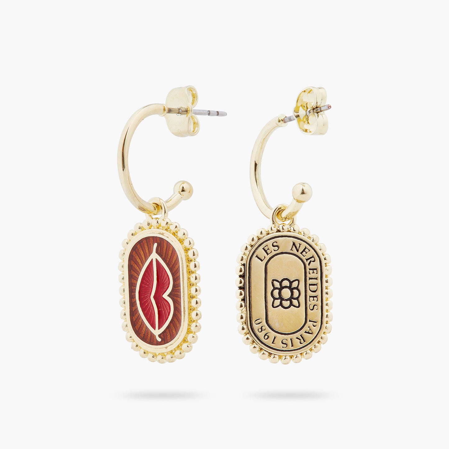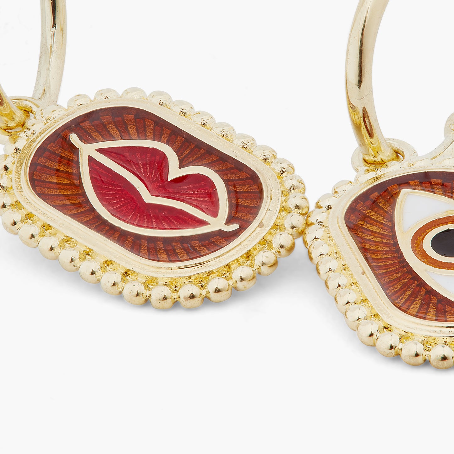 Introducing the Divine Protection Asymmetrical Earrings from Les Nereides' Art of Divination collection. These hoop earrings feature two distinct charms, each with its own unique meaning. One earring showcases an oval-shaped amulet with the evil eye, symbolizing divine omniscience and protective authority. The other charm features a mouth with red lips, an invitation to love and romance. These minimalist earrings are perfect for any occasion, adding a touch of uniqueness to your outfit. Crafted from gold-plated brass and hand-enamelled with a beaded contour, these earrings are truly one-of-a-kind. Measuring 2cm in length and 14cm in width, with a weight of 5.2g, these earrings are a must-have for any fashion-forward individual. Please note that stud, hook, and sleeper earrings cannot be exchanged or returned for hygiene reasons. Shop now and experience the divine protection of Les Nereides.