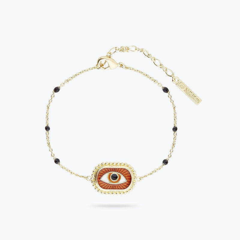 Discover the Art of Divination collection by Les Néréides, where the evil eye is reimagined in a fine bracelet. The natural oval shape of the eye is preserved to add a human touch, while warm tones replace the traditional blue color. The ochre hue of this divine protection brings comfort to the wearer and those around them. Pair this thin bracelet with the asymmetrical divine protection earrings from the same collection for a complete look. Crafted from gold-plated brass and hand-enamelled, this bracelet features a beaded contour. With a length of 15.5cm and an extension of 4cm, it weighs only 3.2g. Add a touch of mystique to your jewelry collection with this exquisite piece from Les Néréides.