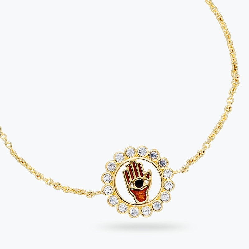 Introducing the exquisite Hamsa Fine Bracelet from Les Nereides' Art of Divination collection. The round shape on a pristine white background, adorned with a beaded contour, exudes the opulence of the great Houses where attention to detail is paramount. The Hamsa, turned upwards, symbolizes protection and benevolence. Paired with the matching earrings, this jewelry set is a testament to elegance and refinement. Crafted from gold-plated brass, hand-enamelled, and embellished with faceted crystals, this thin bracelet is a true work of art. With a length of 15.5cm and an extension of 4cm, it is designed to fit most wrist sizes. Weighing only 4.4g, it is lightweight and comfortable to wear. Add a touch of luxury to your outfit with the Hamsa Fine Bracelet.