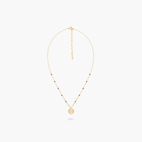 Indulge in the exquisite beauty of Les Nereides' Colorama collection with this stunning Yellow Round Stone Pendant Necklace. The sparkling amber stone is the centerpiece of this high-end costume jewellery, making it the perfect accessory to elevate any outfit. The gold-plated chain, adorned with red enamel dots, creates a chic and modern contrast, resulting in a truly exceptional piece of jewellery. For a complete look, pair it with the thin yellow round stone bracelet or the round and square stone earrings to create a matching jewellery set. With a length of 40cm and an extension of 5cm, this necklace is the perfect length to accentuate your neckline. Weighing only 3.6g, it is lightweight and comfortable to wear all day long.