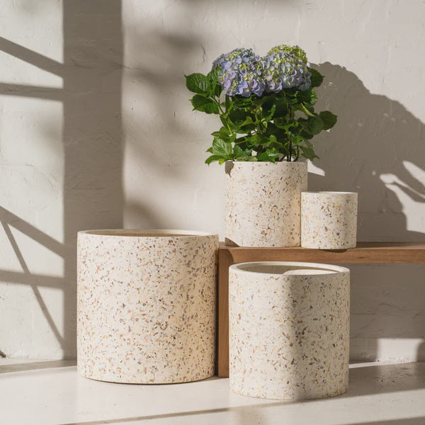 These light weight pots are made using a fibrestone base, with a natural shell surface. Light weight with a beautiful textural finish. Indoor/outdoor use with drainage hole. Handmade in Vietnam.