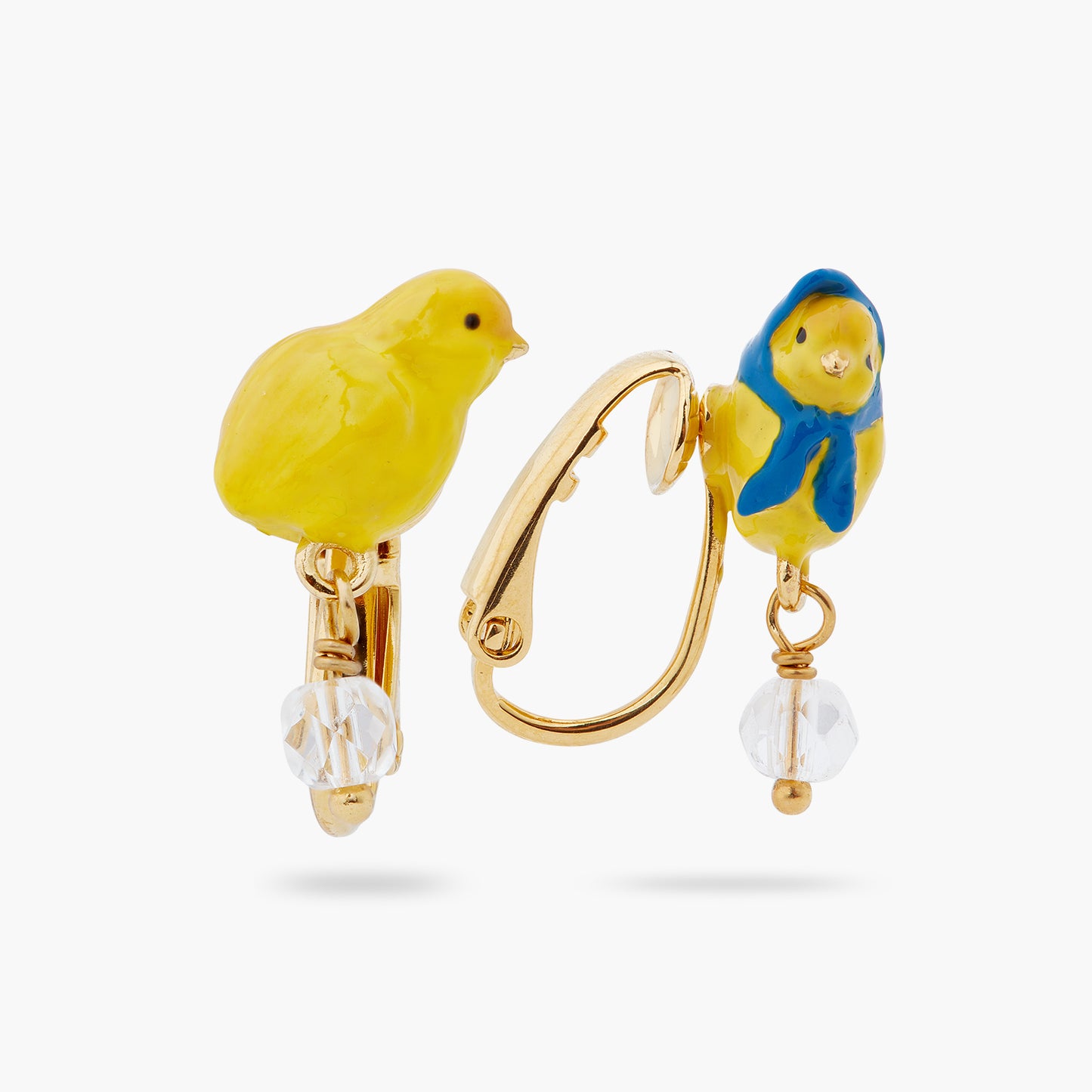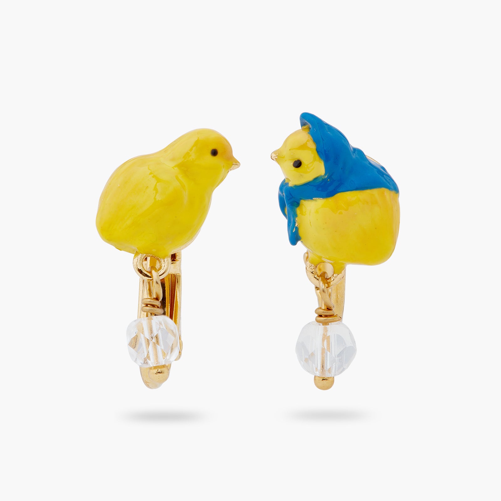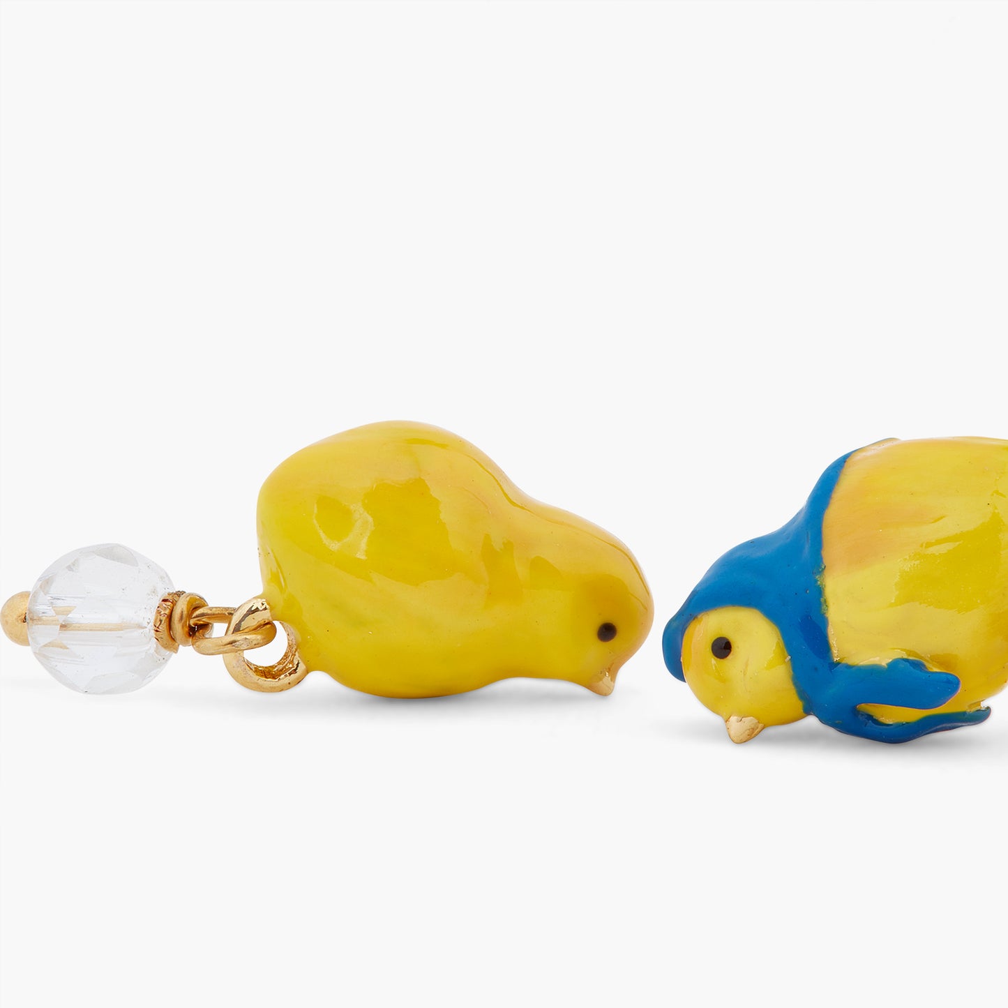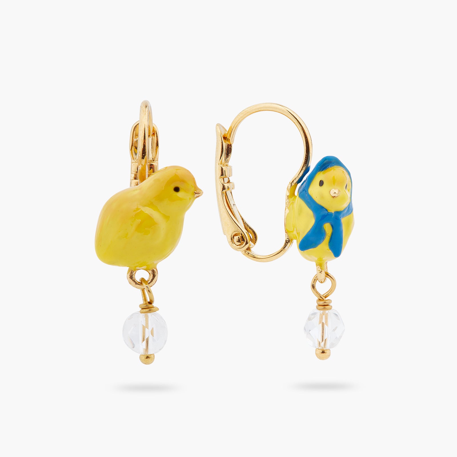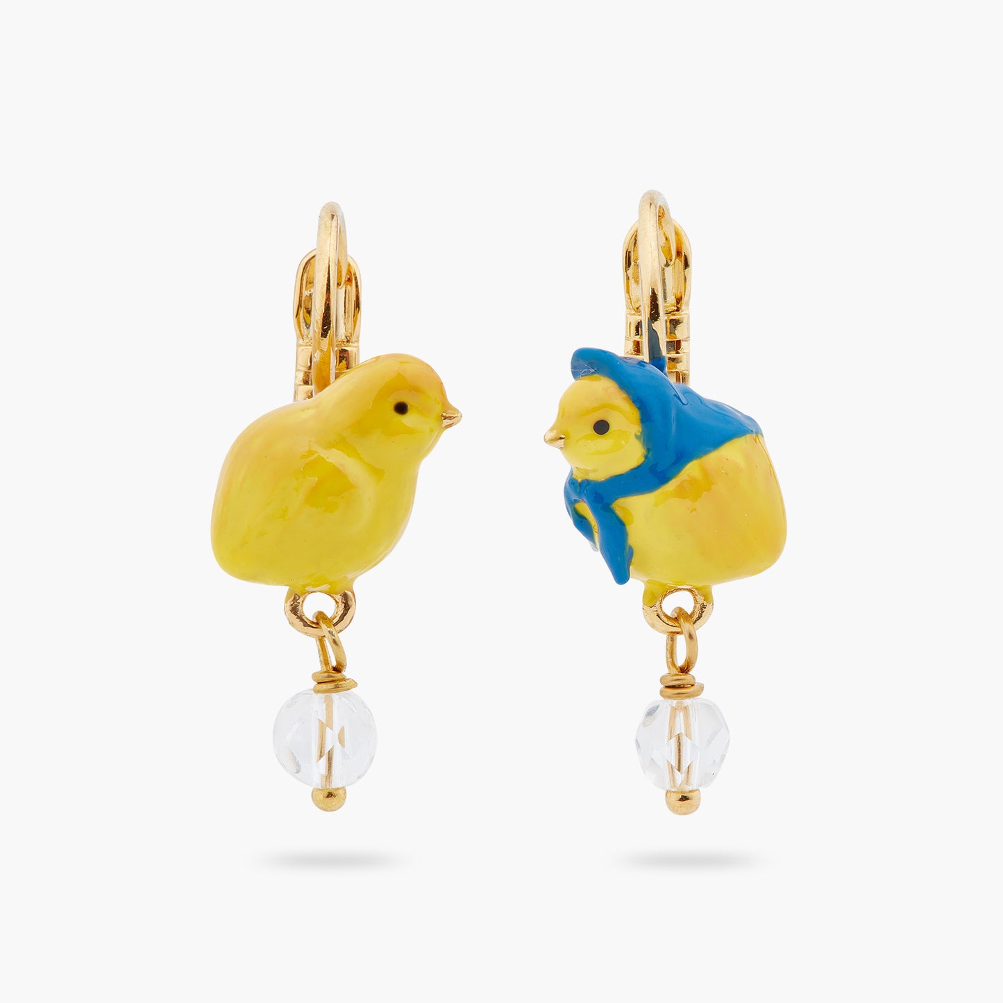 These asymmetrical earrings feature two small Easter chicks with a faceted crystal bead hanging underneath. One of the chicks differs from the other in that it has a retro look. It wears a blue bandana in the shape of a triangle on its head, like a headband. This detail makes these earrings a unique and original piece of designer jewellery.