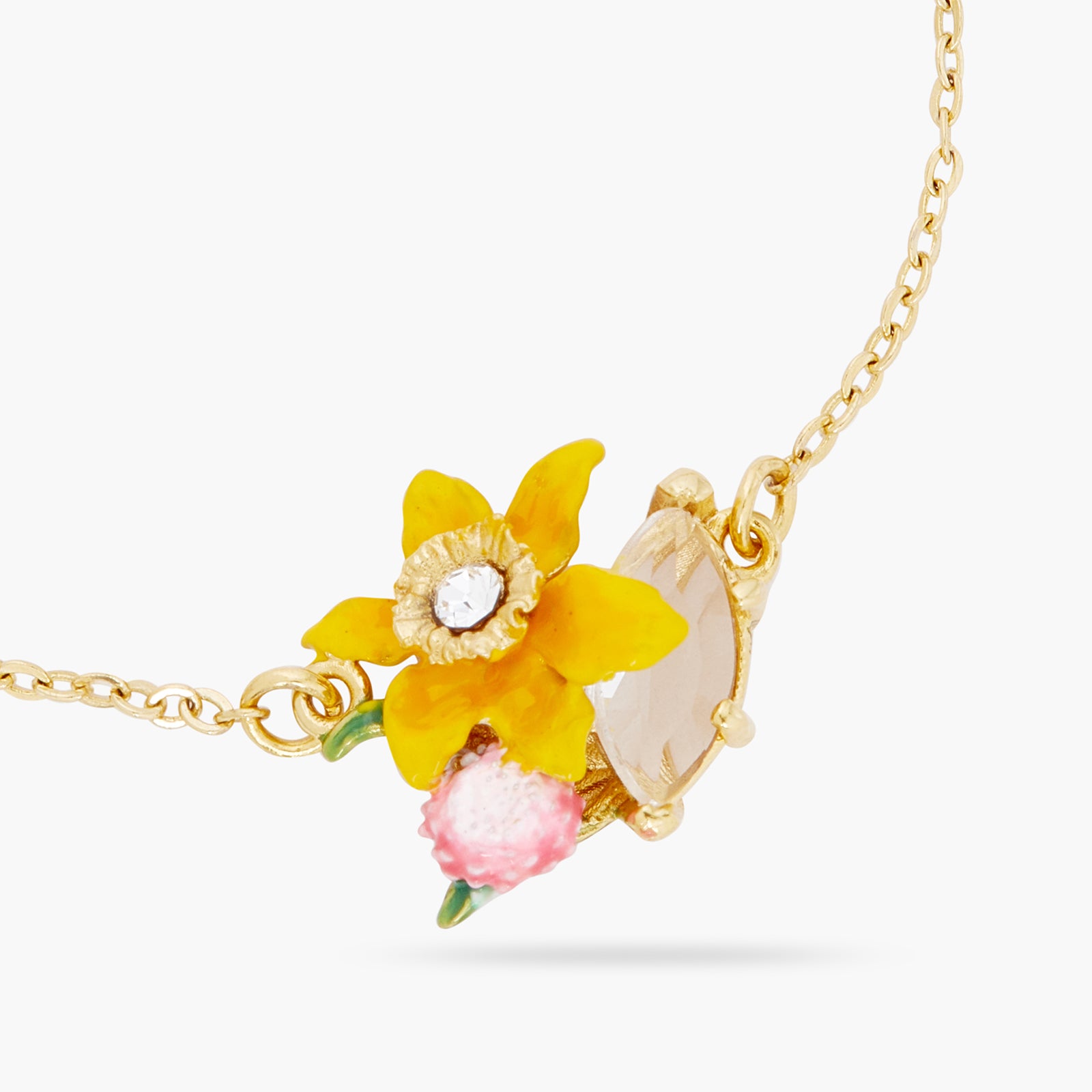 Introducing the Daffodil Thin Bracelet, a delicate piece that pays homage to the first flower of spring. This bracelet features a stunning crystal stone and a small pink thistle, capturing the wild and ephemeral nature of the daffodil. Not only is the daffodil a symbol of new beginnings, but it has also become a symbol of love and support in the fight against cancer. By wearing this jewel, you are not only celebrating the beauty of the daffodil, but also embodying its values. With a length of 15.5cm and an extension of 3.5cm, this bracelet is the perfect addition to any jewelry collection. Weighing only 3.15g, it is both lightweight and comfortable to wear. Add a touch of spring to your wardrobe with the Daffodil Thin Bracelet from Les Nereides.