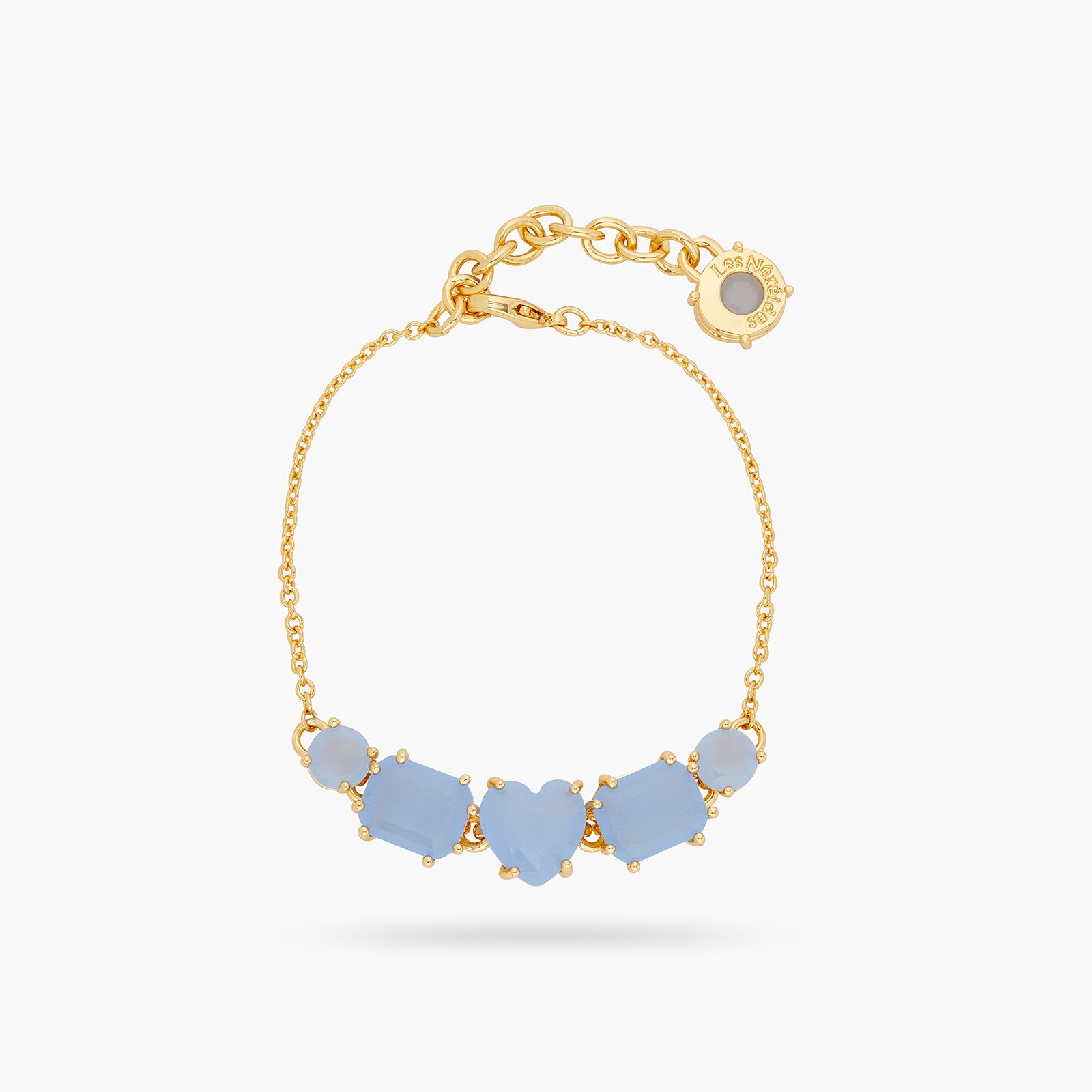 Introducing the Les Nereides Sky Blue Diamantine 5 Stone Fine Bracelet | ARLD2141. Elevate your style with this exquisite bracelet adorned with delicate sky-blue Diamantine stones. Crafted with precision, this designer jewellery piece features a geometric sequence of small hand-cut stones. For a chic baroque look, pair it with the 9-stone necklace. Made with high-quality materials including gold-plated brass and faceted crystal, this thin bracelet offers a length of 15.5cm with a 3cm extension. With a width of 1.03cm and a depth of 0.7cm, it weighs 7.7g. Experience luxury with Les Nereides.
