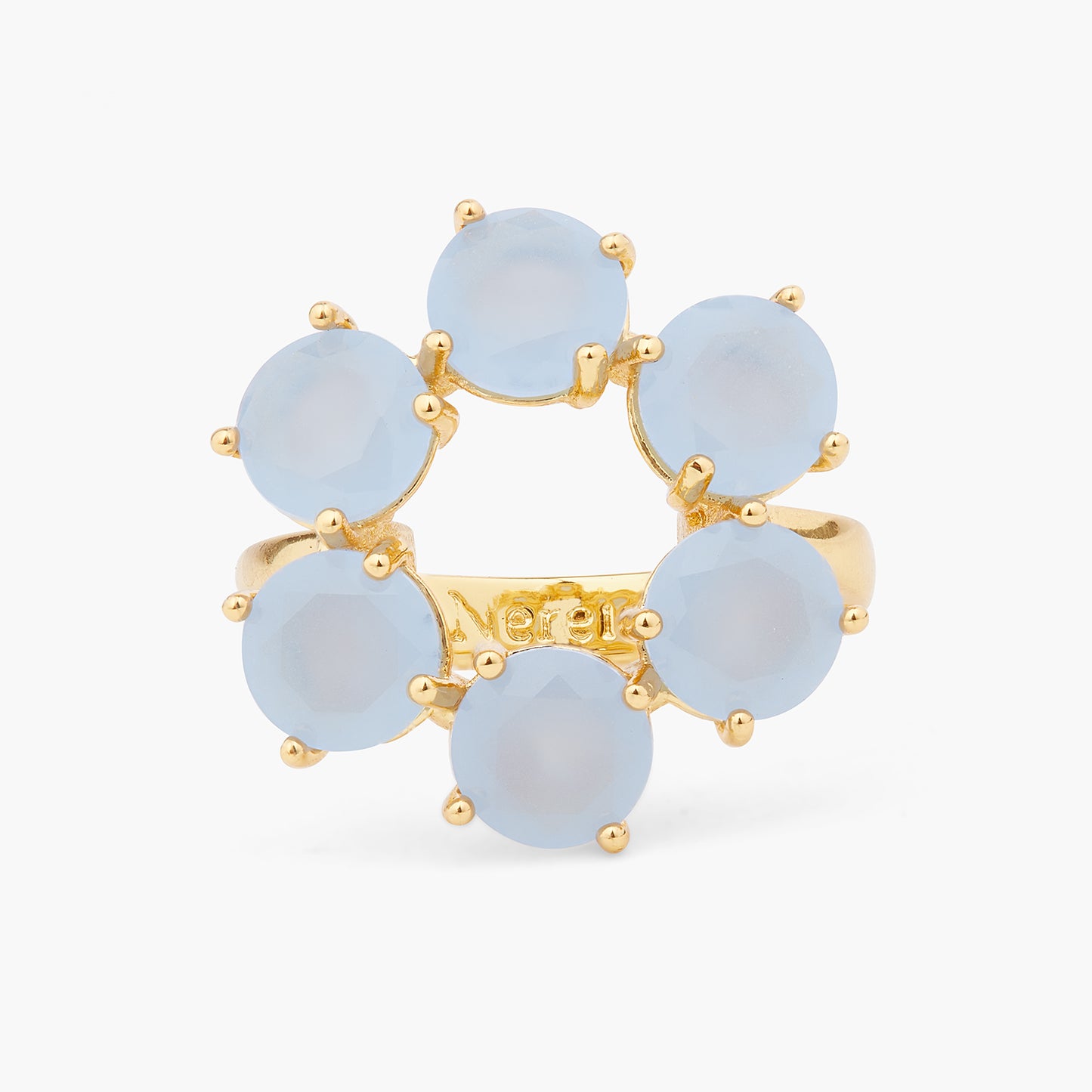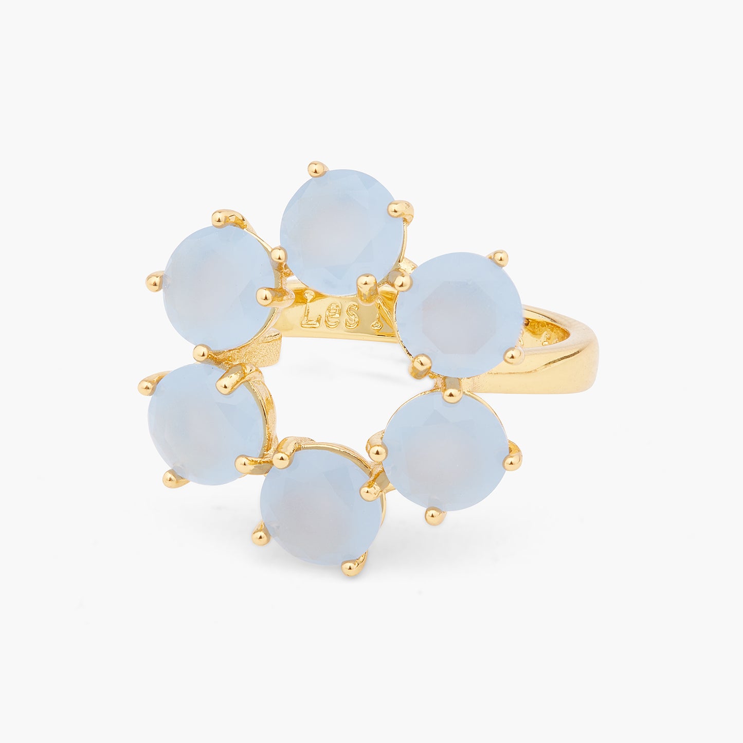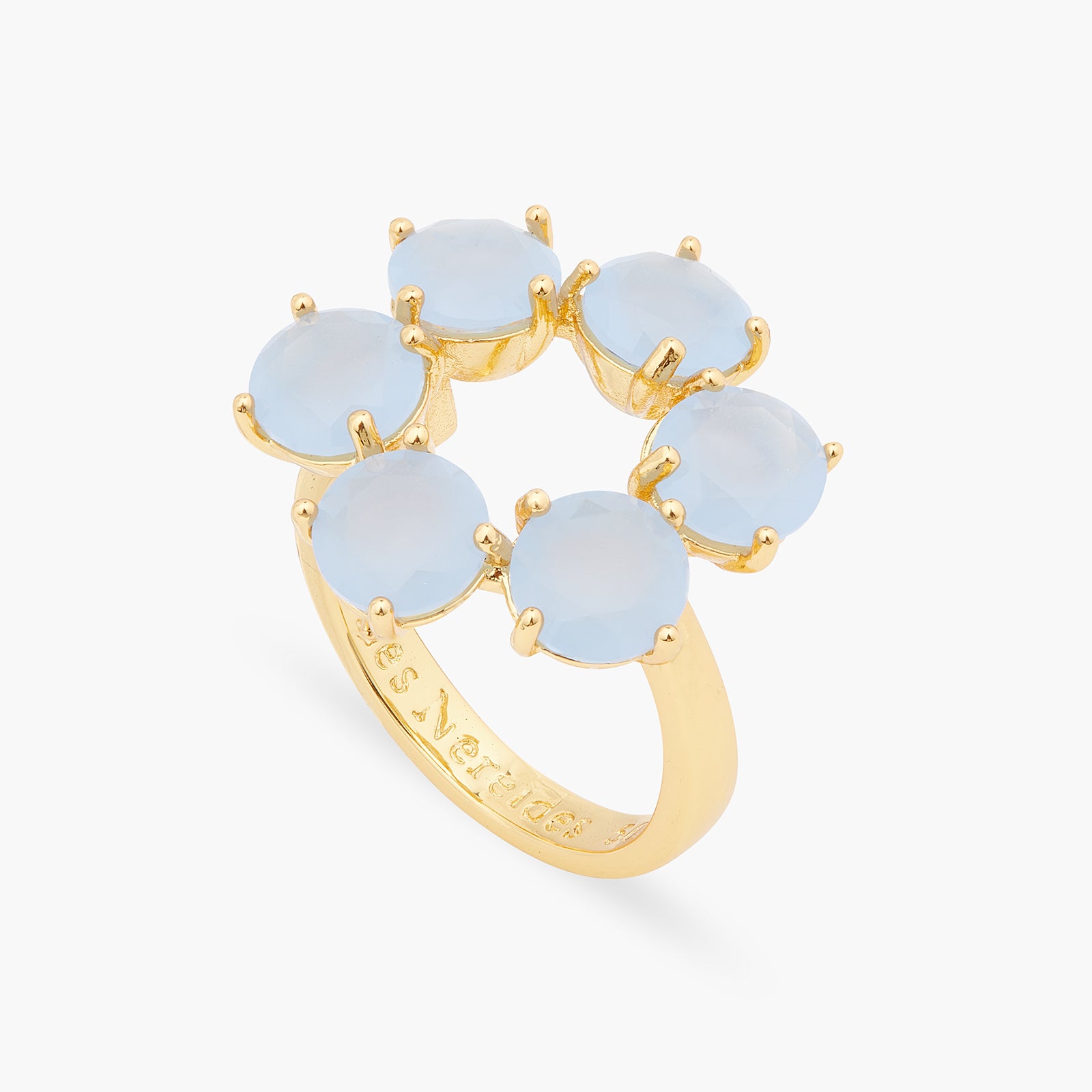 Introducing the Sky Blue Diamantine 6 Stone Fine Ring by Les Nereides. This boho chic statement piece features sky blue crystal stones that will surely catch everyone's attention. Complete the look by pairing it with the Diamantine sky blue 6-stone post earrings. Crafted with gold-plated brass and faceted crystal, this thin ring measures 2.2cm in length, 2cm in width, and 2cm in depth. It weighs 4.5g, making it comfortable to wear all day. Elevate your style with Les Nereides' exquisite jewellery.