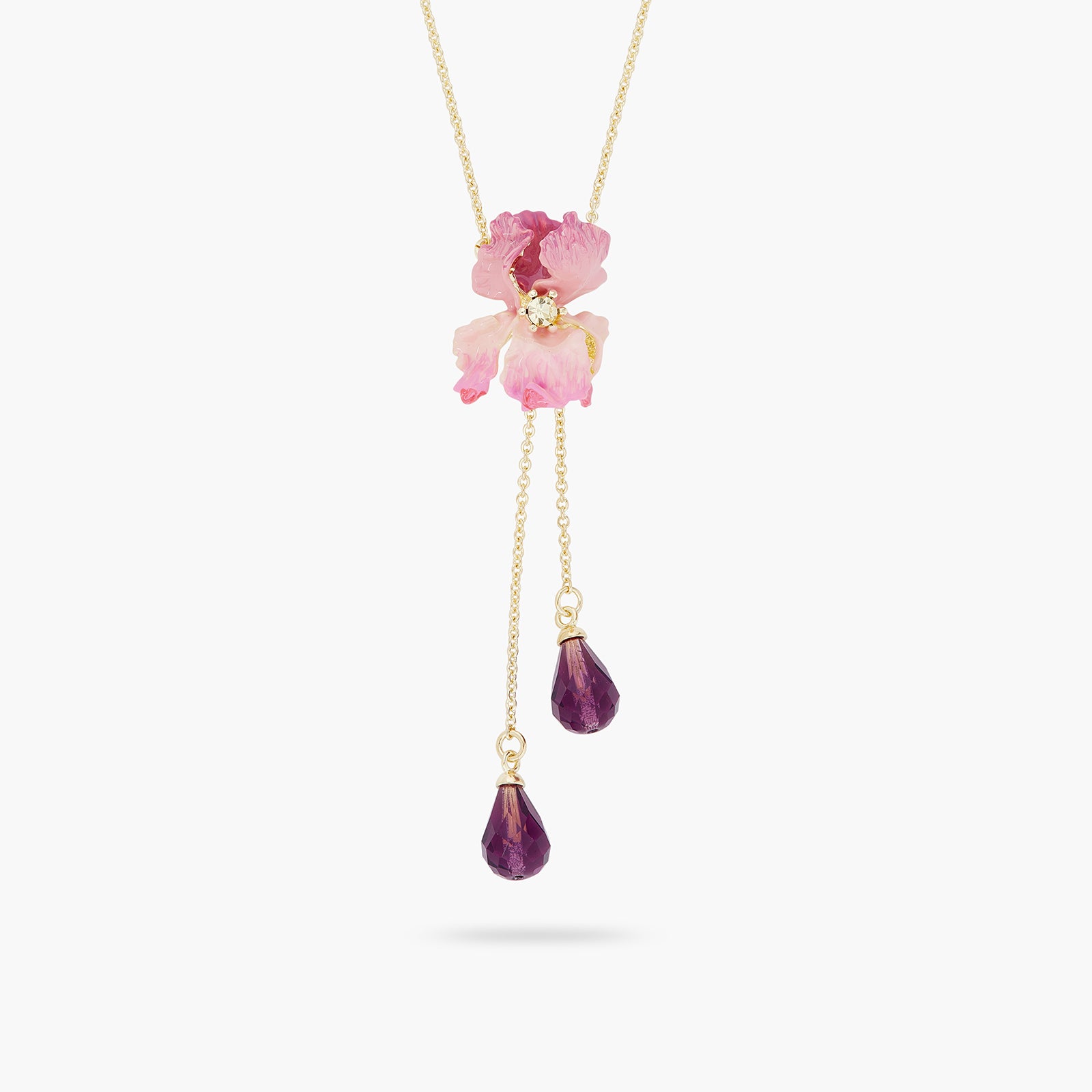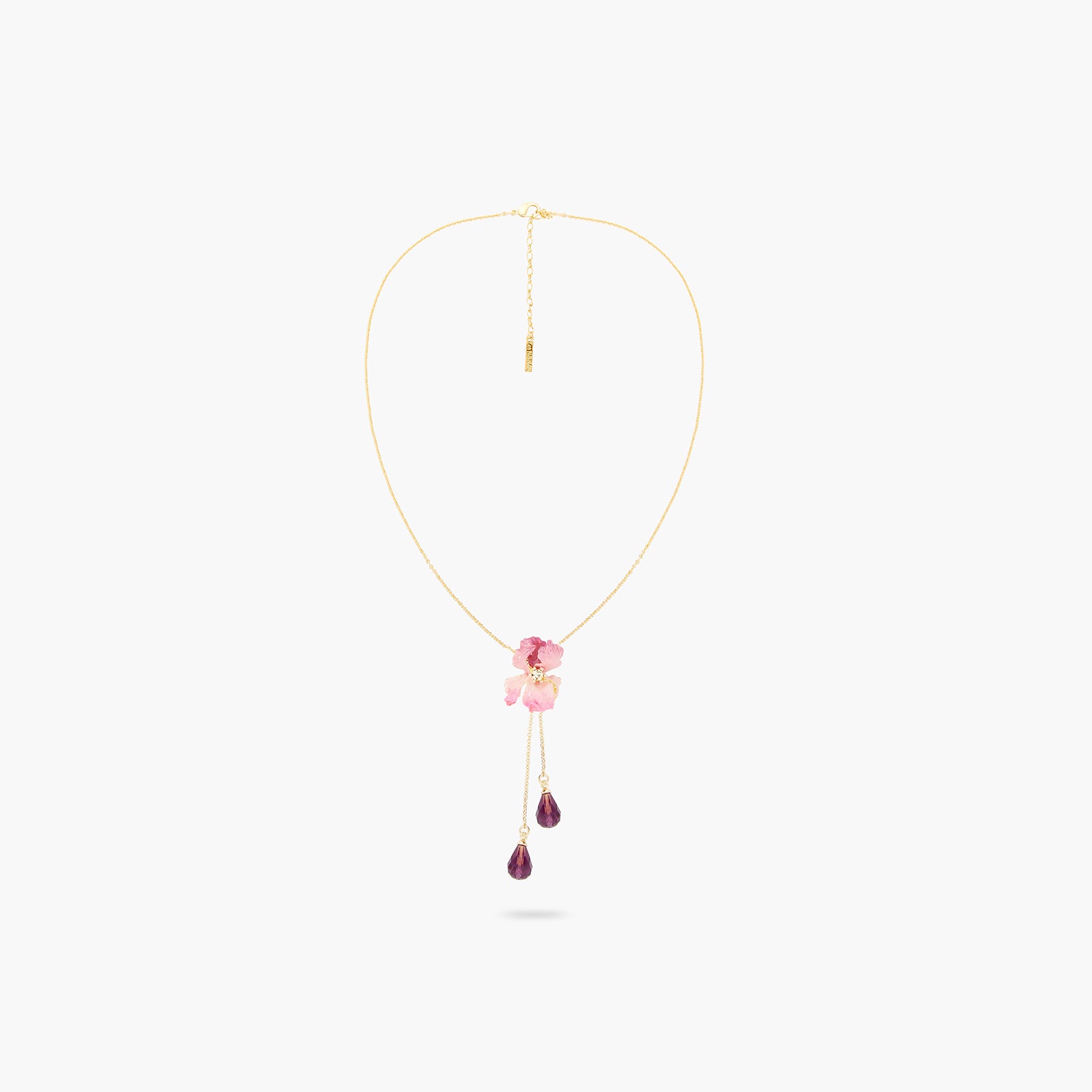 Indulge in the exquisite beauty of Les Nereides' Satin Petals collection with the Bearded Iris Pendant Necklace. Delicately crafted with hand-enamelled petals and faceted crystals, this necklace features a stunning Bearded Iris flower with a sparkling crystal at its center. The undulating petals of the flower add a touch of elegance to the necklace, making it a perfect accessory for any occasion. With a length of 40cm and an extension of 5cm, this necklace is designed to fit comfortably around your neck. The necklace weighs only 9g, making it lightweight and easy to wear. Add a touch of sophistication to your outfit with this stunning piece of jewelry.